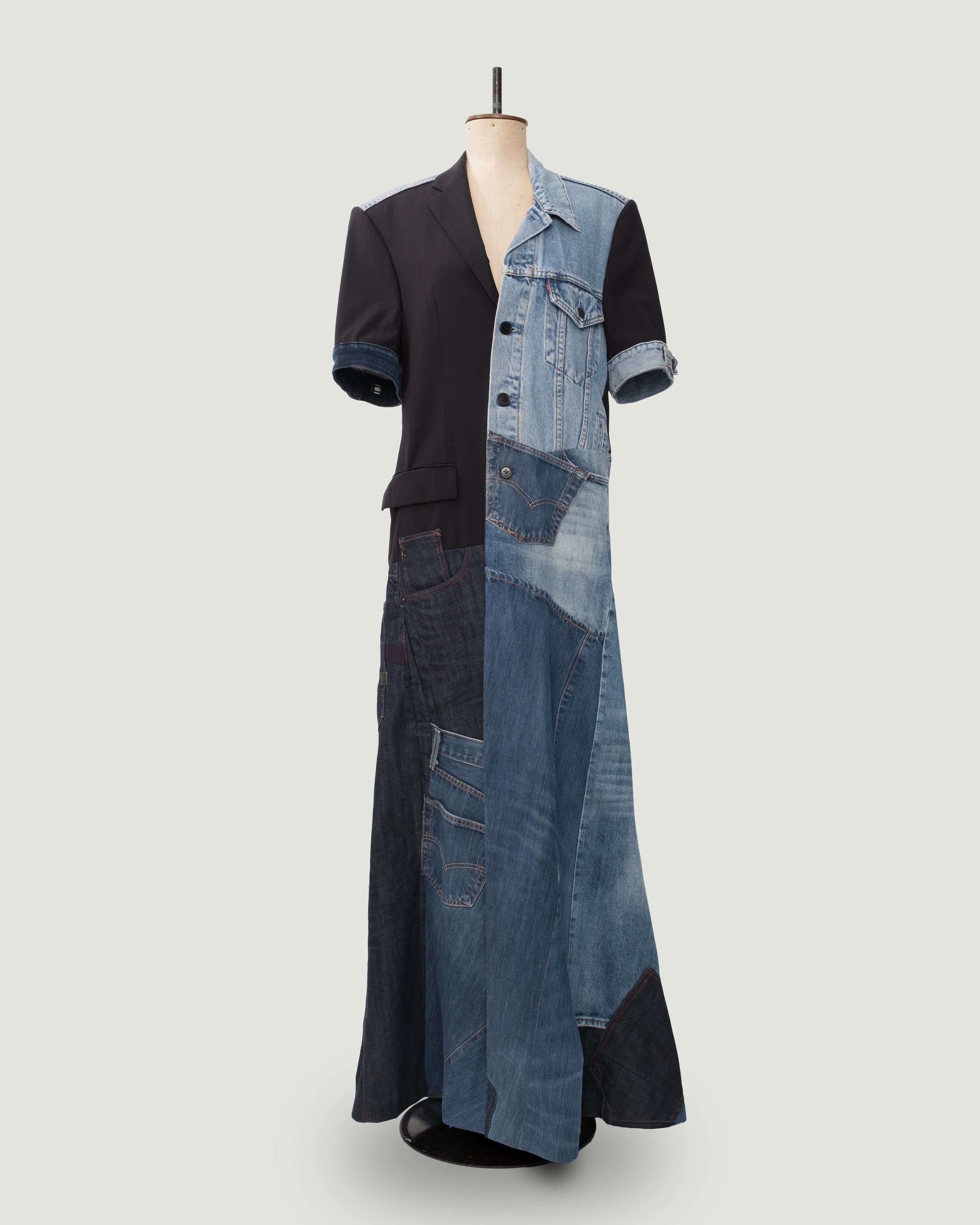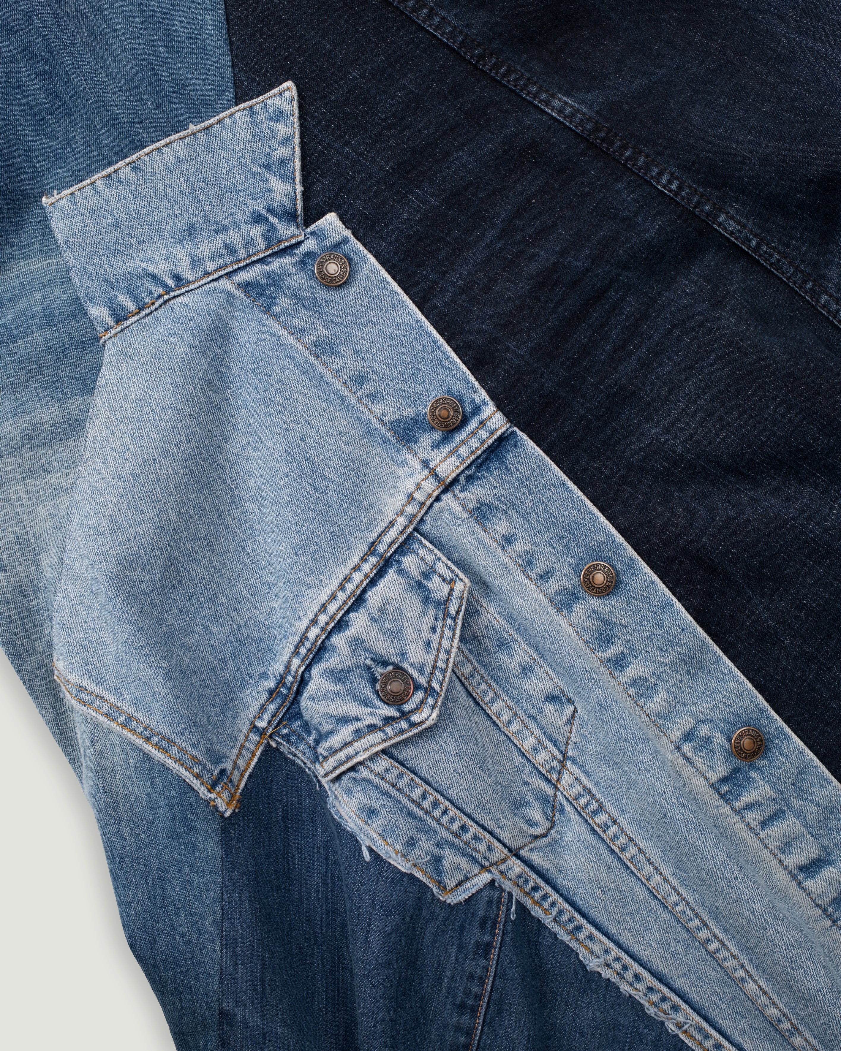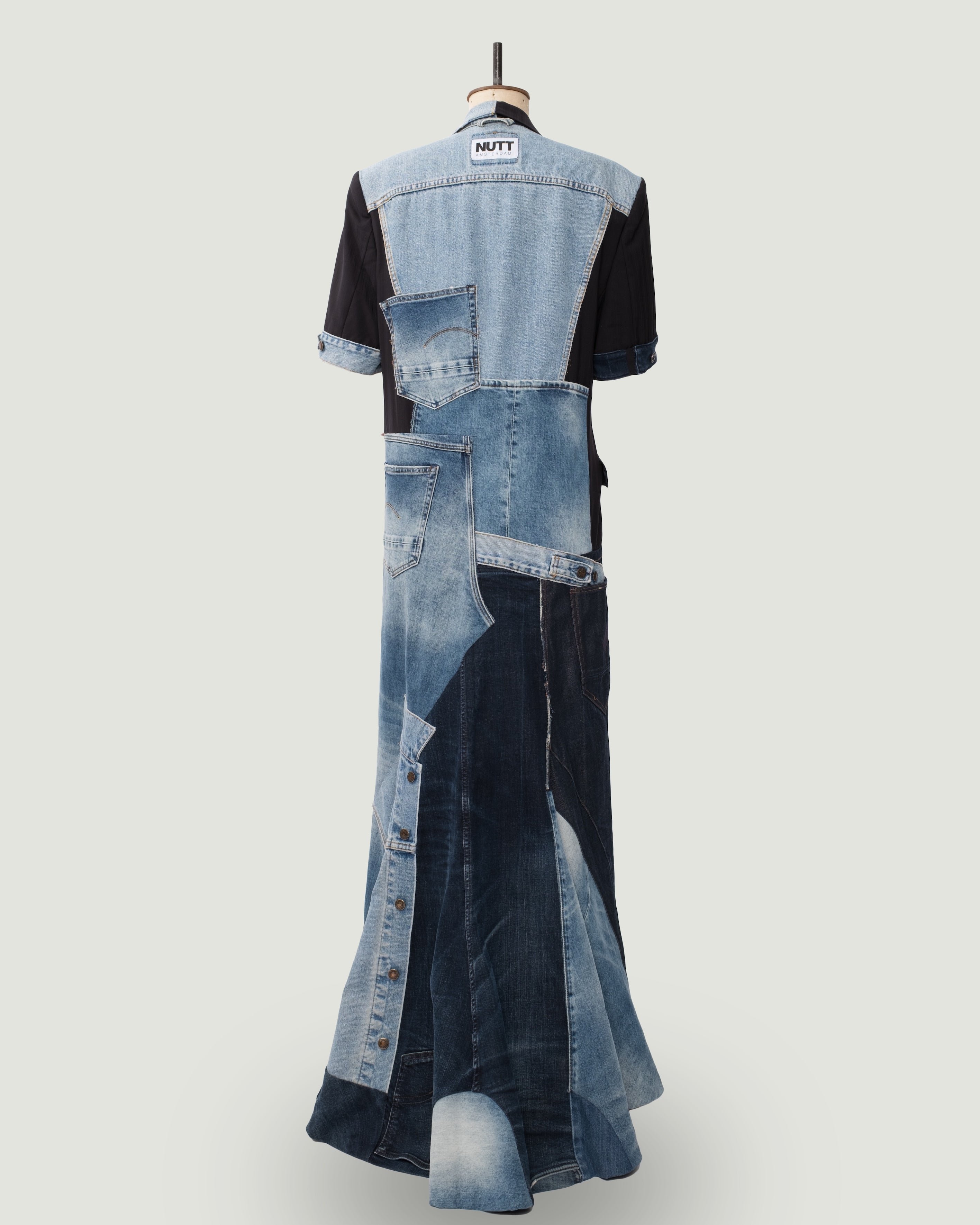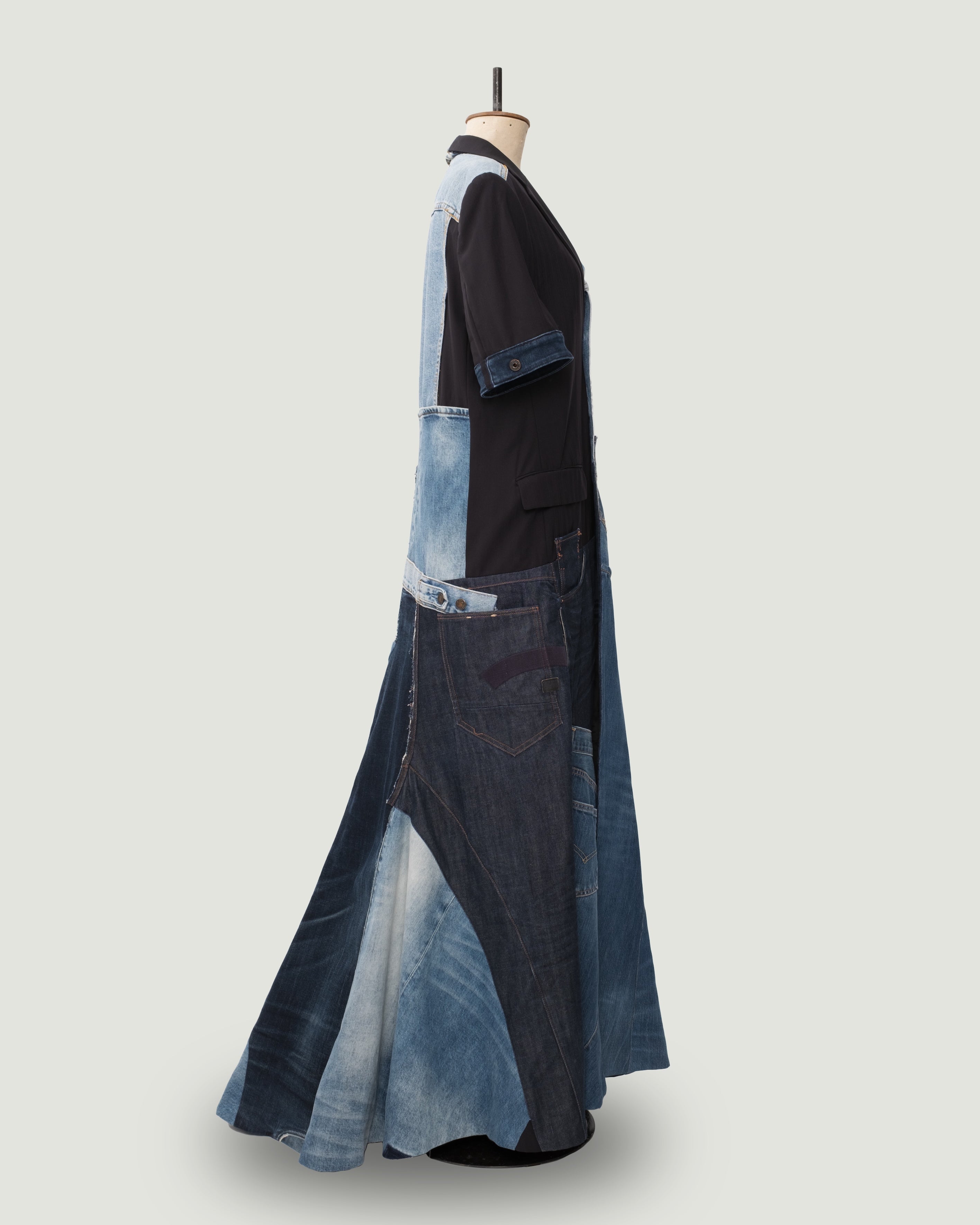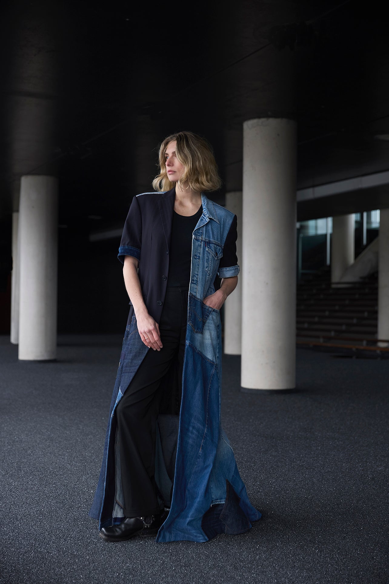 Gemaakt uit vele levens, gedragen als één statement. JEANISIS een lange mantel gemaakt van een donkerblauwe vintage blazer en versleten jeans items, elk met hun eigen verleden, die samen een nieuw verhaal vormen. Iedere naad, iedere valling van dit design is met zorg en handmatig geconstrueerd. JEANISIS omarmt je lichaam en de nonchalante sleep beweegt moeiteloos met je mee. De kleurnuances en texturen geven deze unieke one-off jas karakter en vertellen het verhaal van gebruik en hergeboorte.