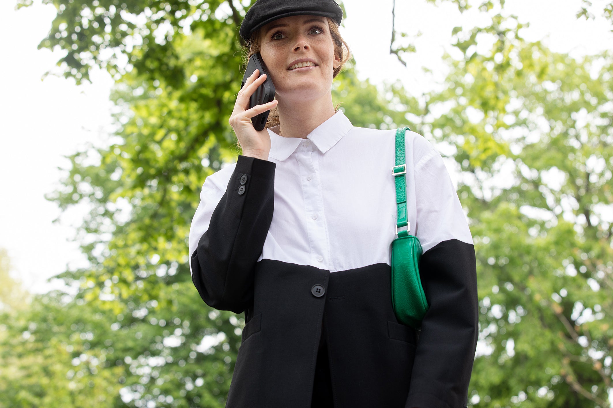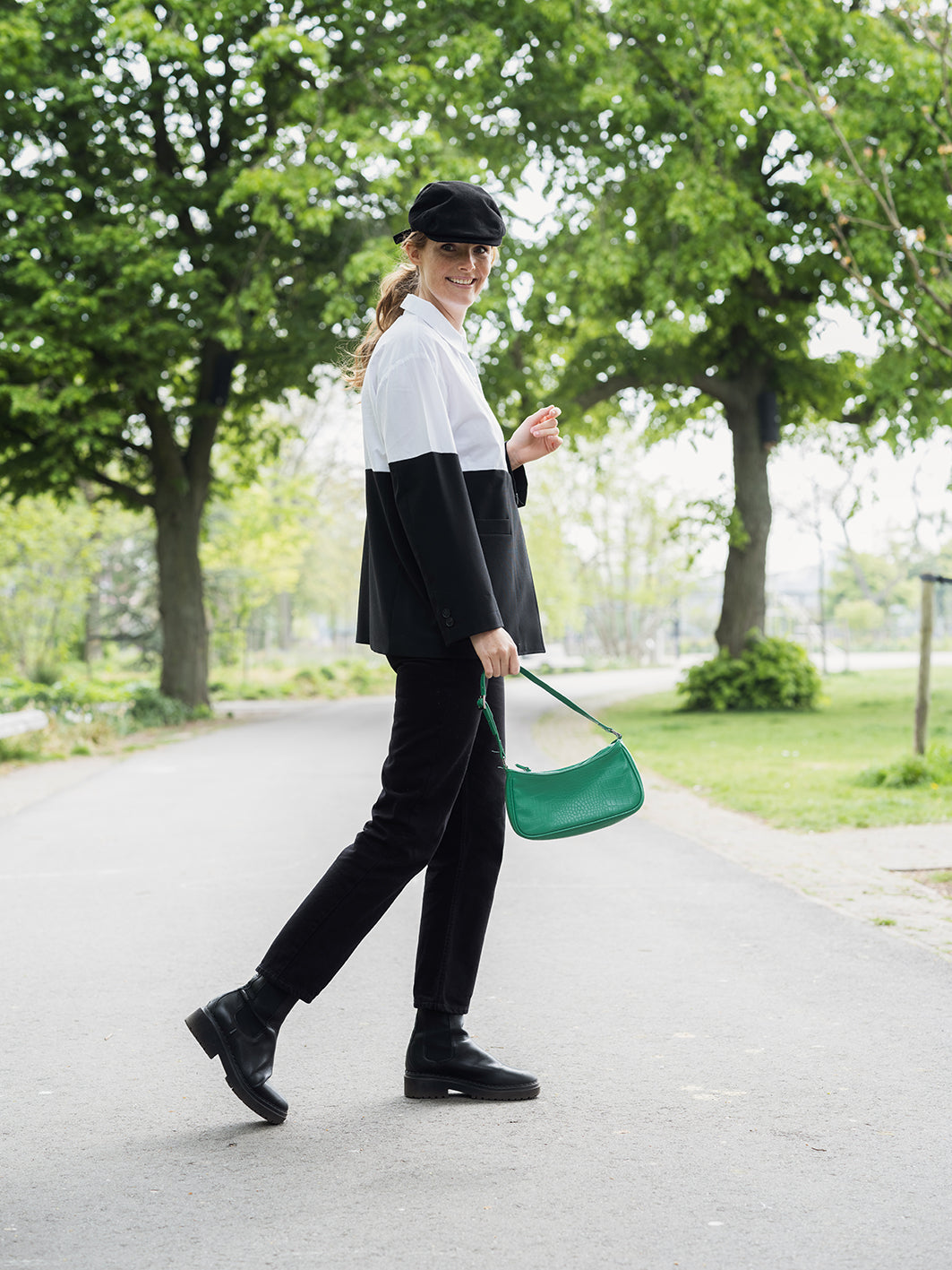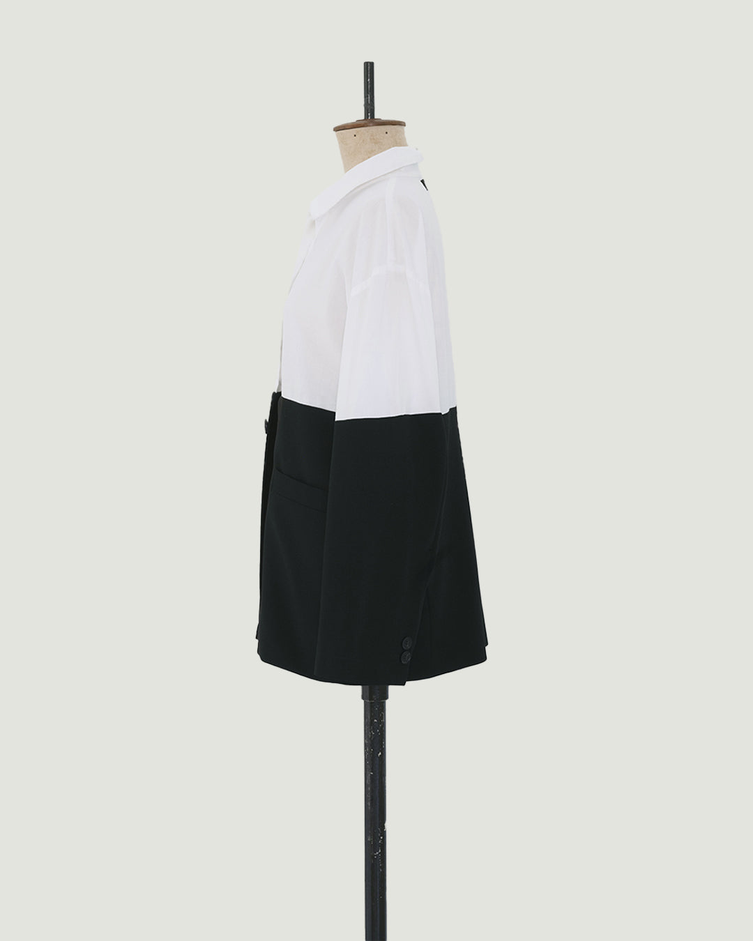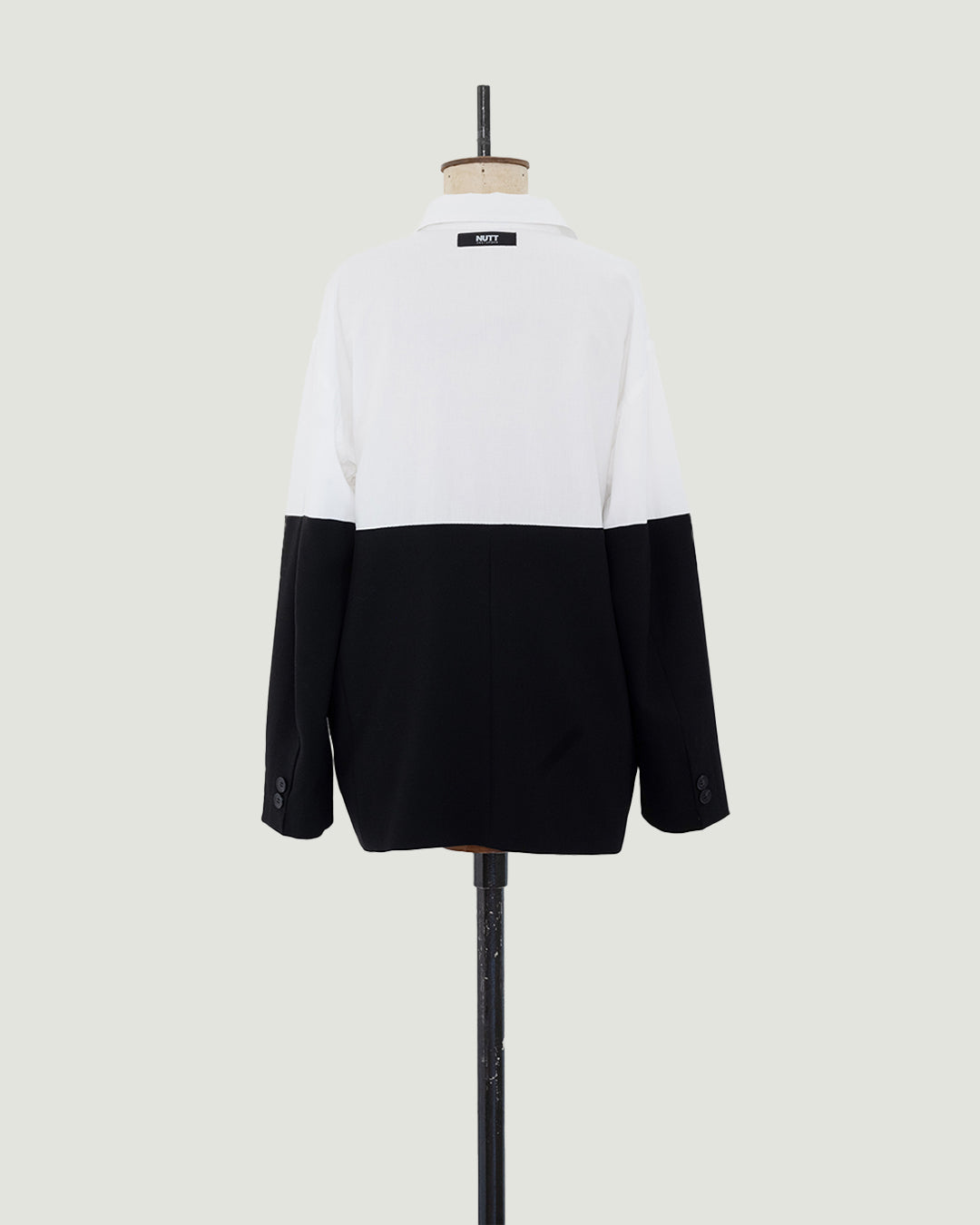 BLOUSE is een samengesteld design uit een nooit-meer-gedragen, hagelwitte, katoenen blouse en afgedankte gitzwarte blazer. De blazer sluit je door alleen de blouse dicht te knopen. Hij valt aan de onderkant verder open.