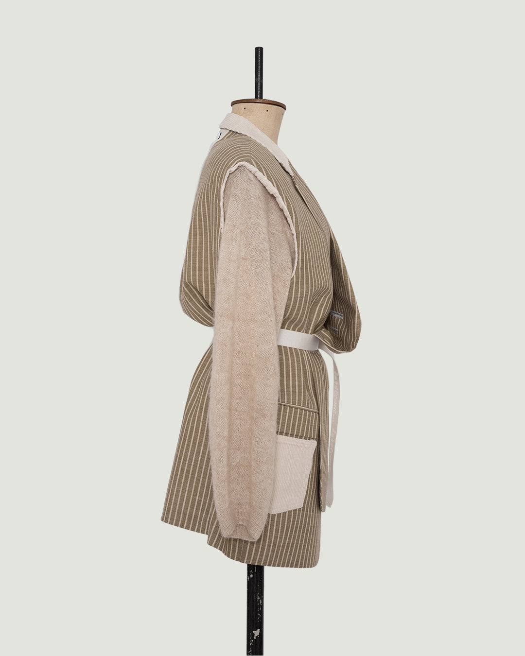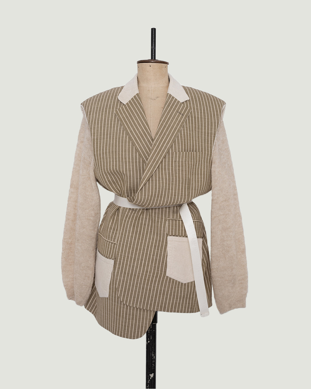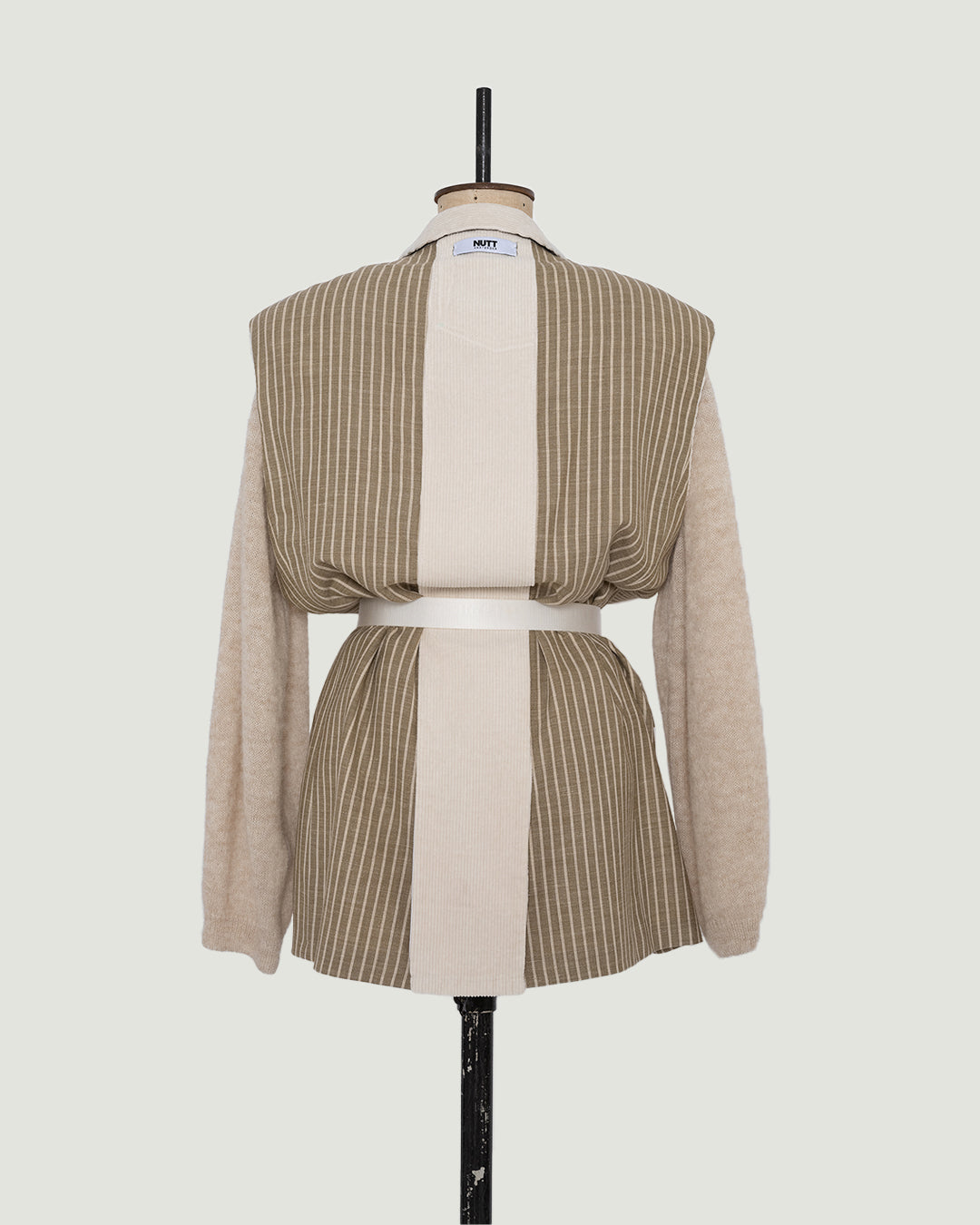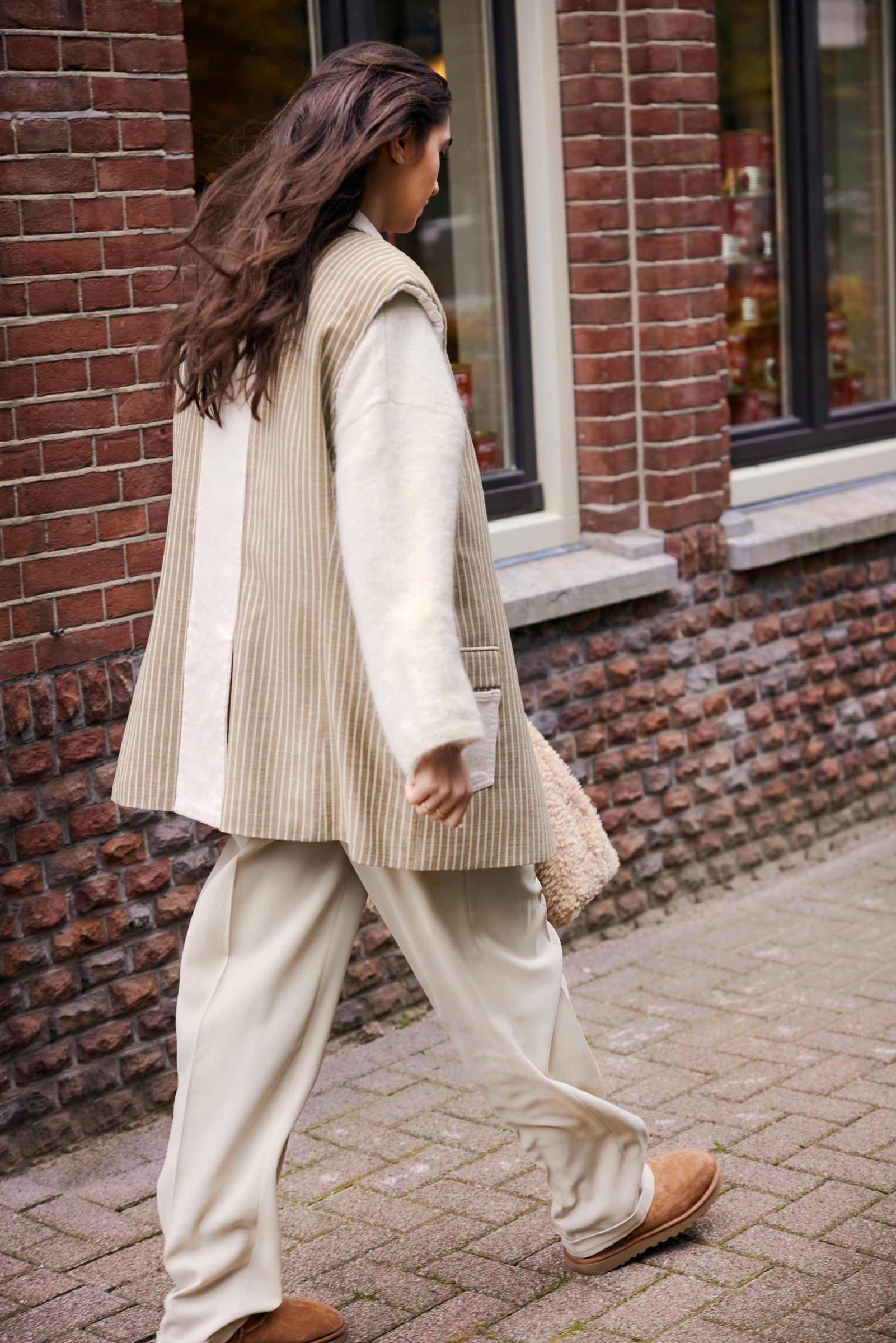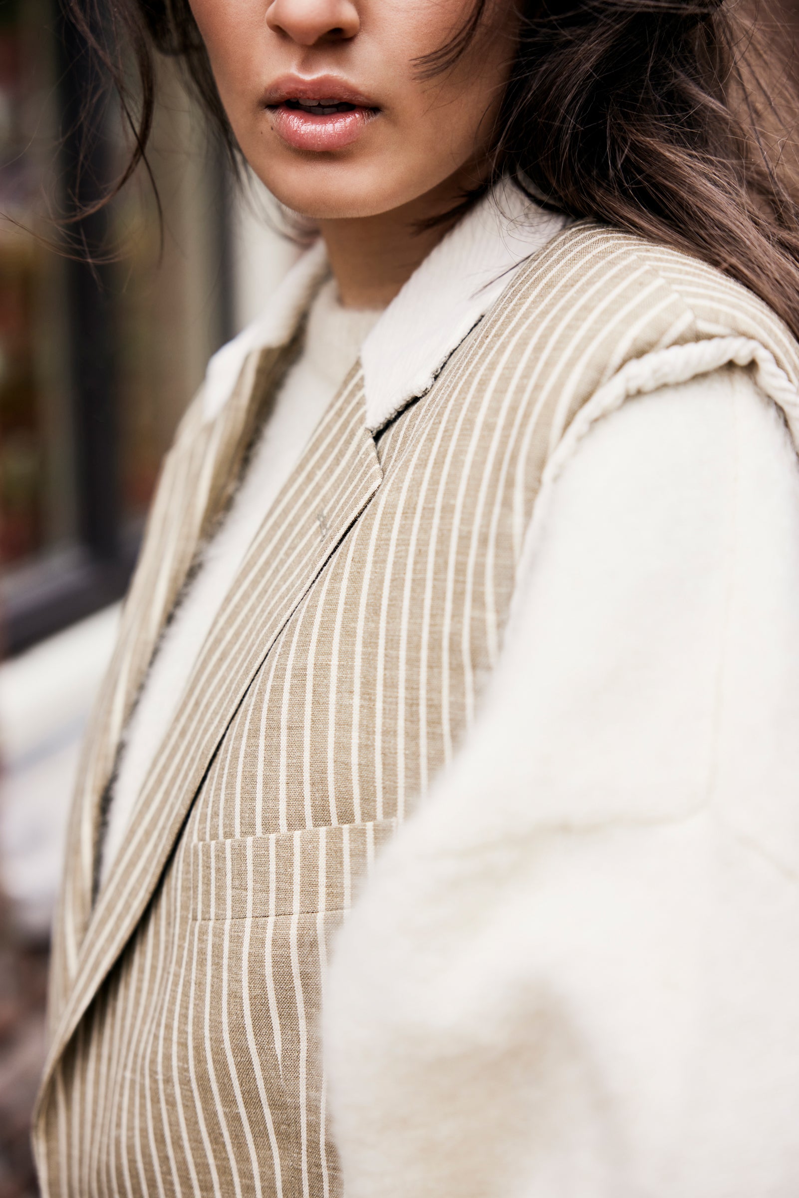 BODYWARMER is een samengesteld design uit een afgedankte, licht naturel blazer in streep, en een gedumpte ribfluwelen broek. De mouwloze blazer heeft opgestikte kontzakken voor en een brede fluwelen streep achter die uitloopt in splitten. Draag hem los over een dikke trui of tailleer hem met een riem.