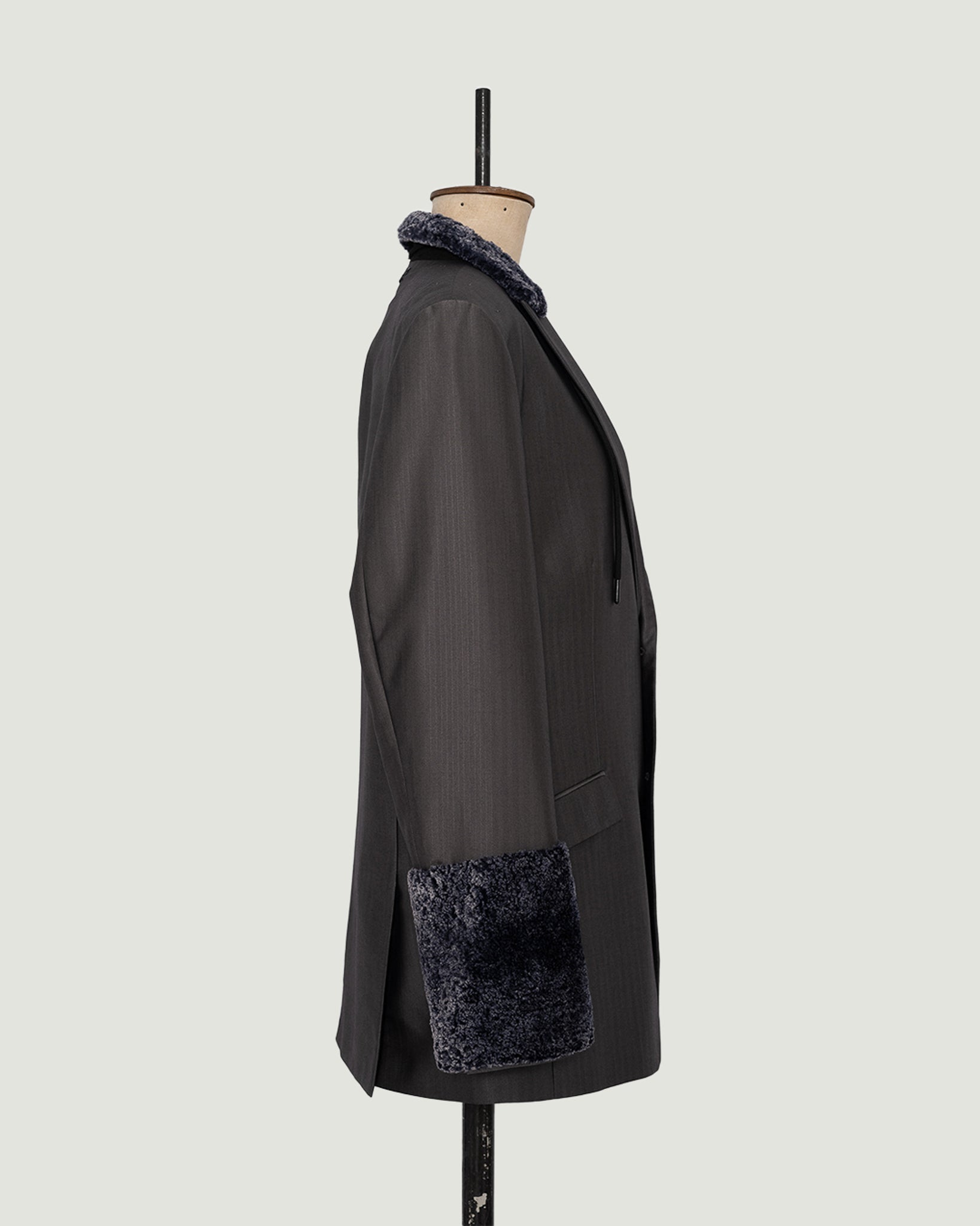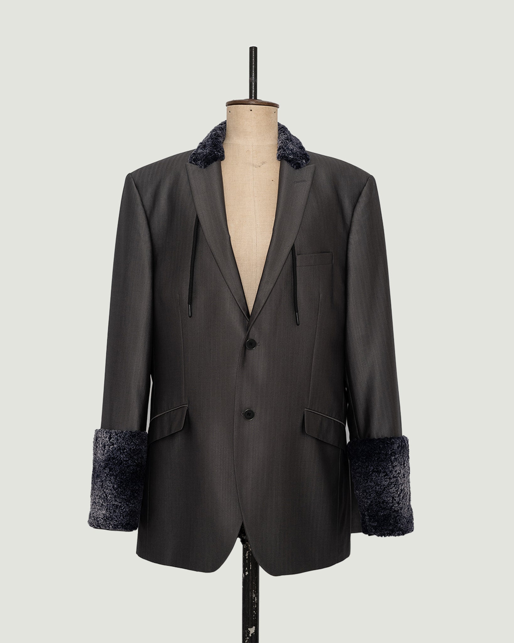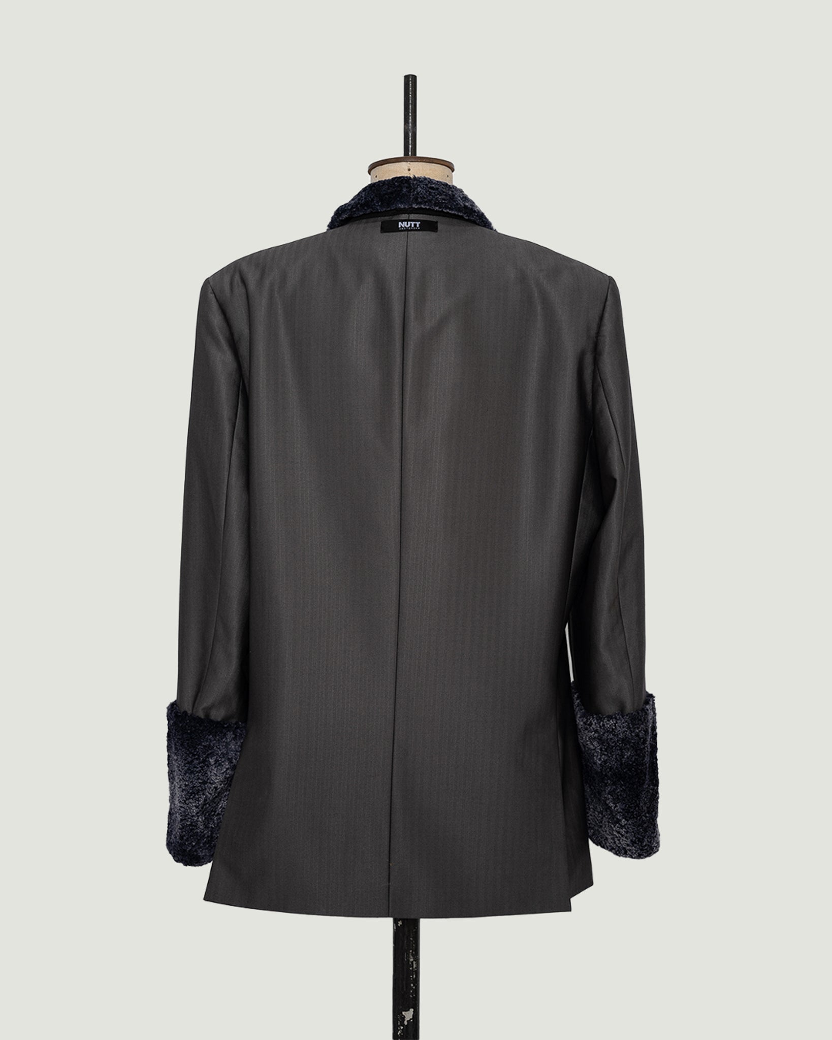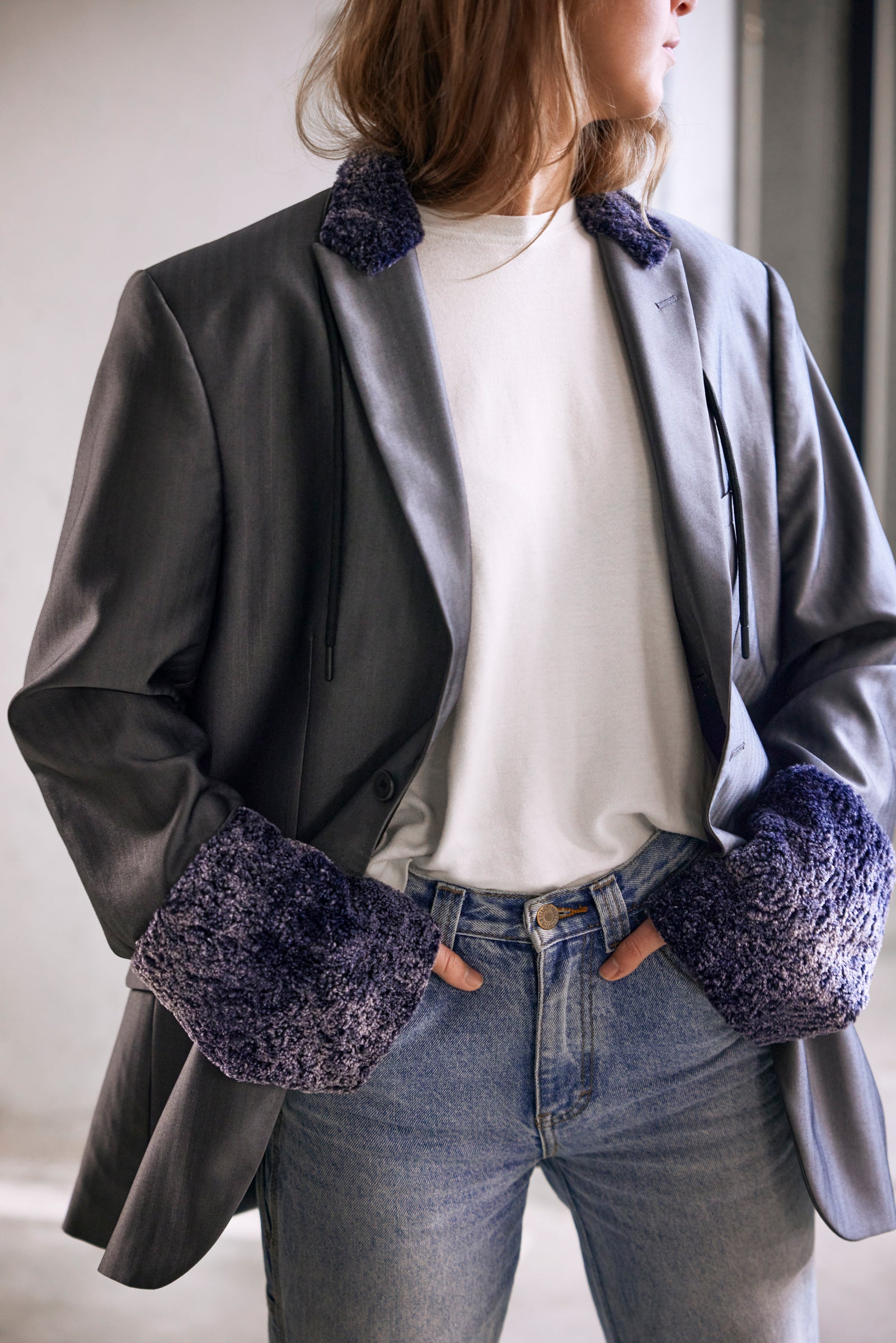 BONT is een samengesteld design uit een nooit-meer-gedragen hoogglans grijze blazer en een gedumpte diepgrijs-paarse bodywarmer. De chique blazer heeft een zwart koord in de nek en heeft twee splitten. Je draagt hem passend of oversized en is voor iedereen.