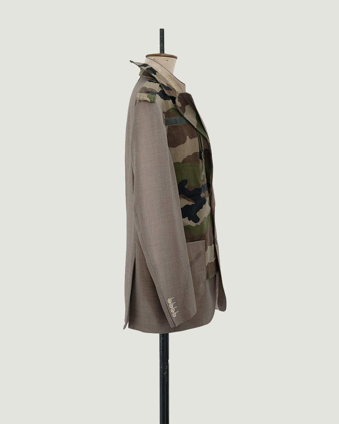 DUMP is een samengesteld design uit een afgedankte soft blazer en een gedumpte leger jack. De blazer heeft een lage hals, valt soepel, heeft opgestikte naden en draag je oversized.