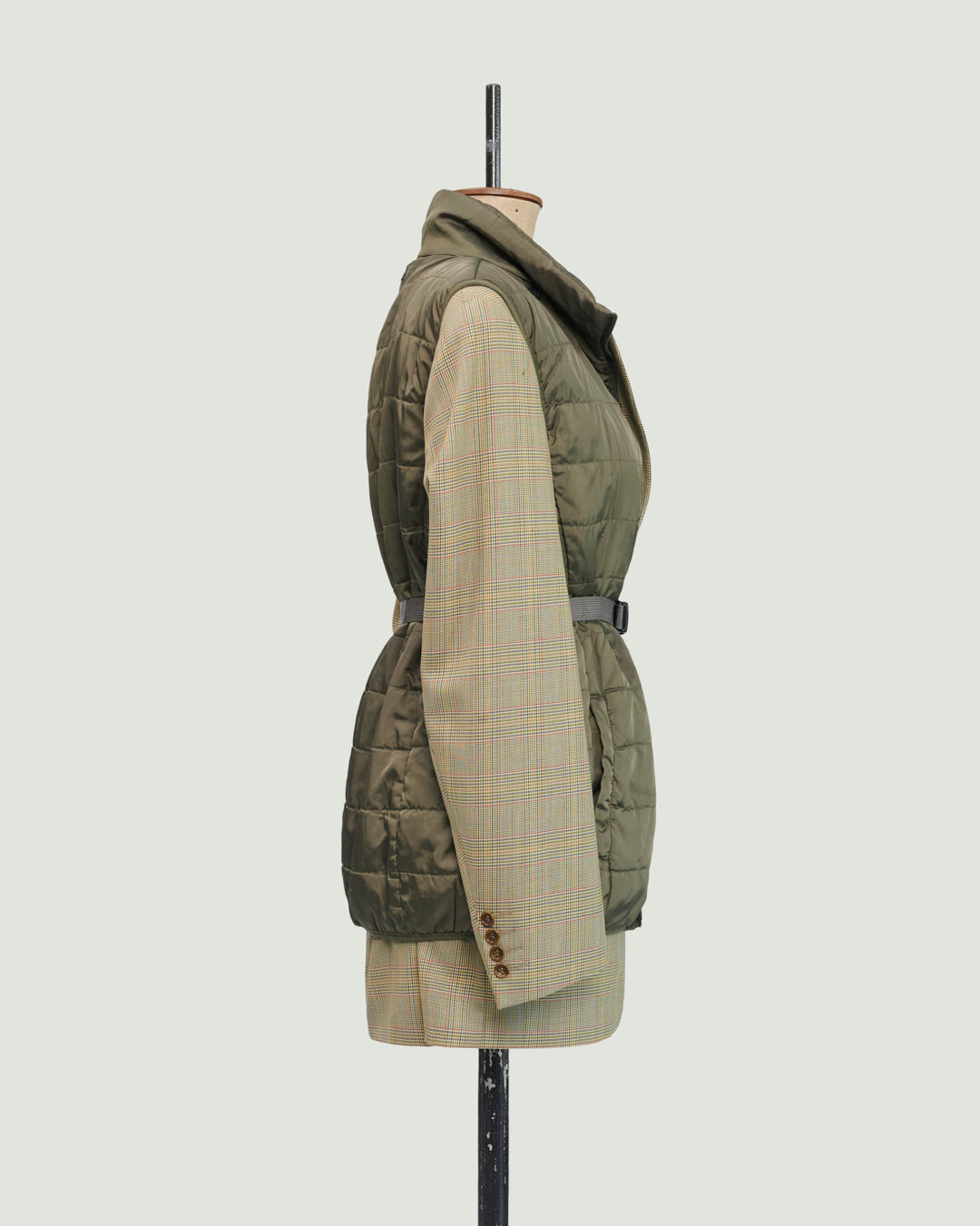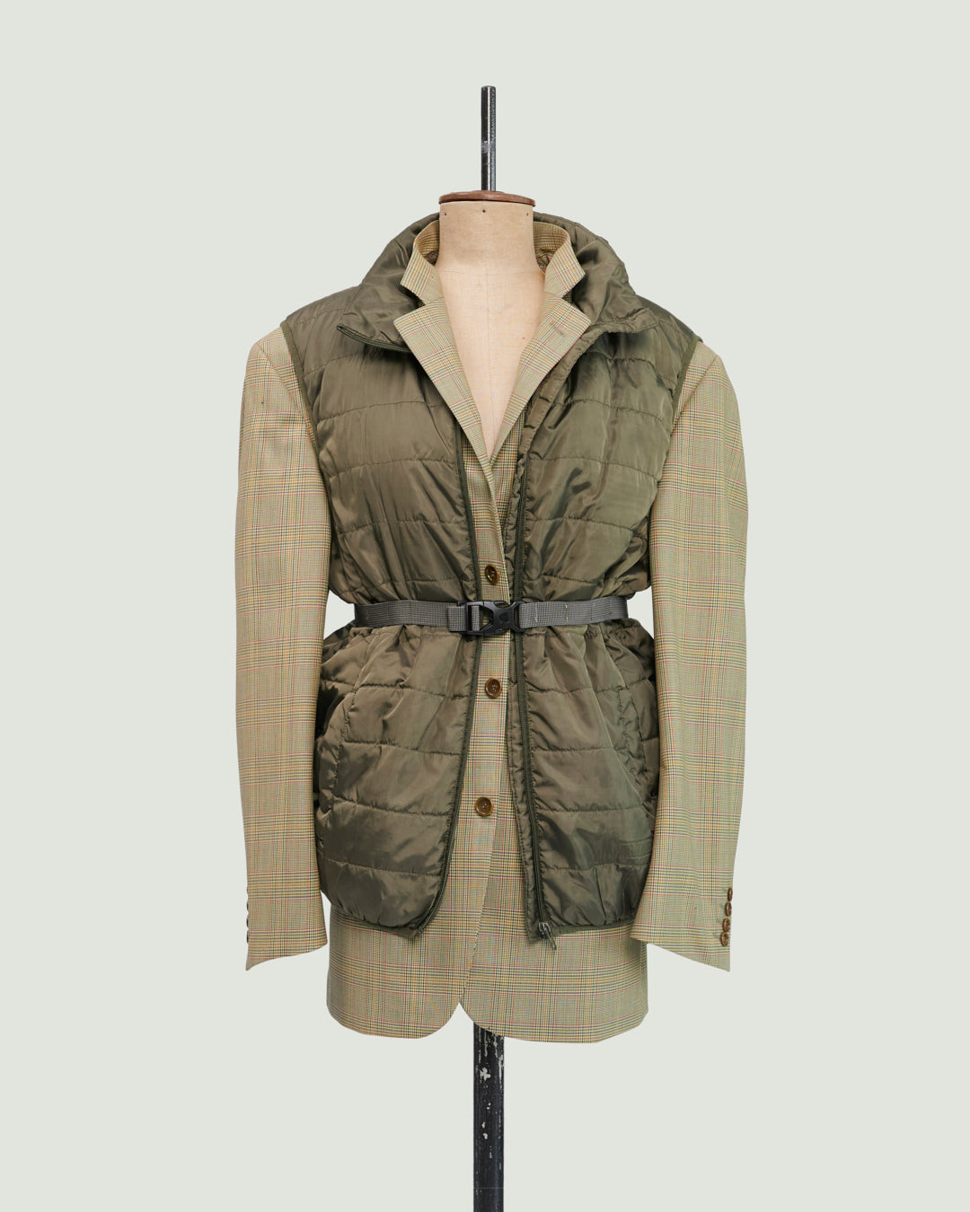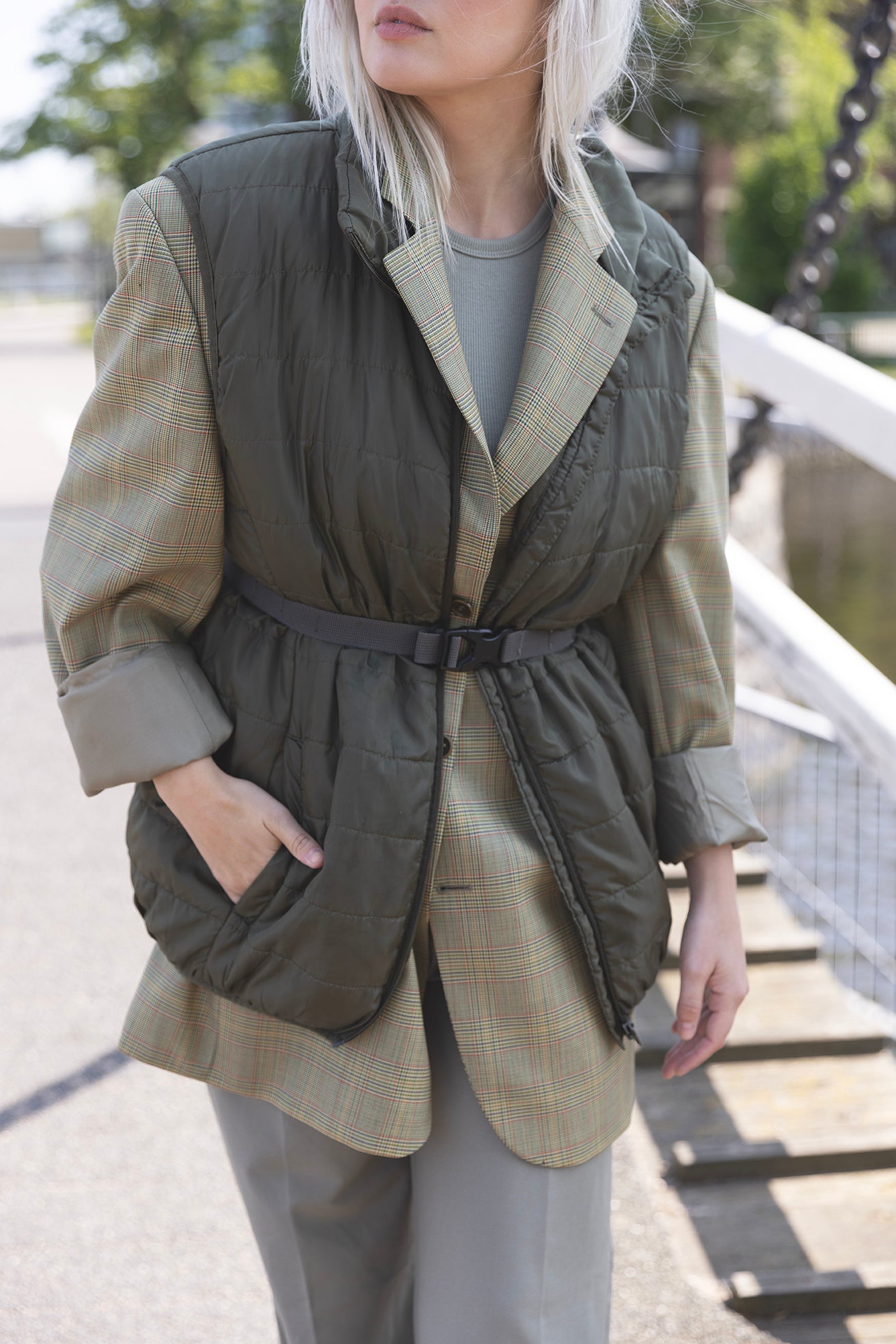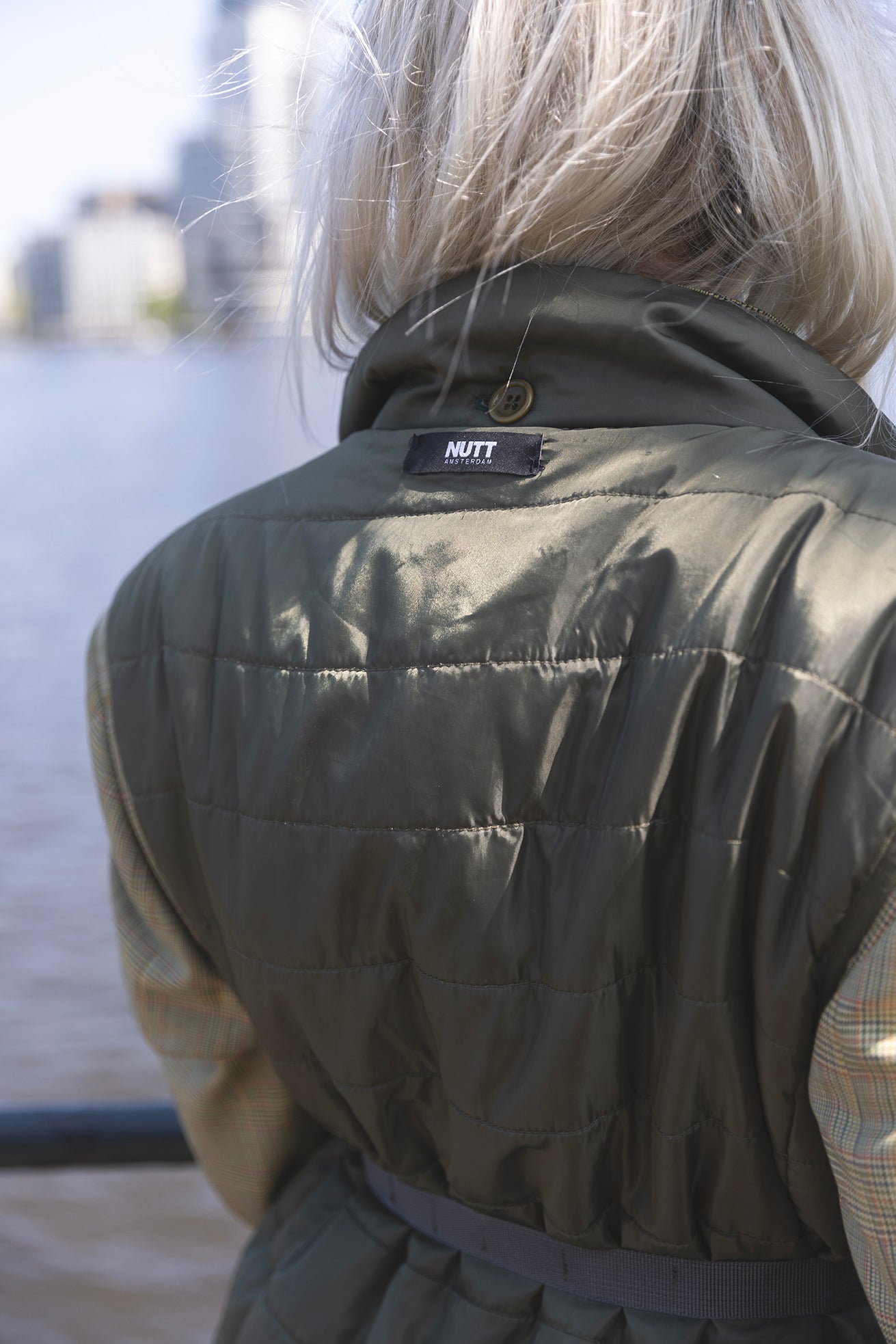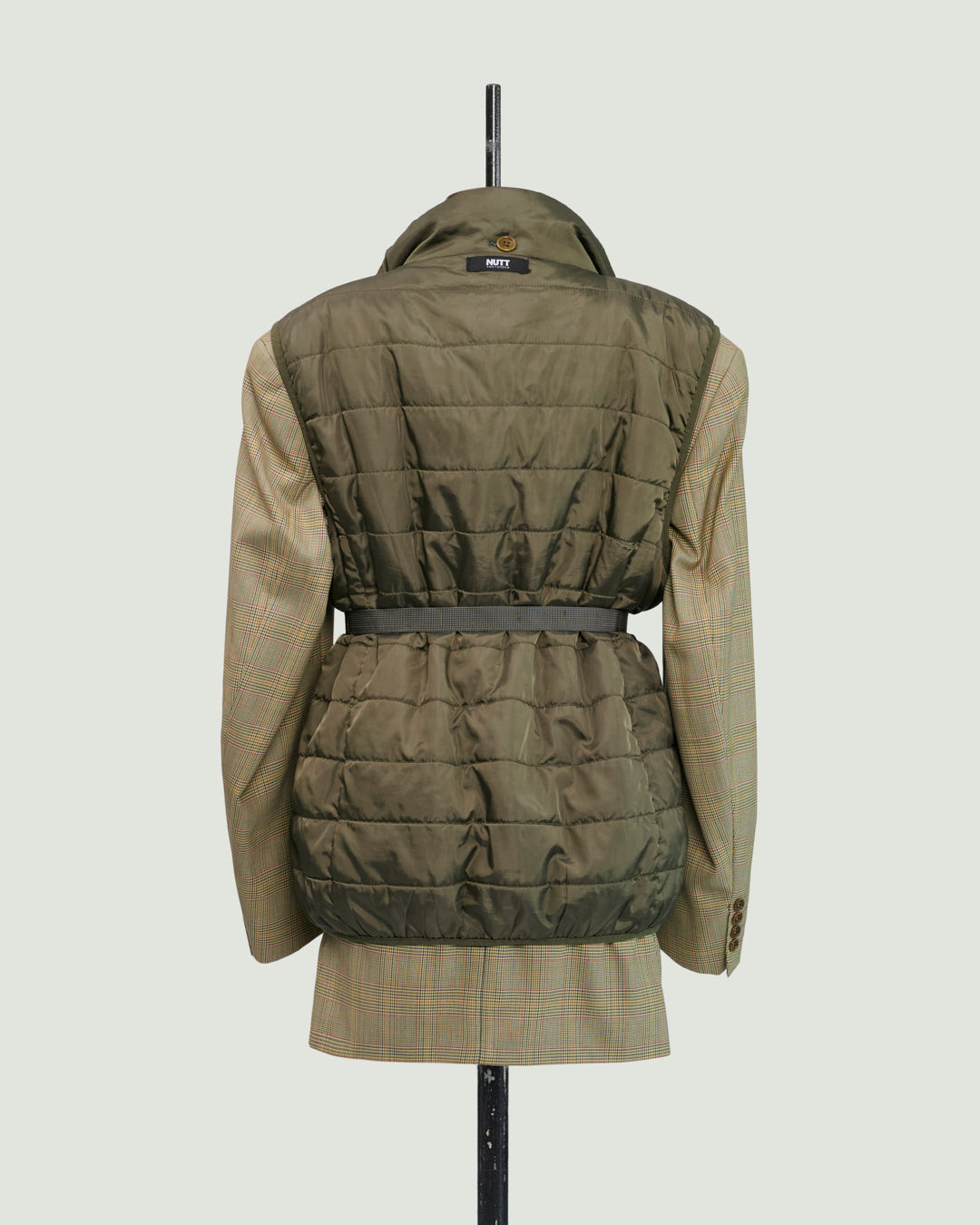 HUNTY is een samengesteld design uit een afgedankte zacht groene oversized blazer in geweven ruitpatroon en een gedumpte dunne bodywarmer. Met drie knopen is de bodywarmer afneembaar en de blazer los draagbaar. Door de riem met klik sluiting krijgt de jas een passende maat M.