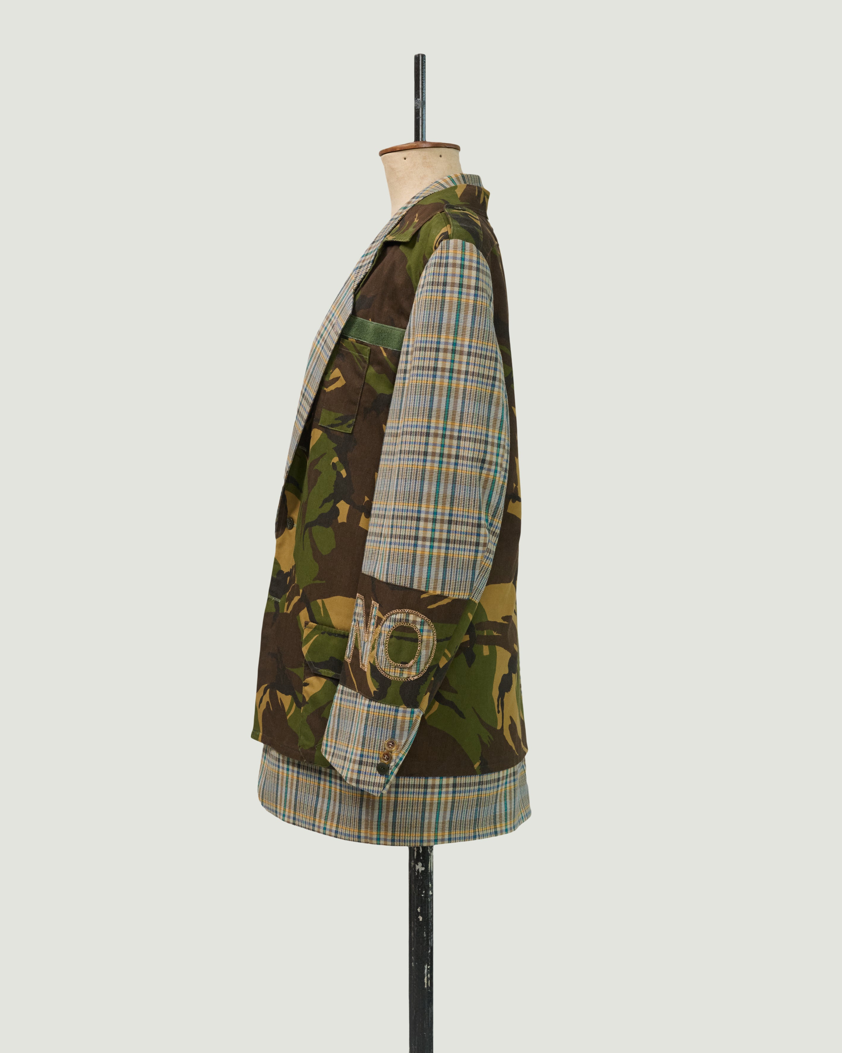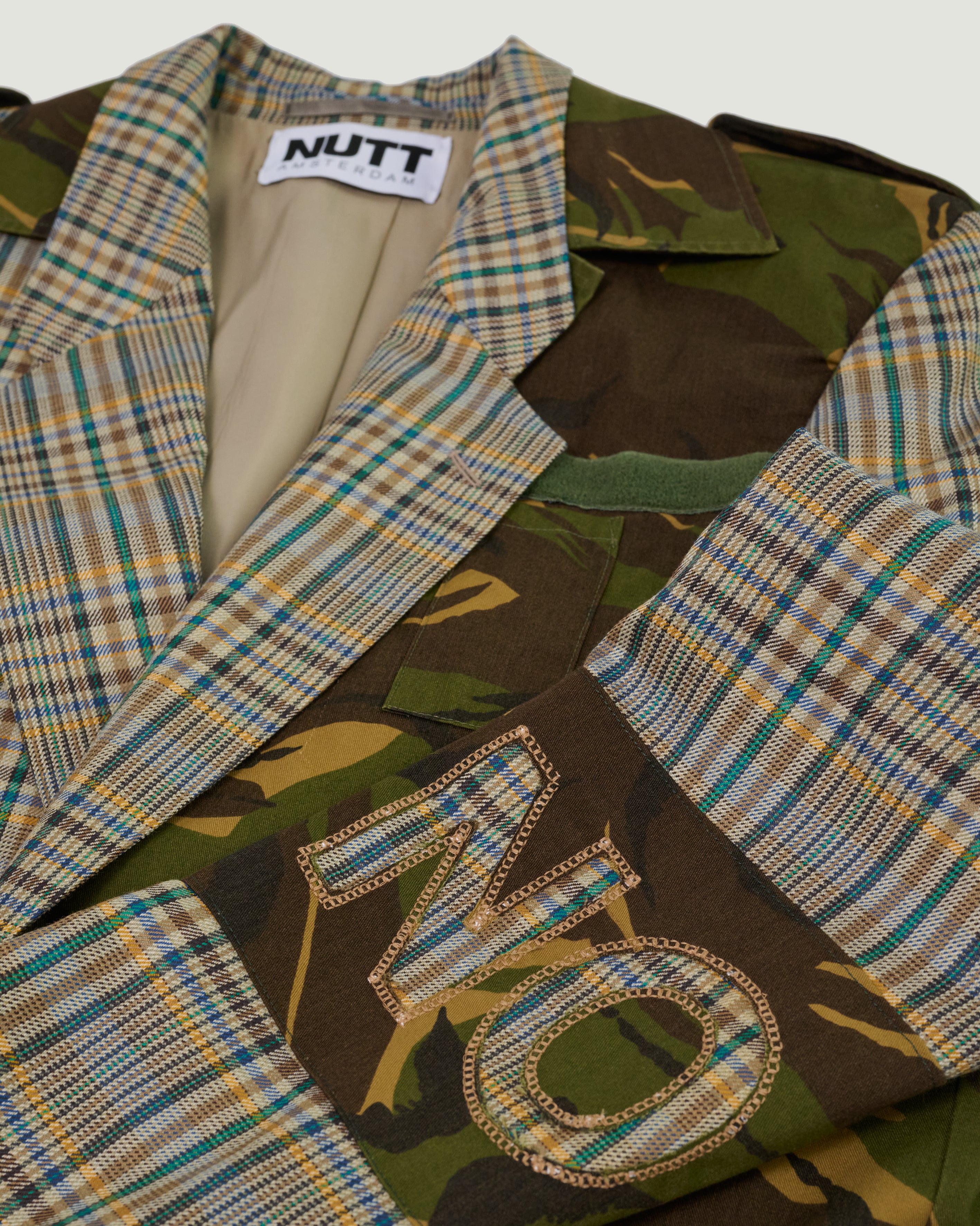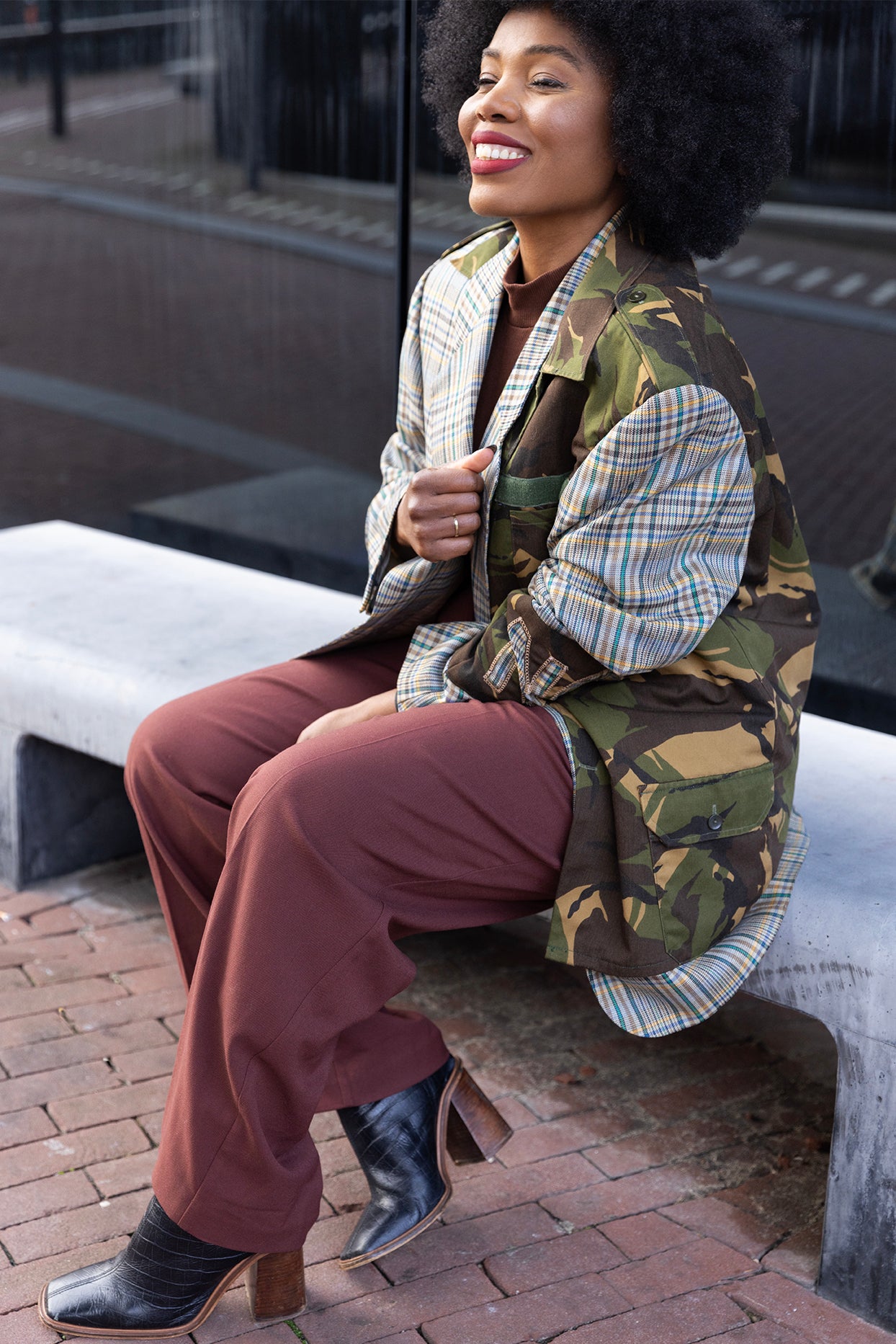 PEACE is een samengesteld design uit een gedumpte multicolour blazer en een nooit-meer-gedragen legerjasje. De blazer heeft groen, okergeel en bruine strepen in ruitpatroon en is van zuiver scheerwol. Door de stoere vlakverdelingen, de epauletten en de opgestikte zak krijgt de jas een stoere look. Je draagt hem casual of chic en is voor iedereen.