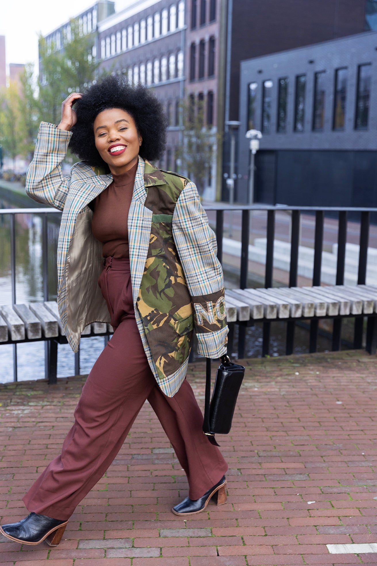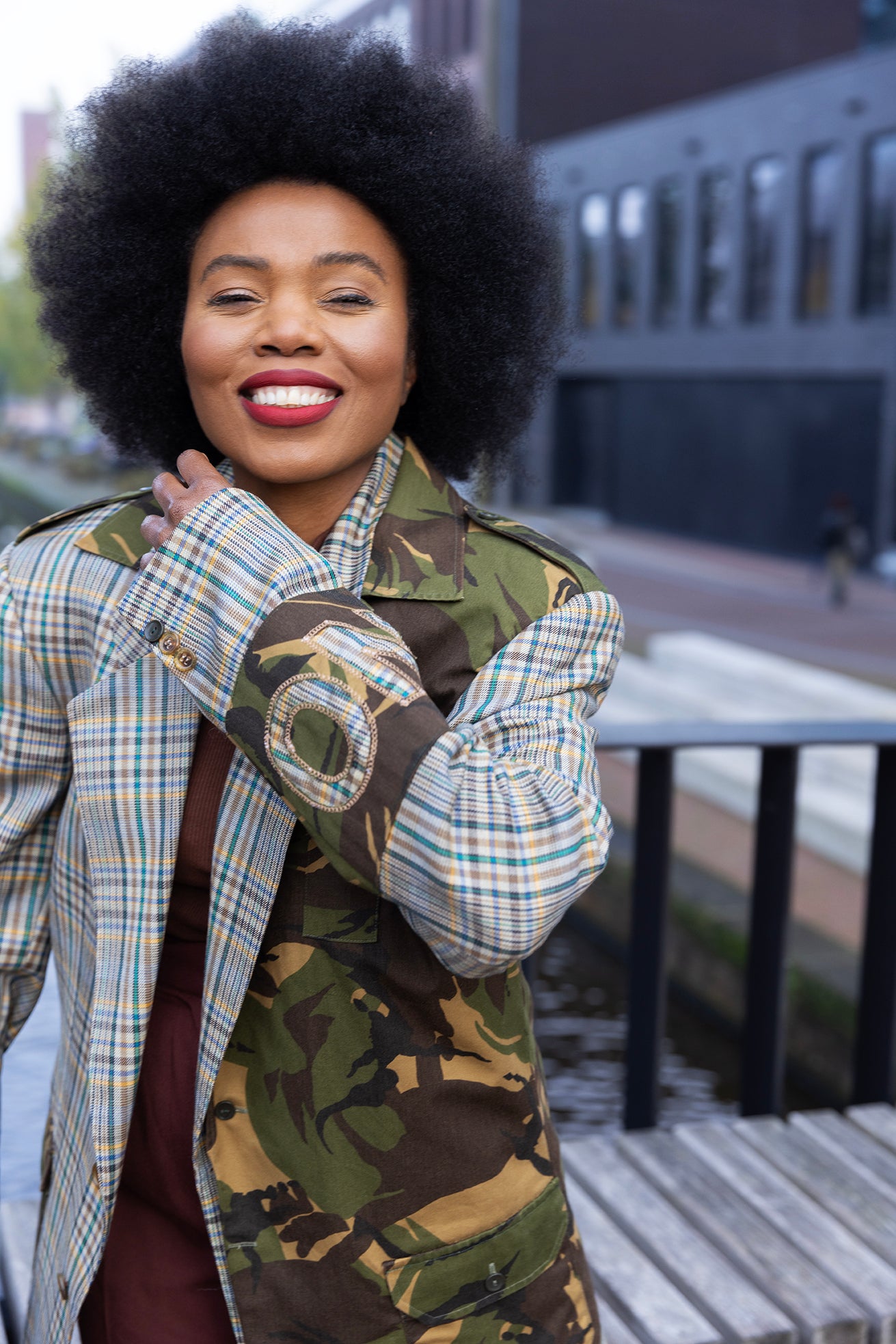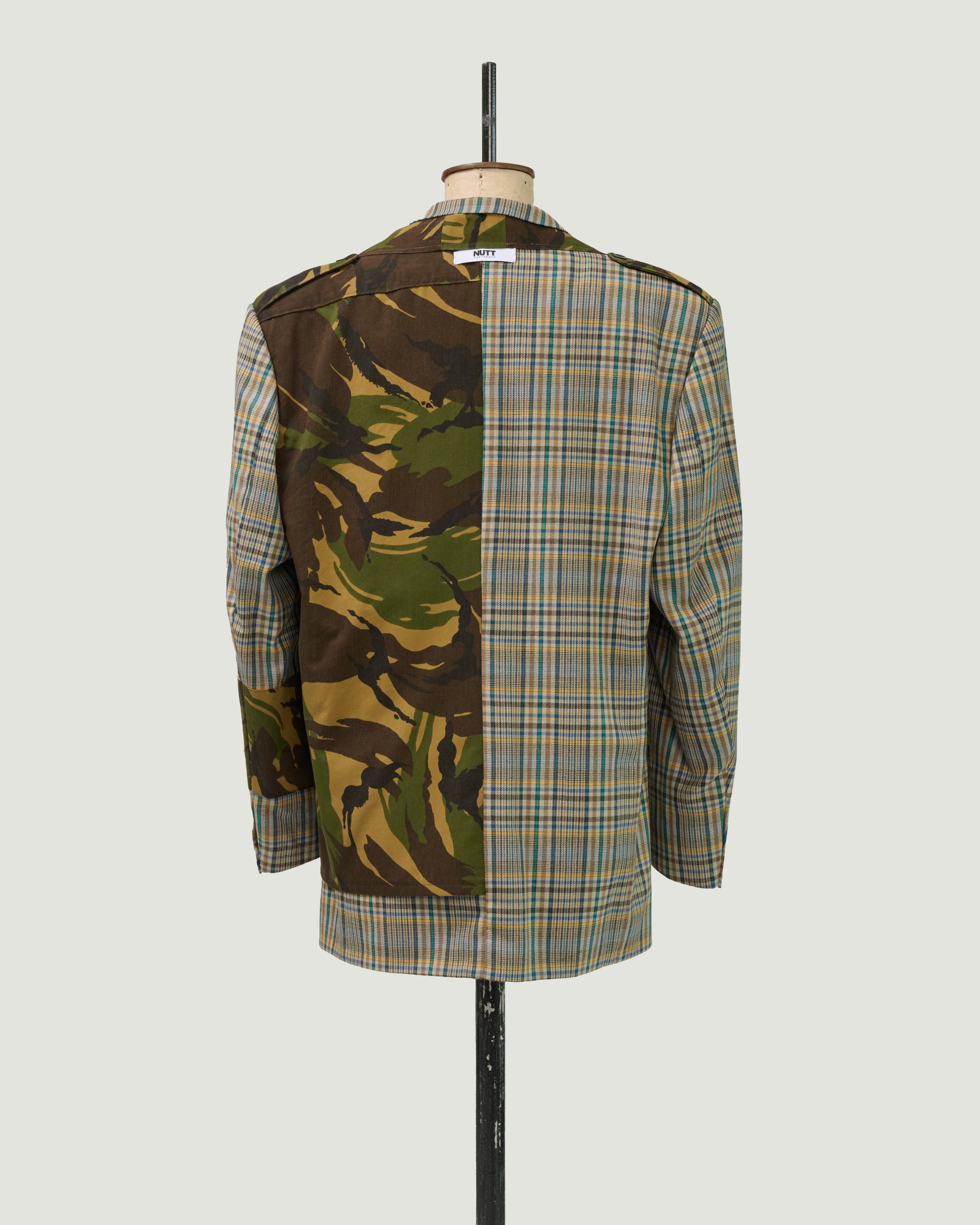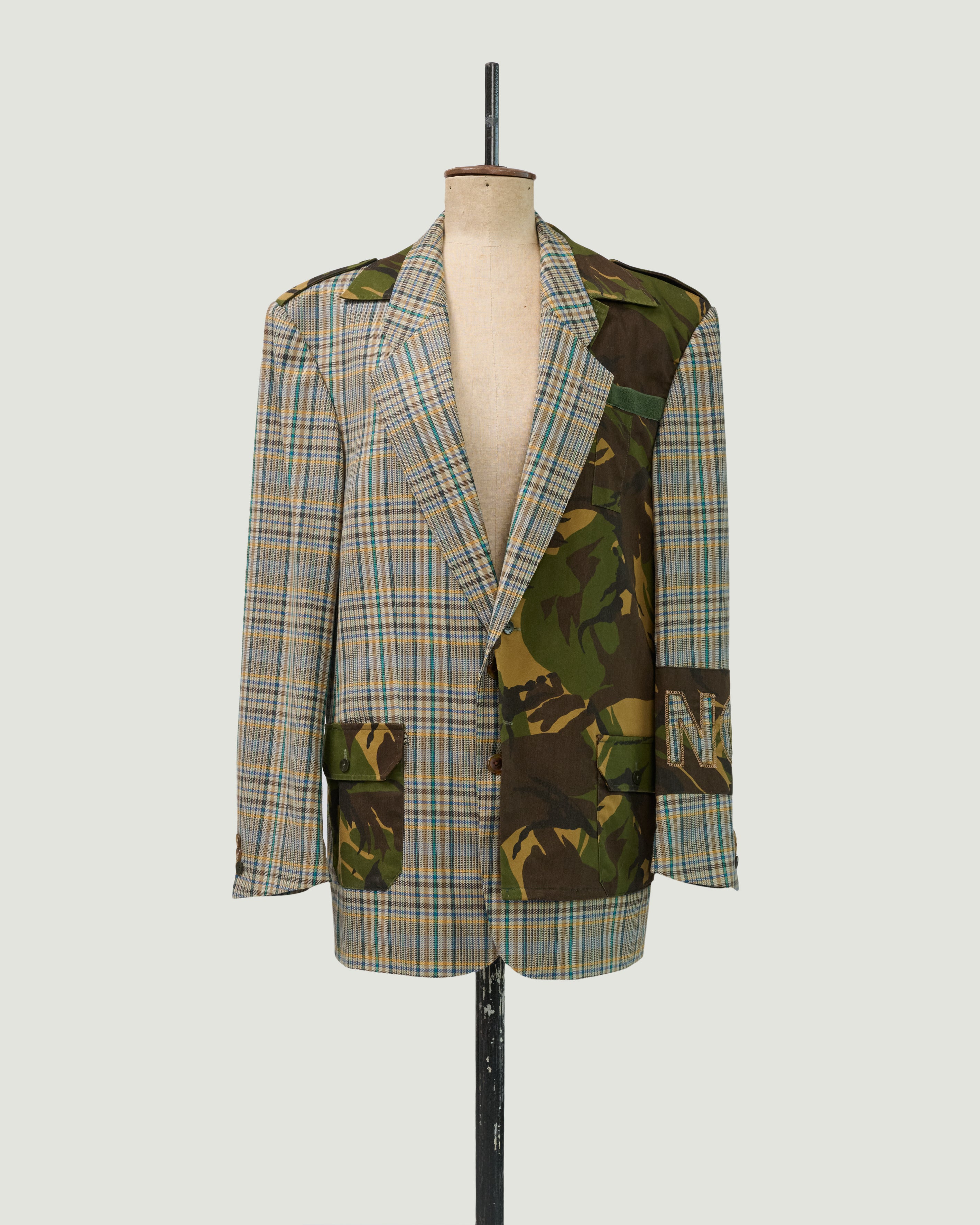 PEACE is een samengesteld design uit een gedumpte multicolour blazer en een nooit-meer-gedragen legerjasje. De blazer heeft groen, okergeel en bruine strepen in ruitpatroon en is van zuiver scheerwol. Door de stoere vlakverdelingen, de epauletten en de opgestikte zak krijgt de jas een stoere look. Je draagt hem casual of chic en is voor iedereen.