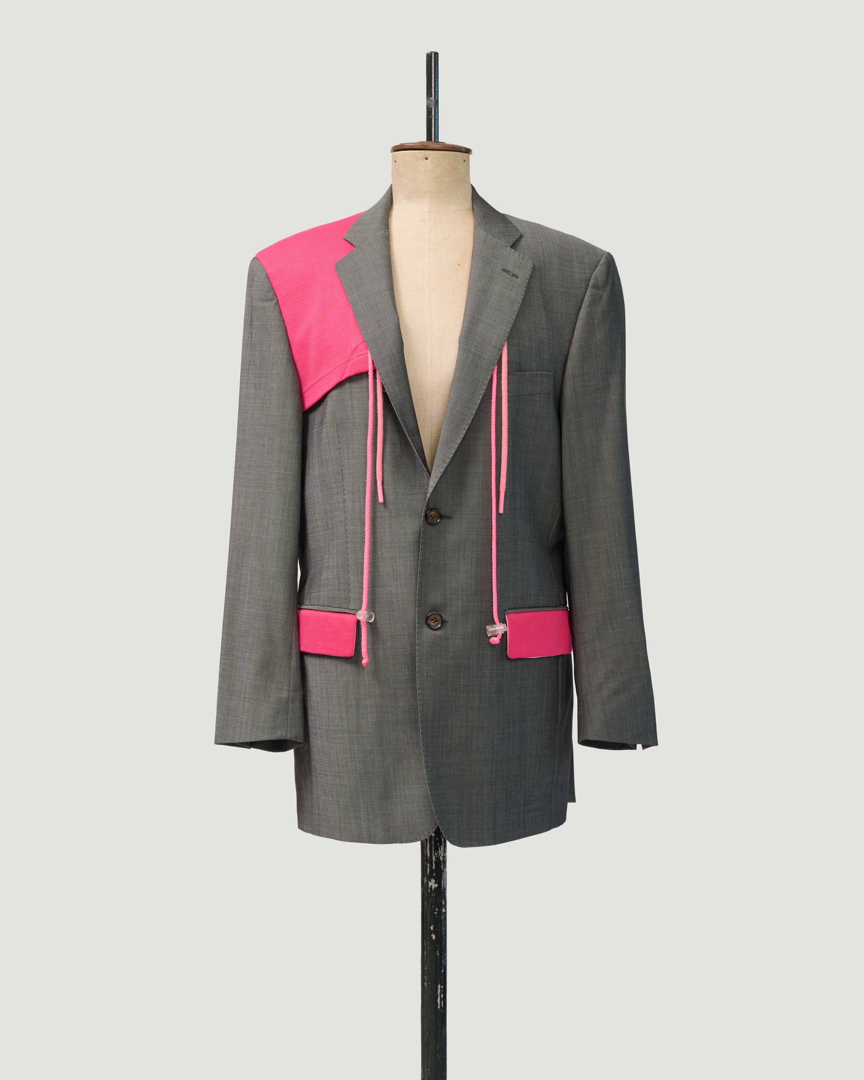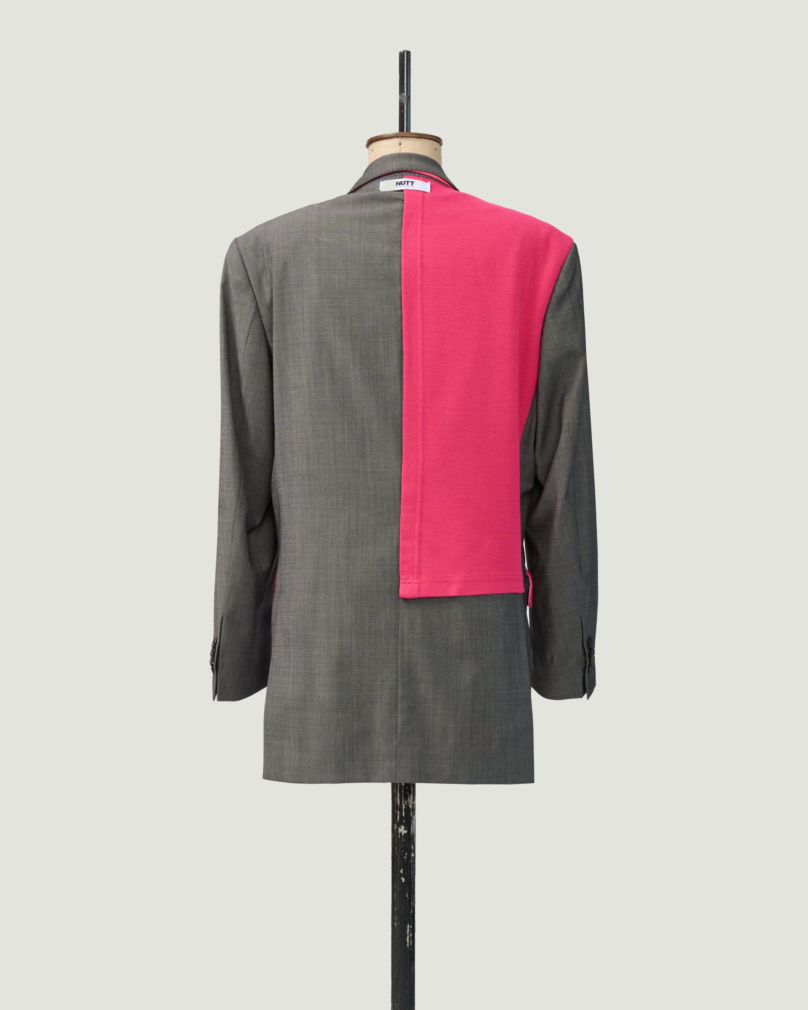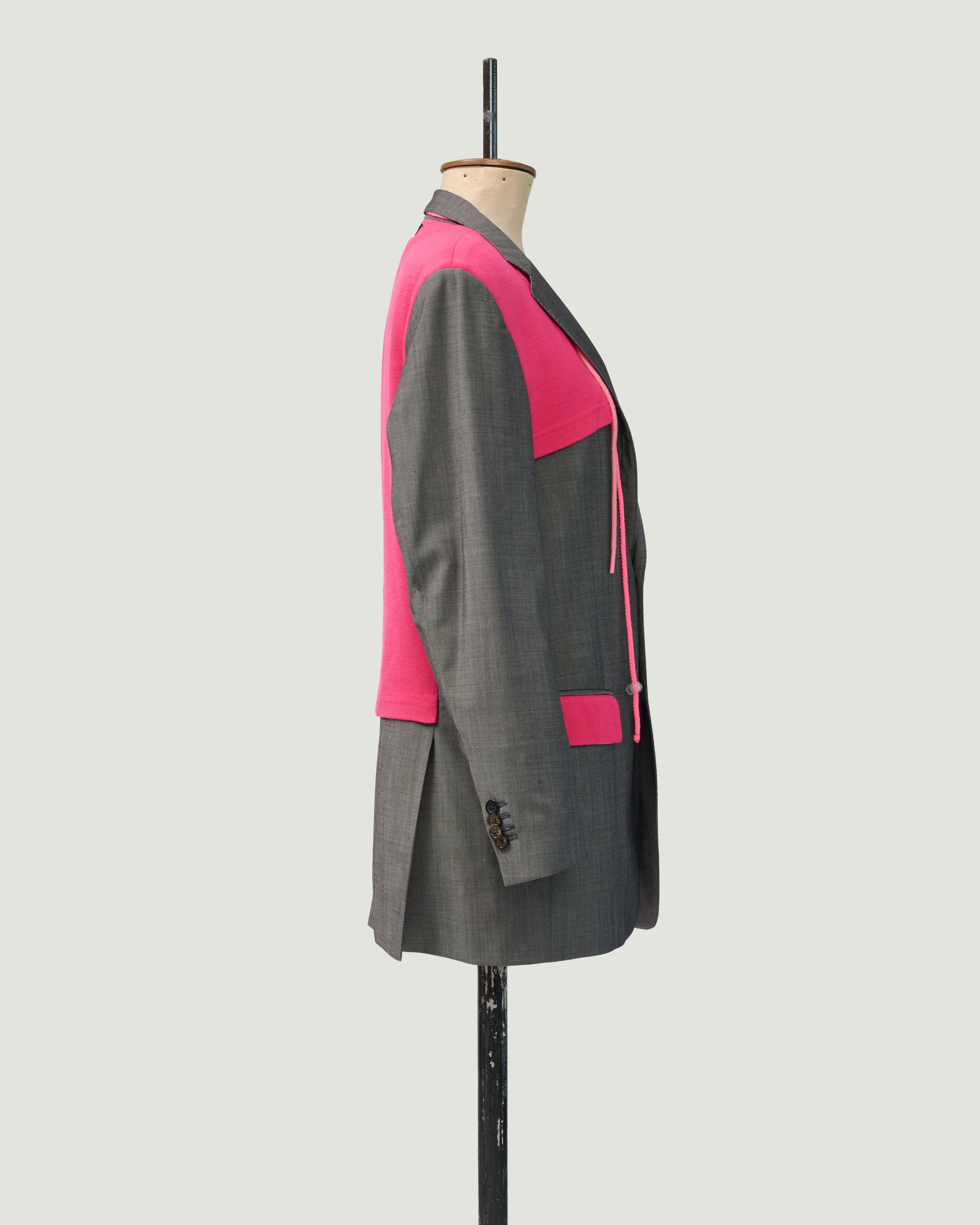 PINKIE is een samengesteld design uit een nooit-meer-gedragen grijze blazer en een gedumpte roze tricot jurk. De eigenwijze blazer valt recht, heeft een zachtroze voering en roze vlakverdelingen. De roze veters in de hals geven deze blazer een sportieve look. Je draagt hem passend of iets oversized, casual of chic.