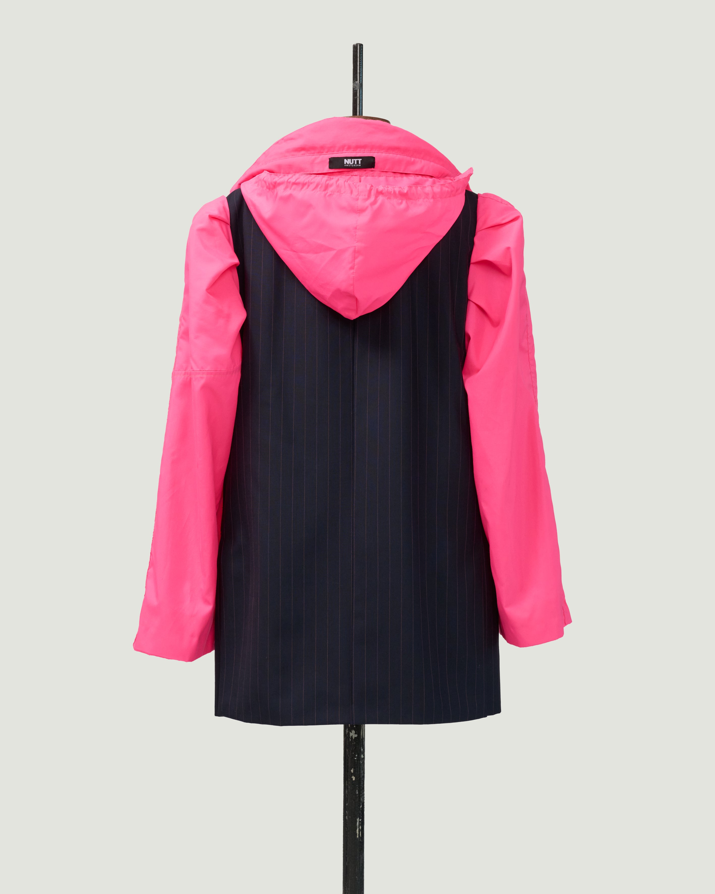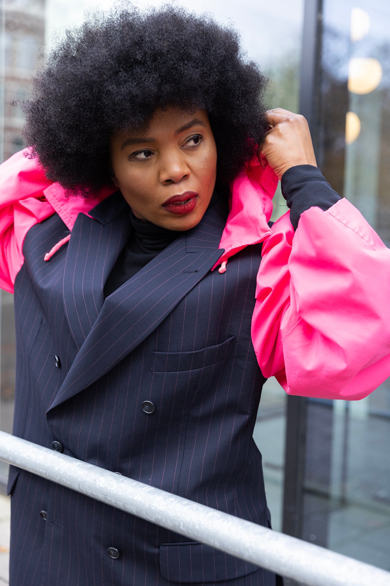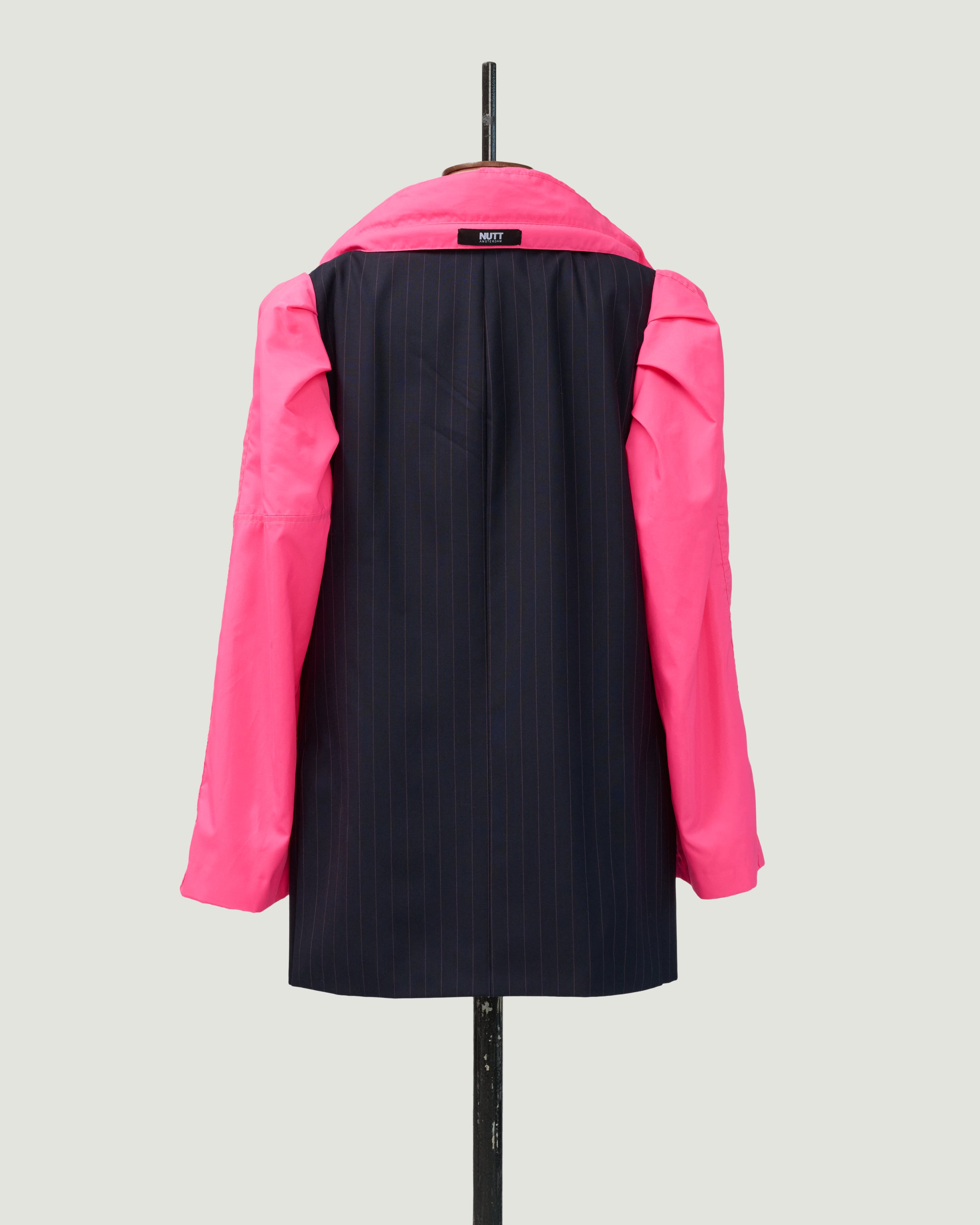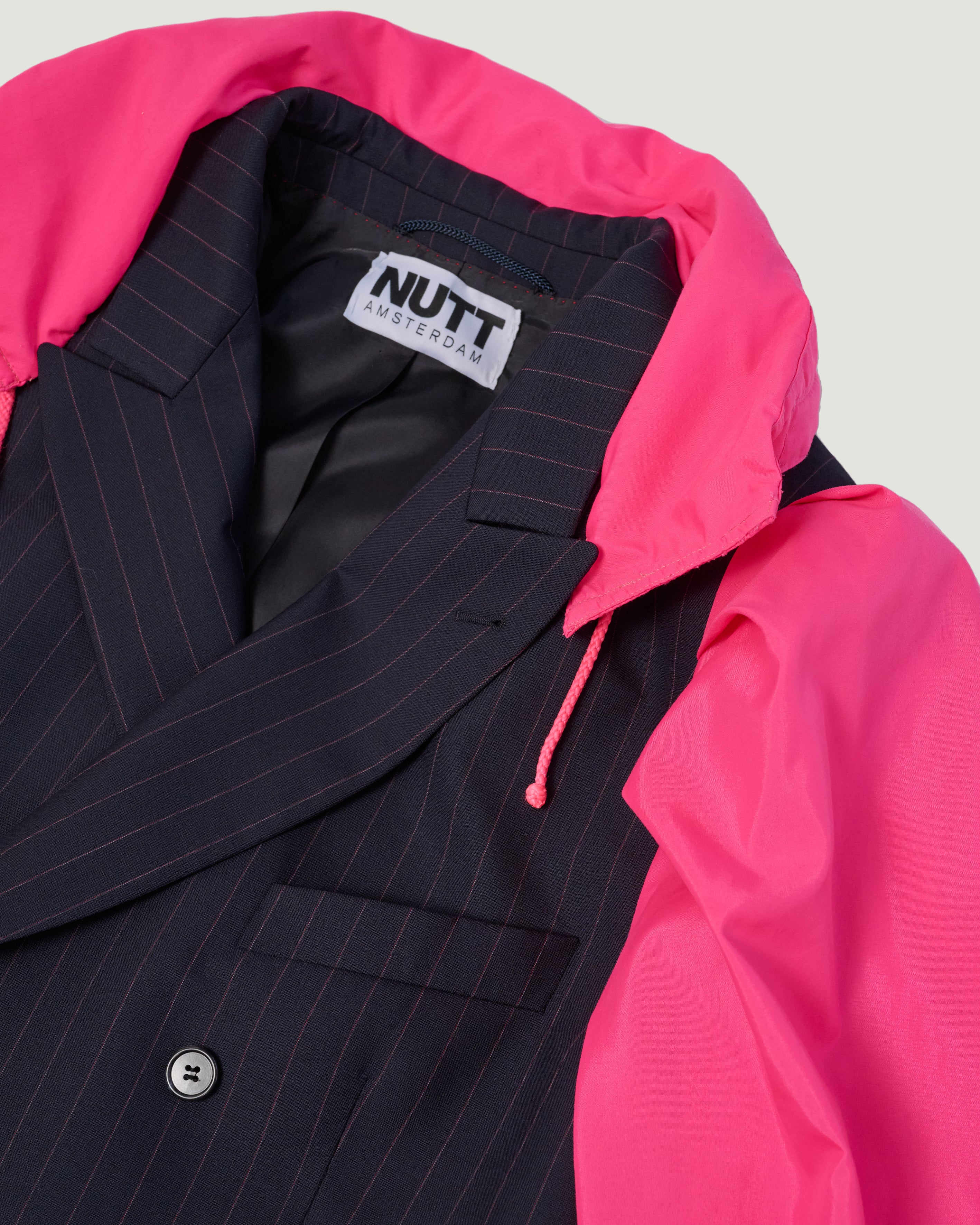 PUFF is een samengesteld design uit een gedumpte zwart-blauw met roze krijtstrepen blazer en een nooit-meer-gedragen knalroze sportjack. De blazer heeft royale pofmouwen en een ruime kraag met uitneembare capuchon. Door de dubbele knoopsluiting valt de blazer recht, casual of chic én deze blazer kan ook als jurk gedragen worden.