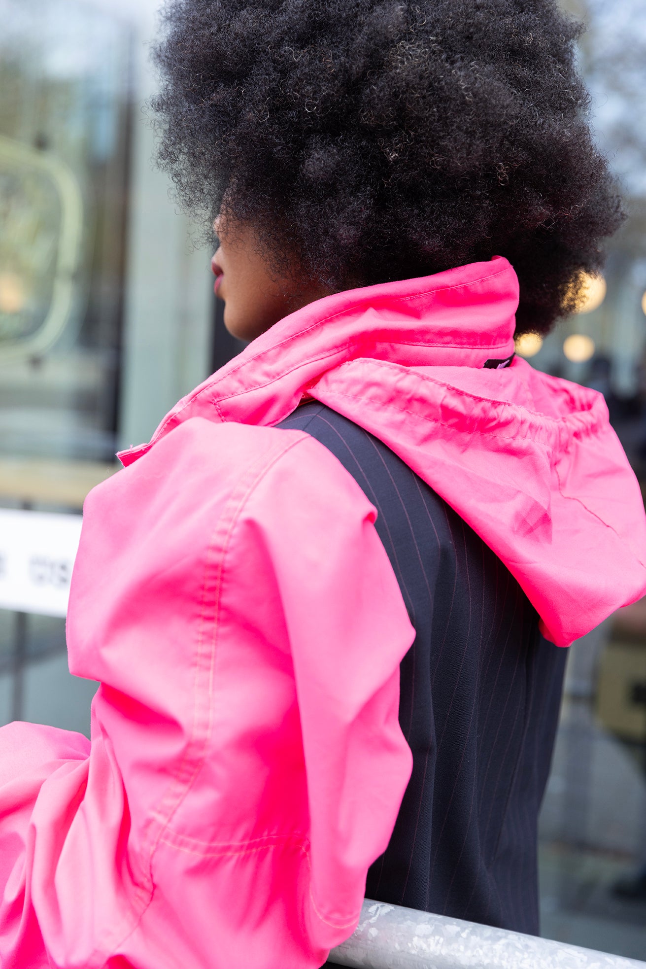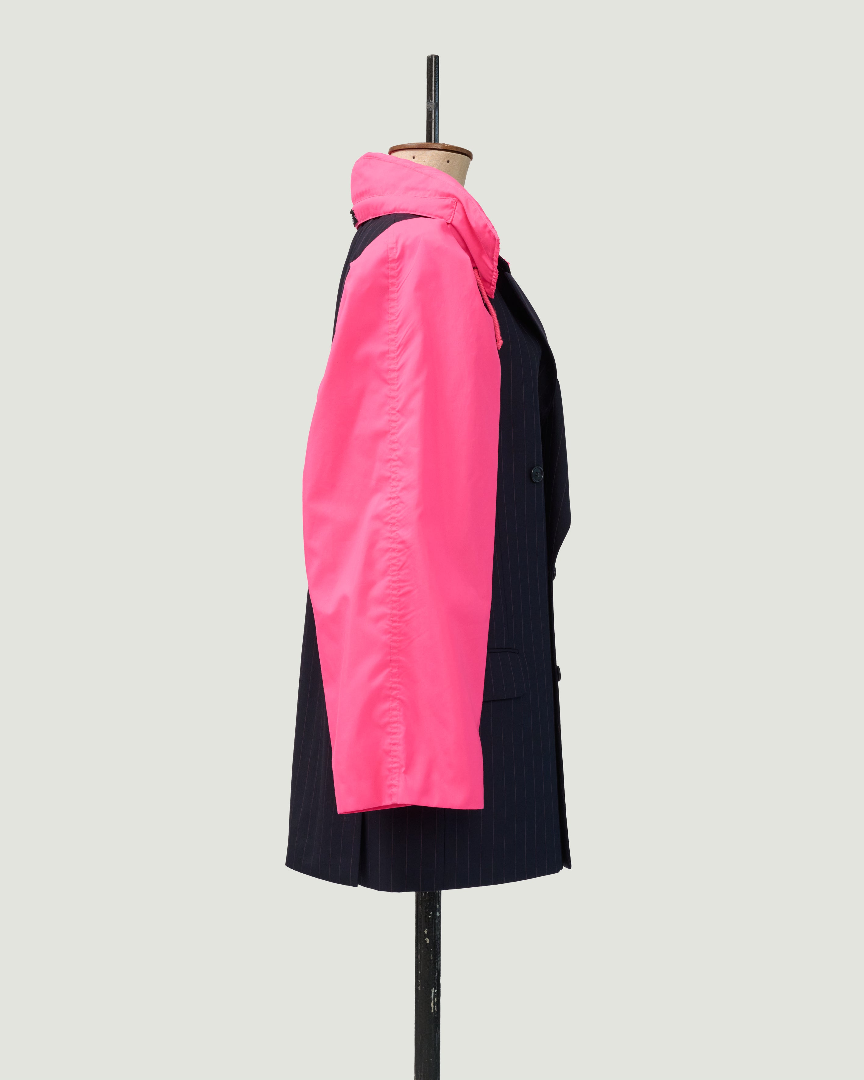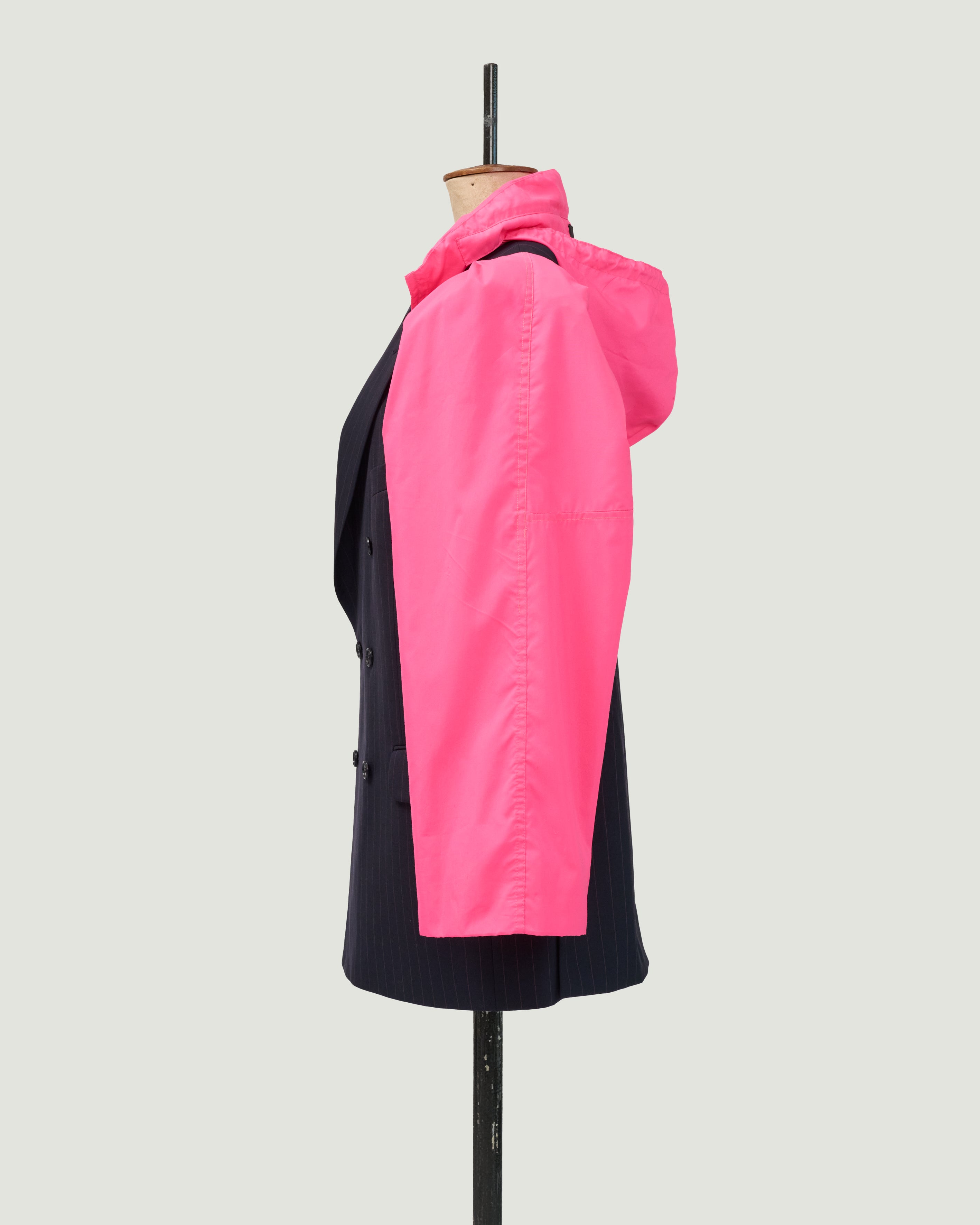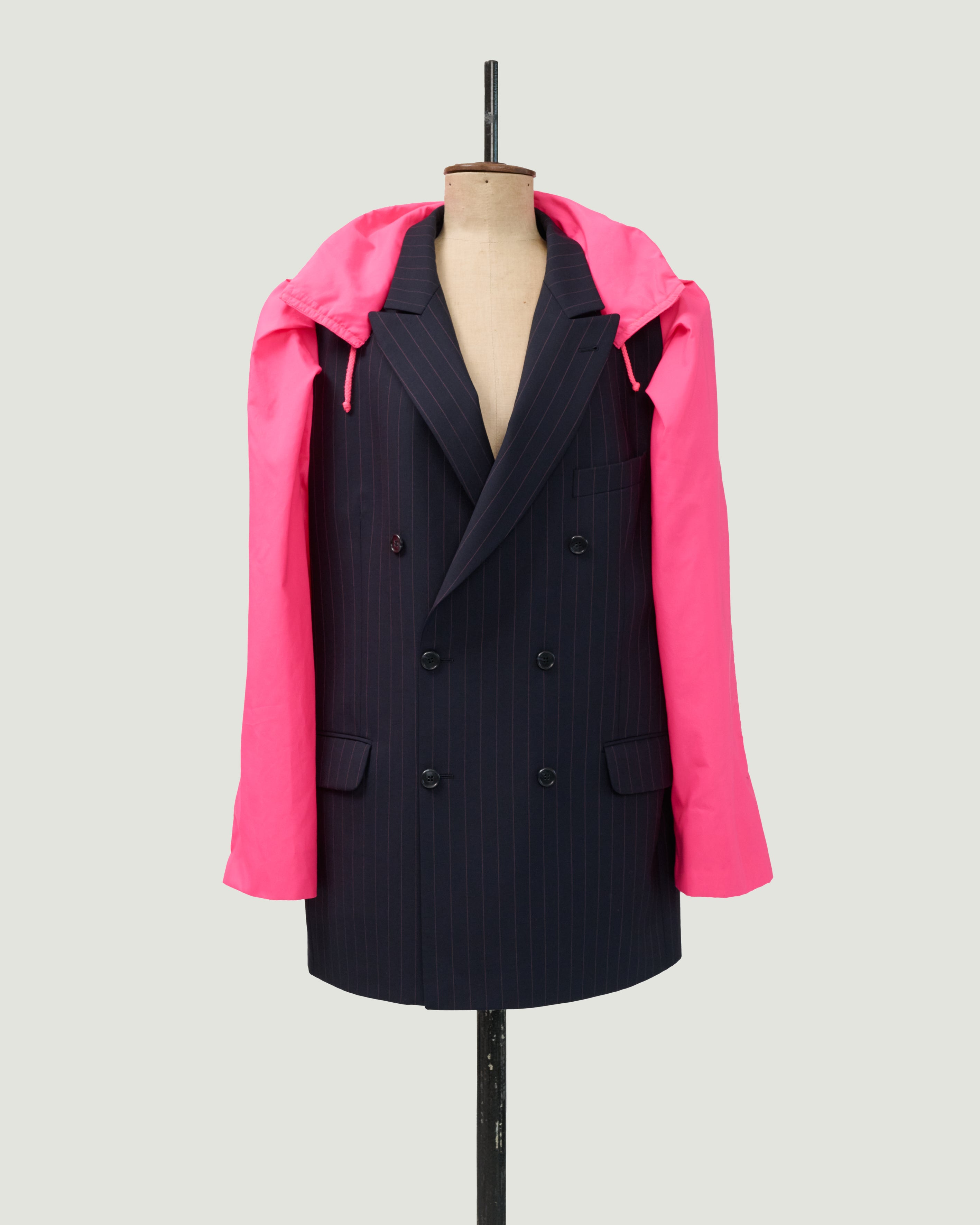 PUFF is een samengesteld design uit een gedumpte zwart-blauw met roze krijtstrepen blazer en een nooit-meer-gedragen knalroze sportjack. De blazer heeft royale pofmouwen en een ruime kraag met uitneembare capuchon. Door de dubbele knoopsluiting valt de blazer recht, casual of chic én deze blazer kan ook als jurk gedragen worden.