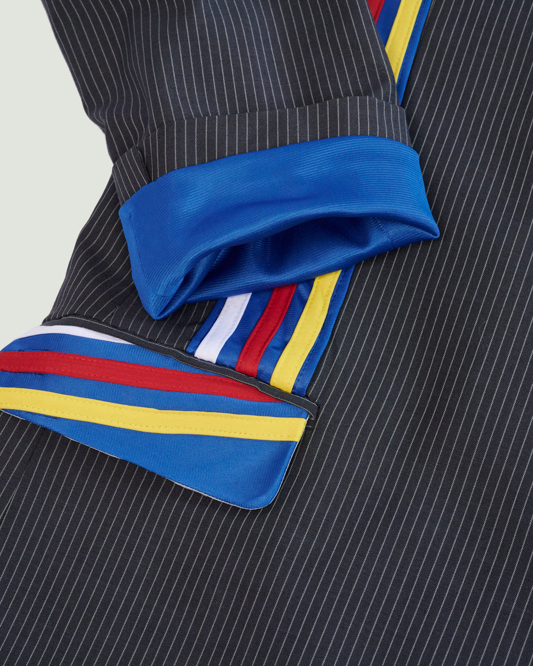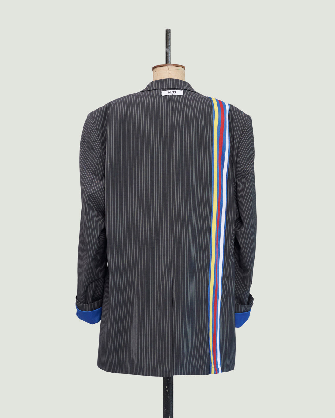RAINBOW is een samengesteld design uit een ruim zwart krijtstreep blazer en een blauw afgedankt sportjack. De mouwen zijn gevoerd in blauw en hoog oprolbaar. De strepen over de schouder geeft de blazer een extra lange look. Hij valt vrij recht, is unisex en je draagt hem oversized.