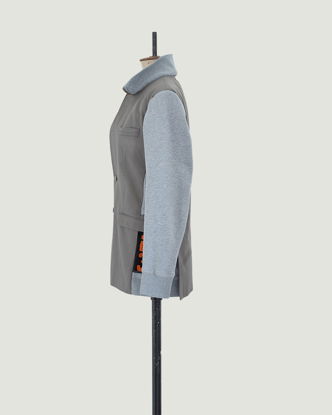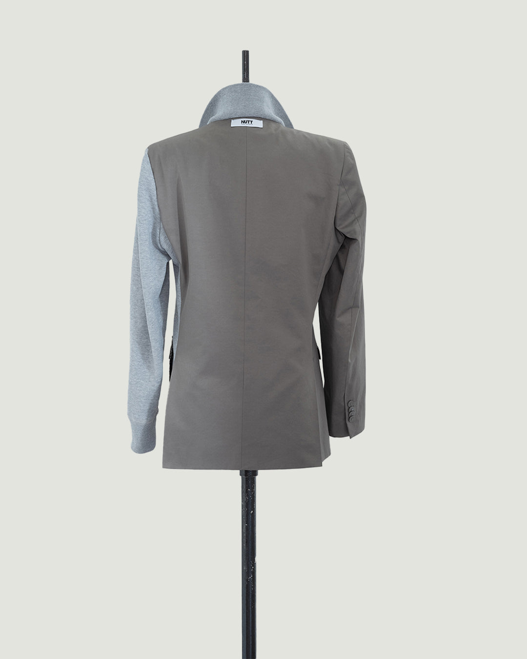 TAUPE is een samengesteld design uit een nooit-meer-gedragen getailleerde blazer en een gedumpte sporty sweater. De blazer heeft opgestikte cijfers op de heup, een hoogstaande kraag en sluit hoog met twee knopen.