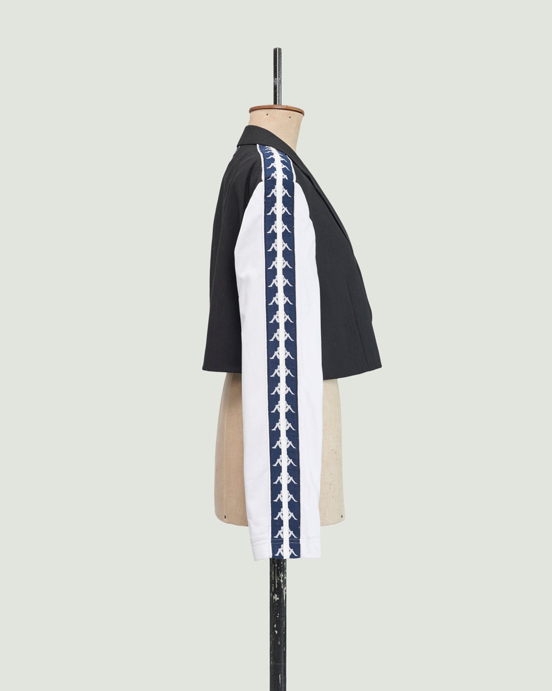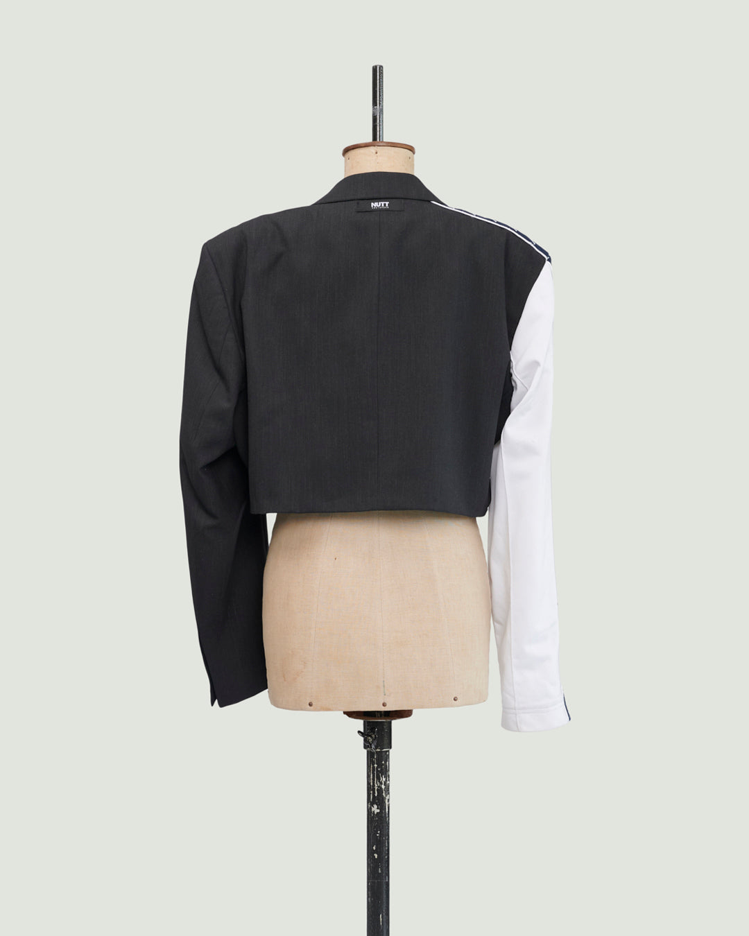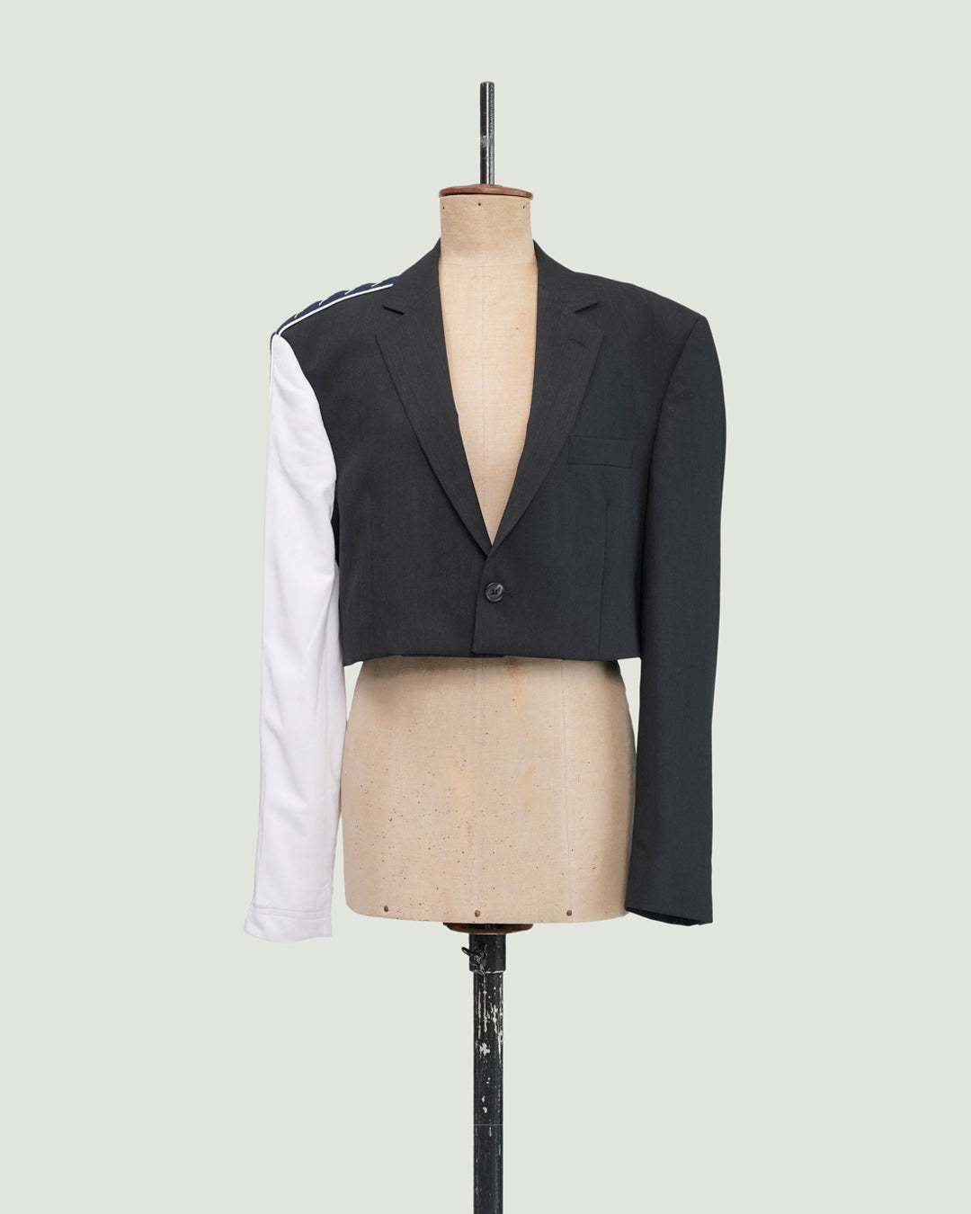 TOP is een samengesteld design uit een donkergrijze afgedankte blazer en een nooit-meer-gedragen witte trainingsbroek. De blazer is kort en sluit met een knoop in de taille.
