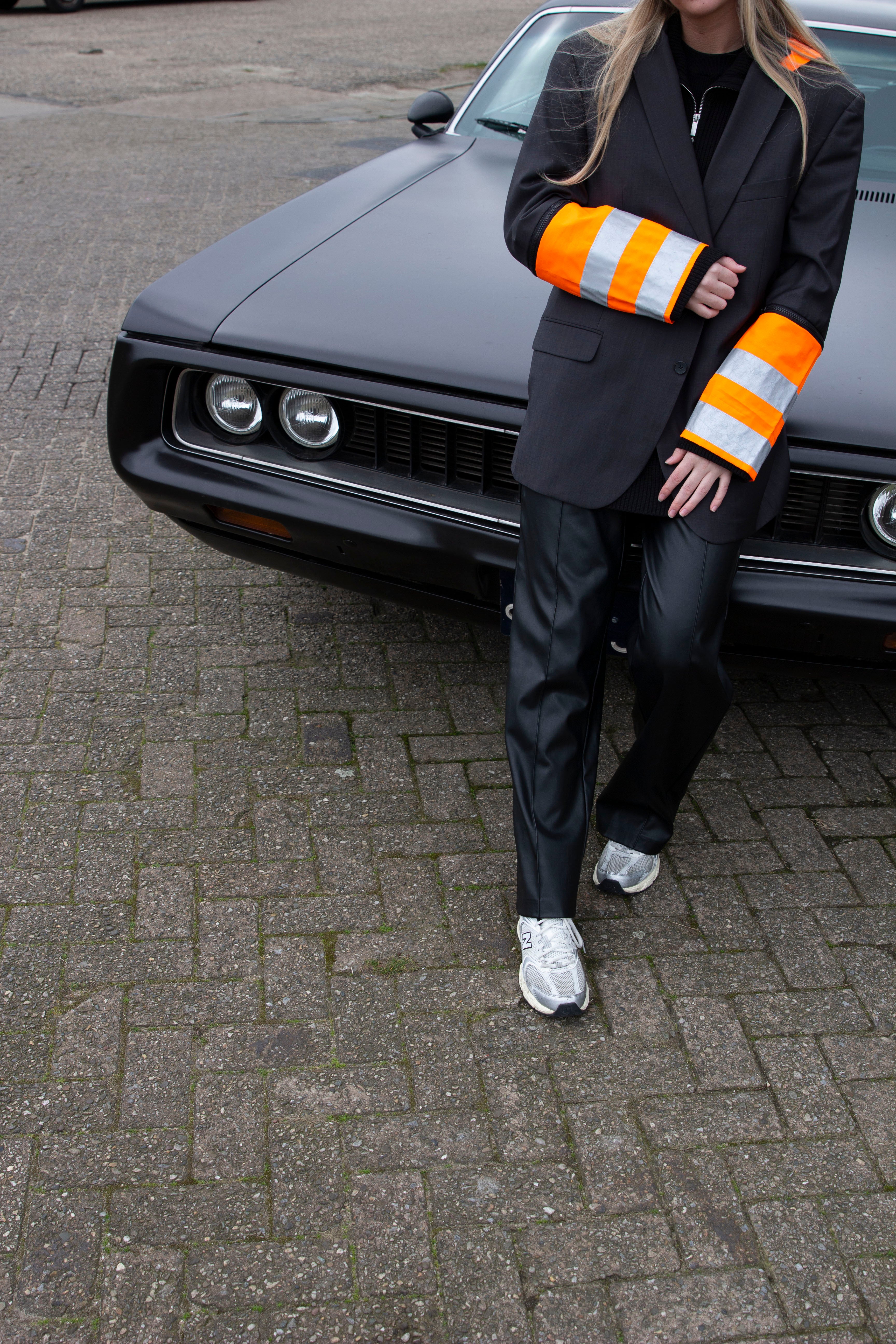 WORK is een samengesteld design van een afgedankte bruine blazer en een weggegooide werkmansbroek. Deze blazer is tweeledig te dragen omdat zowel de neon mouwen als de capuchon afritsbaar / afknoopbaar zijn waardoor er een oversized soepelvallende effen blazer over blijft, met stoere halflange mouwen.