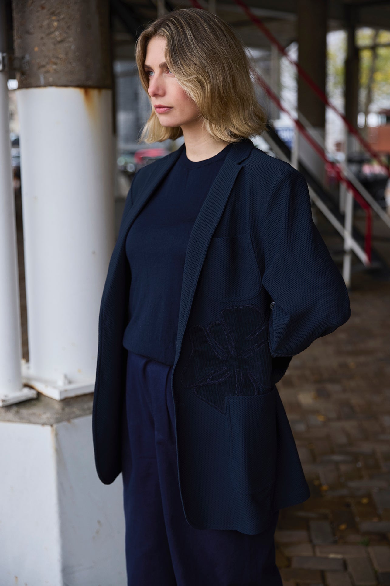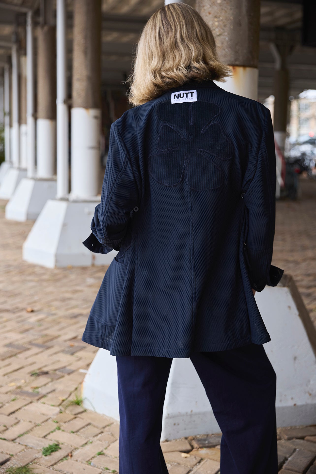 BLEU BLOOM is waar elegantie en attitude samenkomen. Gemaakt uit de additieve stof van een blazer en een ribfluwelen blouse. Deze luxe materialen uit deadstock, onverkochte items, smelten in dit unieke jasje samen tot een frisse, herboren, stijlvolle stijl. Het jasje kreeg een nieuwe vorm en een stoer bloemmotief: een verhaal van transformatie en karakter in beweging.