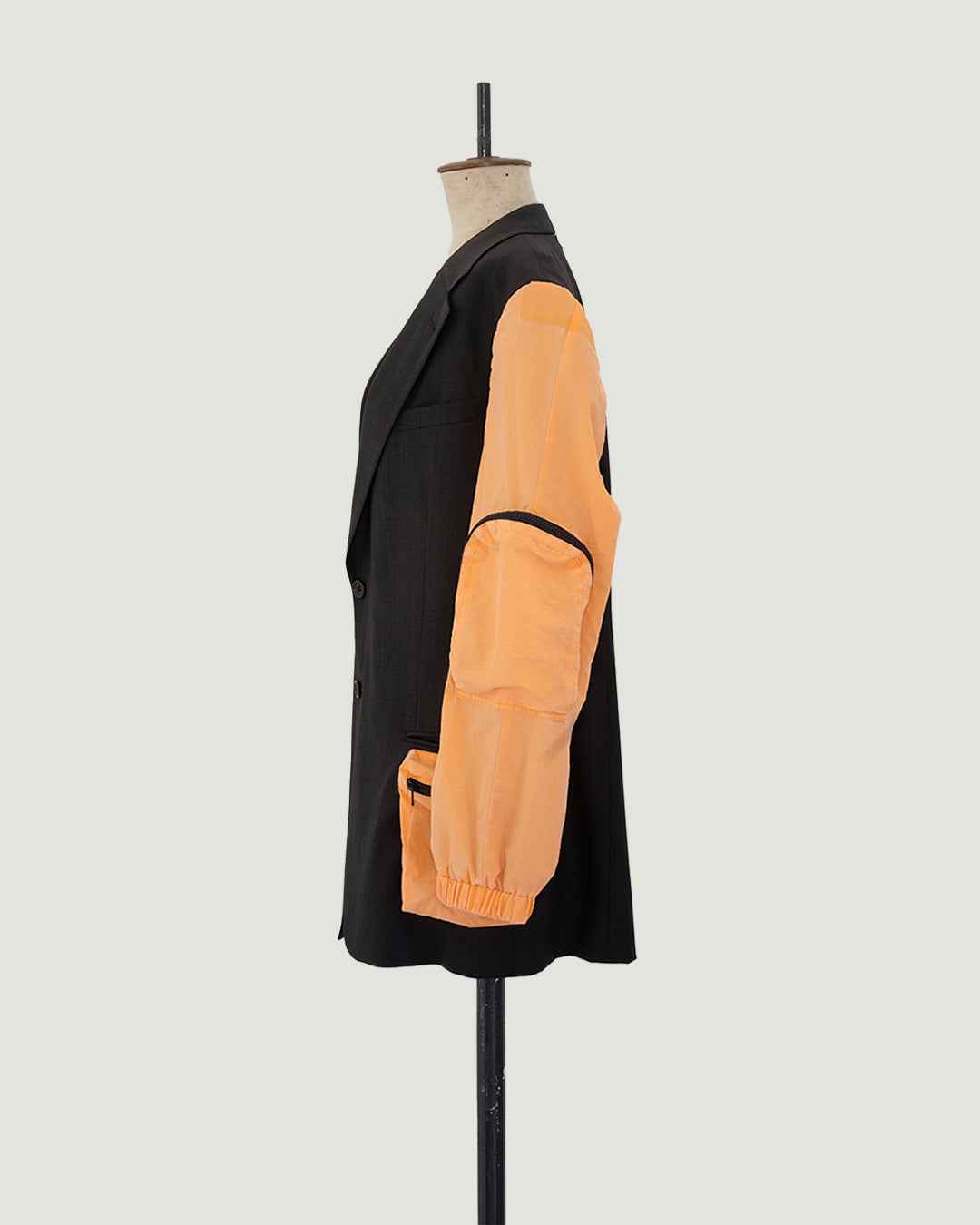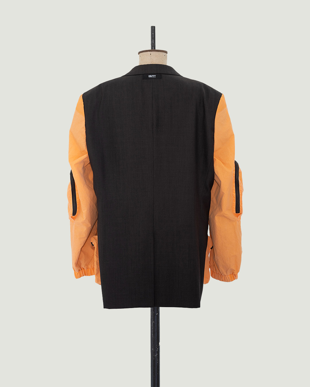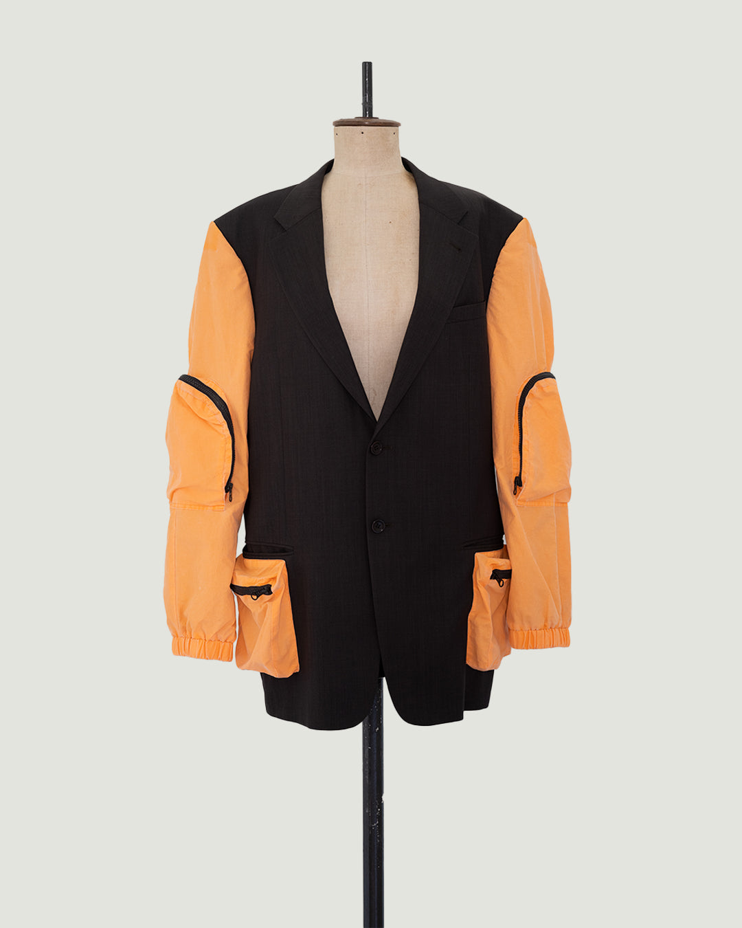 ORANGE is een samengesteld design uit een nooit-meer-gedragen bruine blazer en gedumpte oranje vliegeniers broek met opgestikte zakken. De blazer sluit vrij laag, valt lekker ruim en heeft zakken met ritsen in de mouwen en op de heupen.