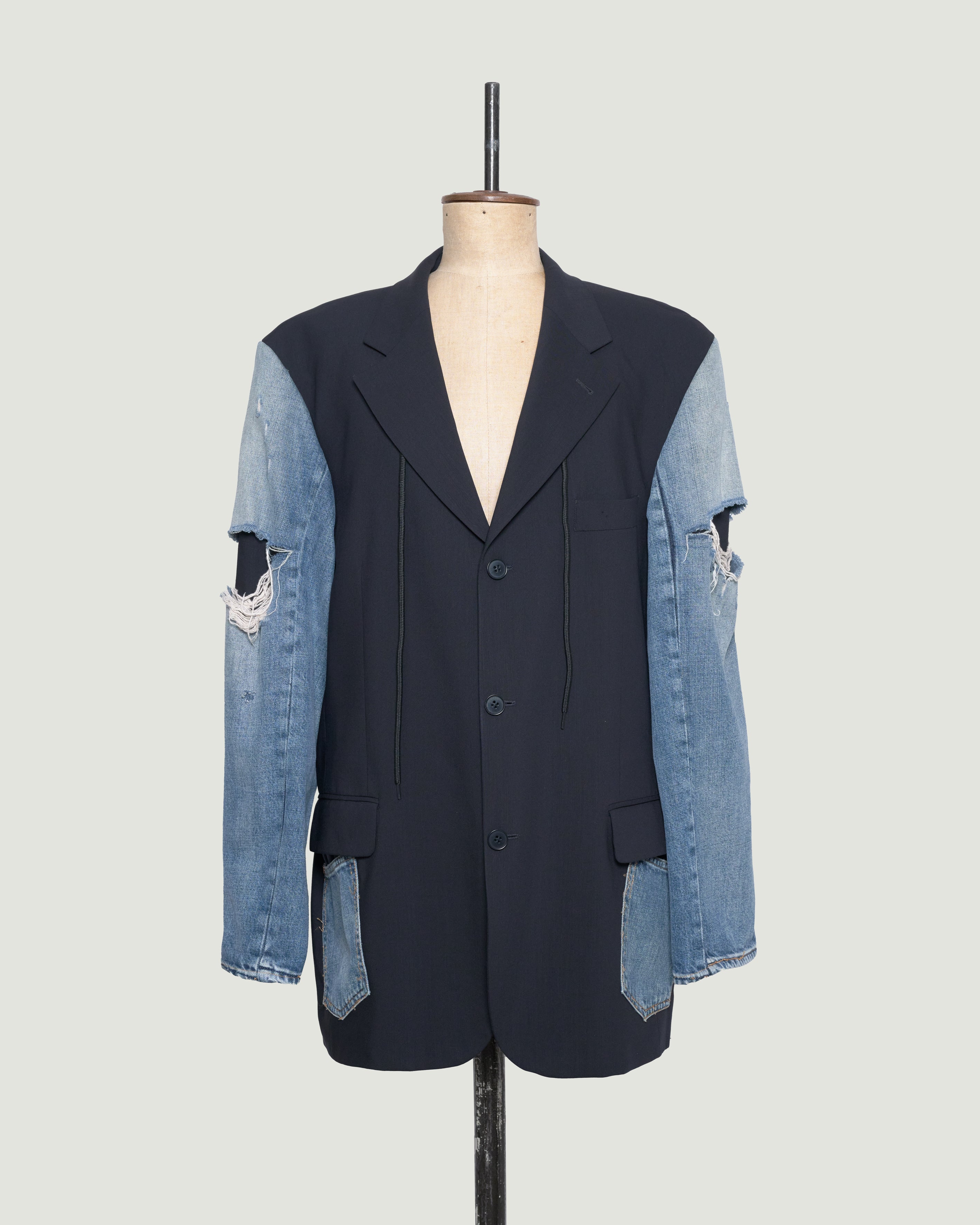 DOUBLE DENIM is een samengesteld design uit een nooit-meer-gedragen donkere blazer en een gedumpte boyfriend jeans. Door de twee steekzakken en het koord om de hals krijgt de blazer een sportieve look. Hij is voor iedereen en kan ook casual of chique gedragen worden.