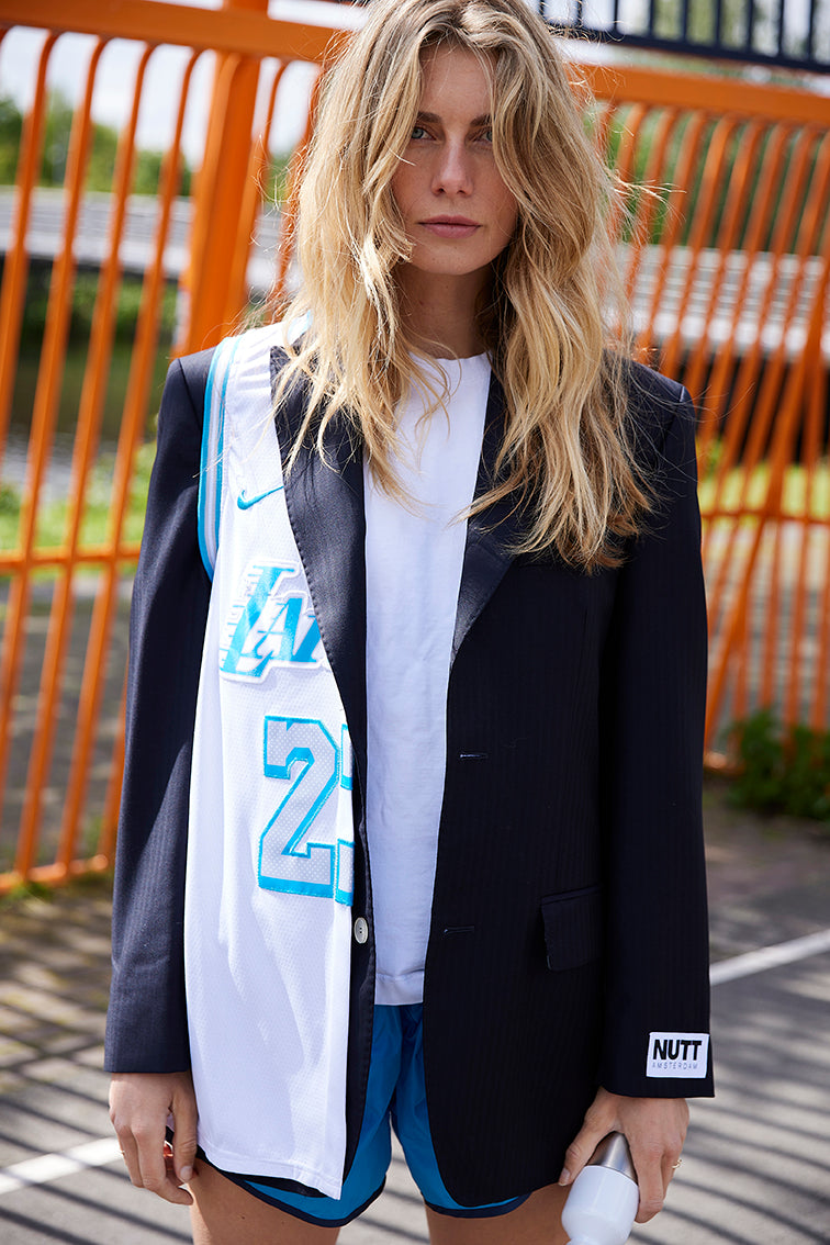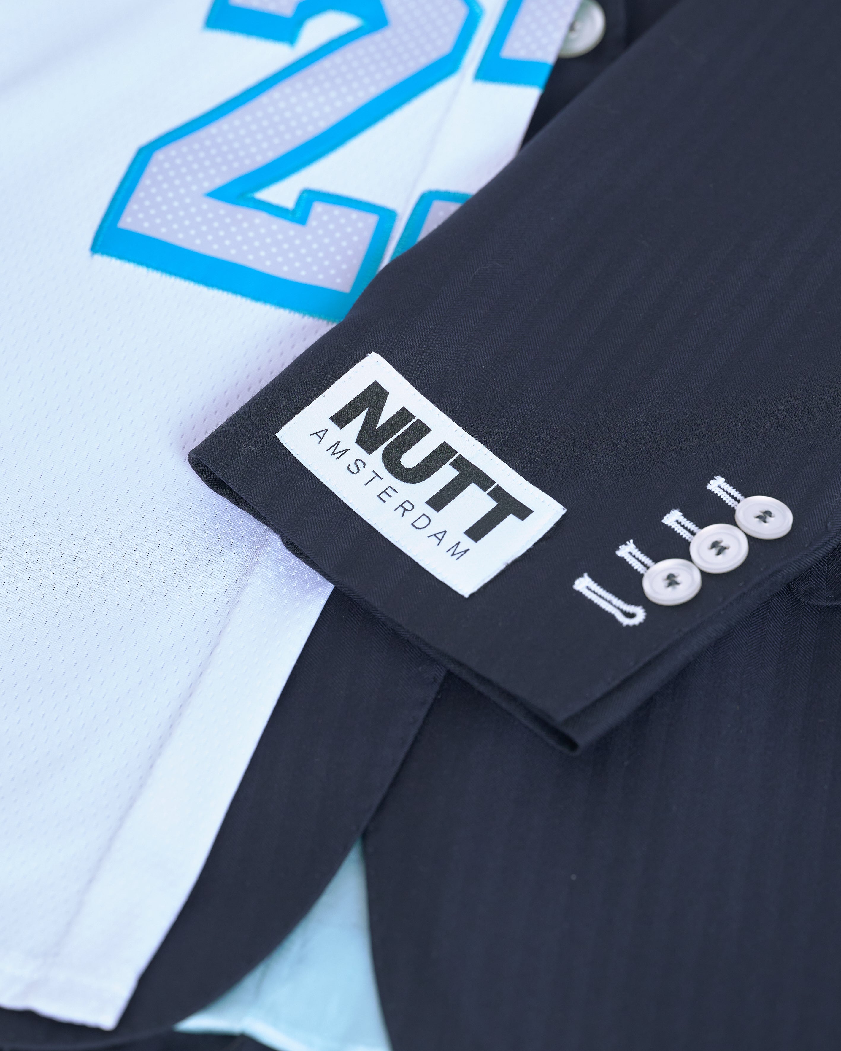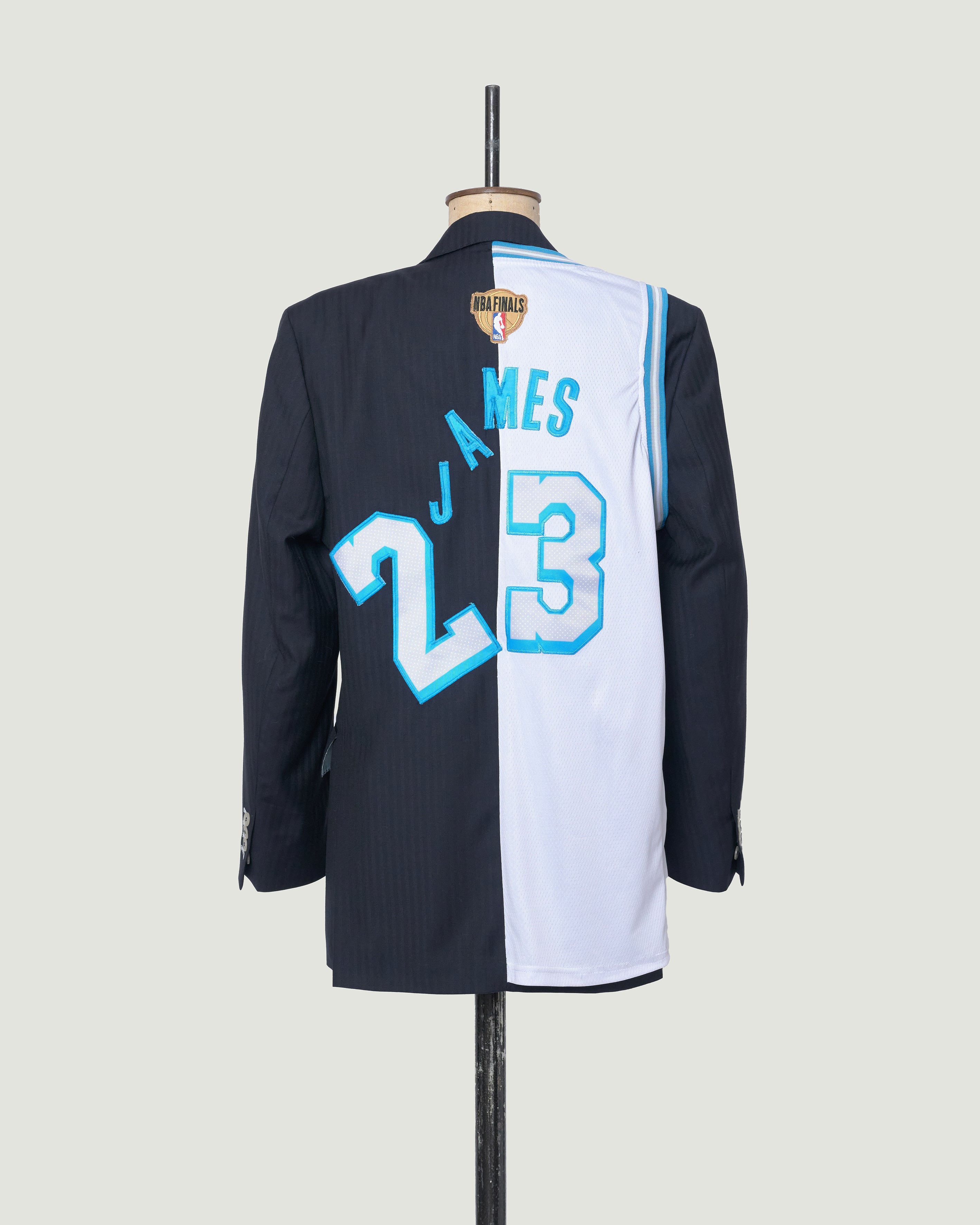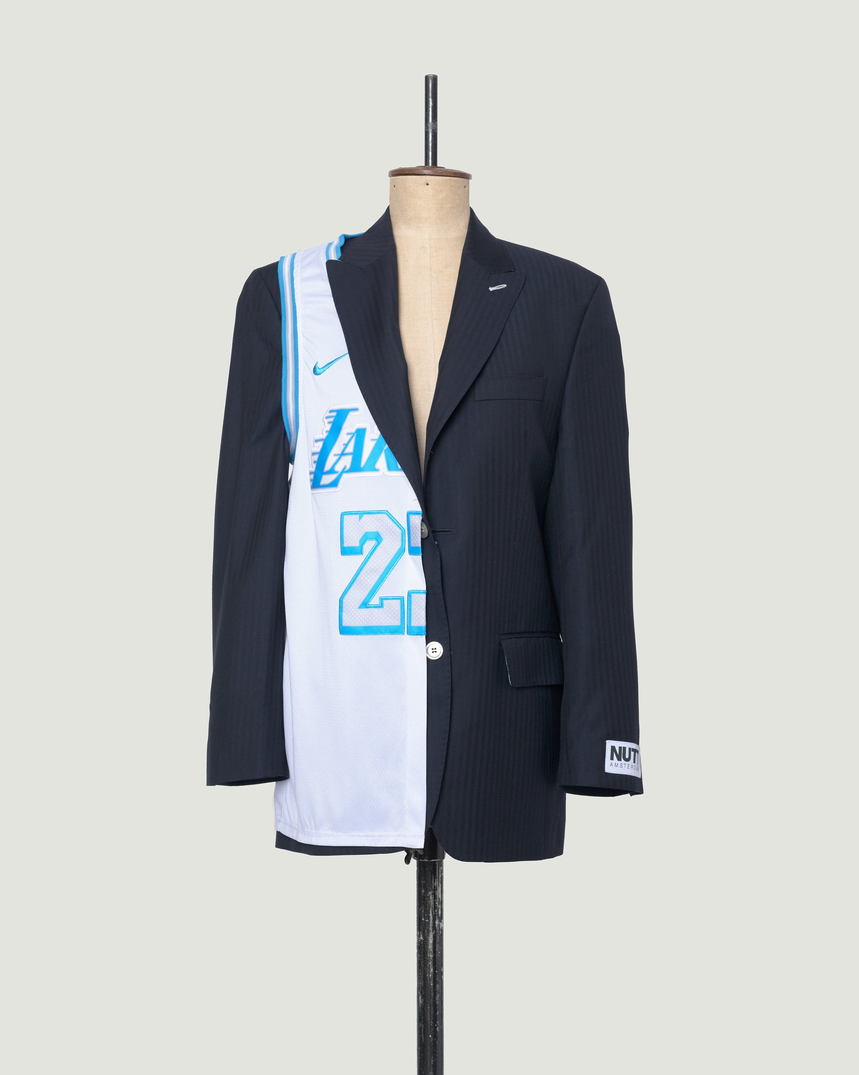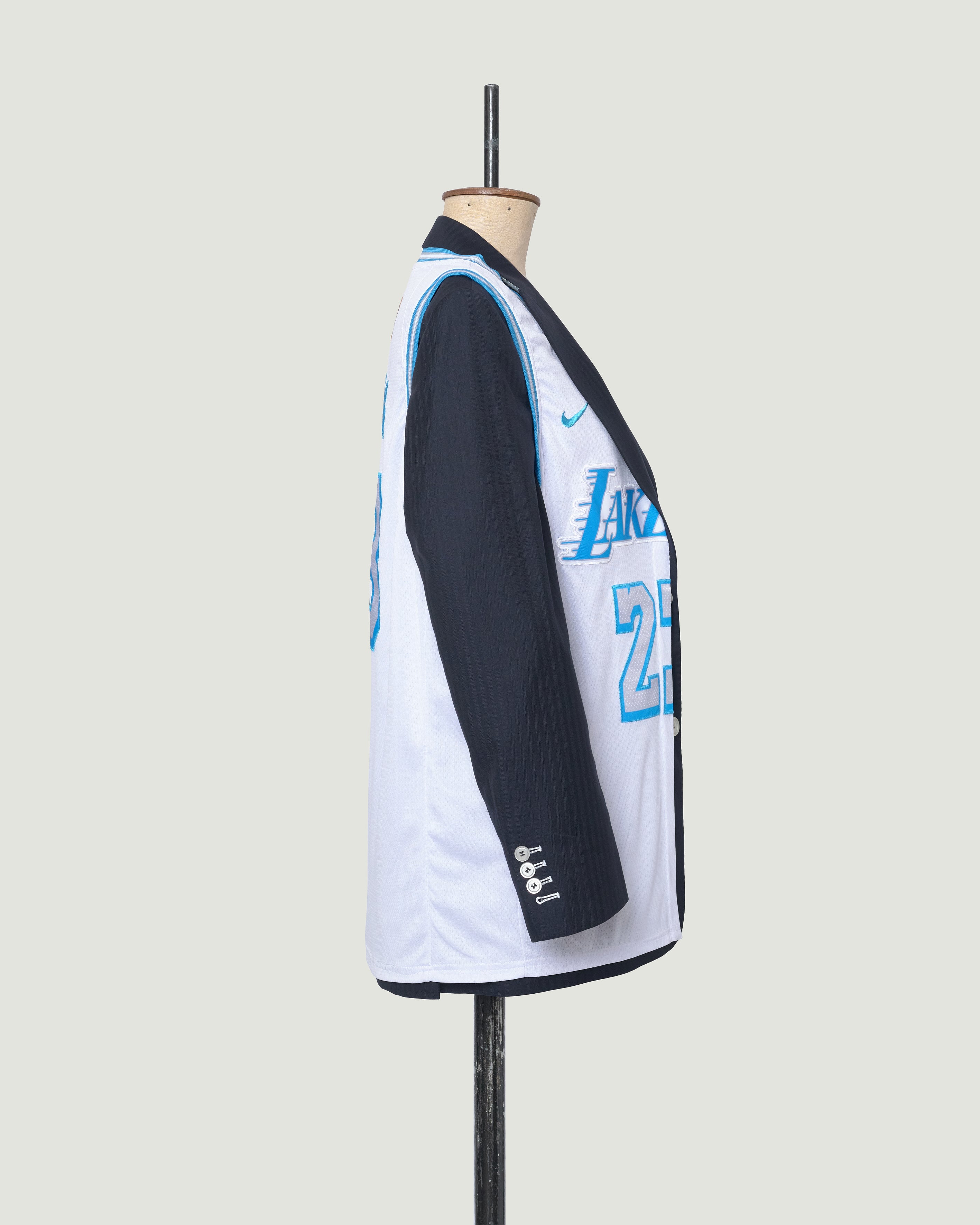 JAMES is een samengesteld design uit een afgedankte klassiek blauwe blazer in geweven wollen fijne streep en een gedumpte, hagelwit Lakers basketball shirt. Het grote contrast in kleur, stijl en eigenwijze design maakt deze blazer tot een serieus statement piece. Hij draagt soepel en is voor iedereen.