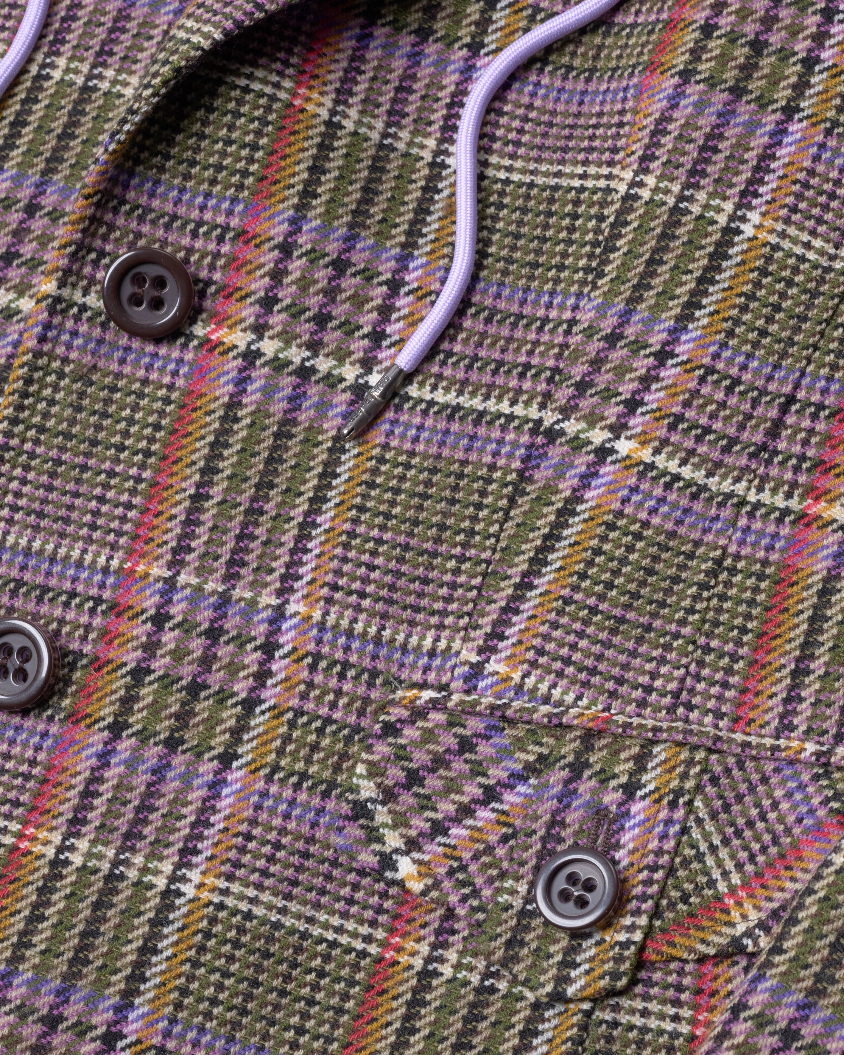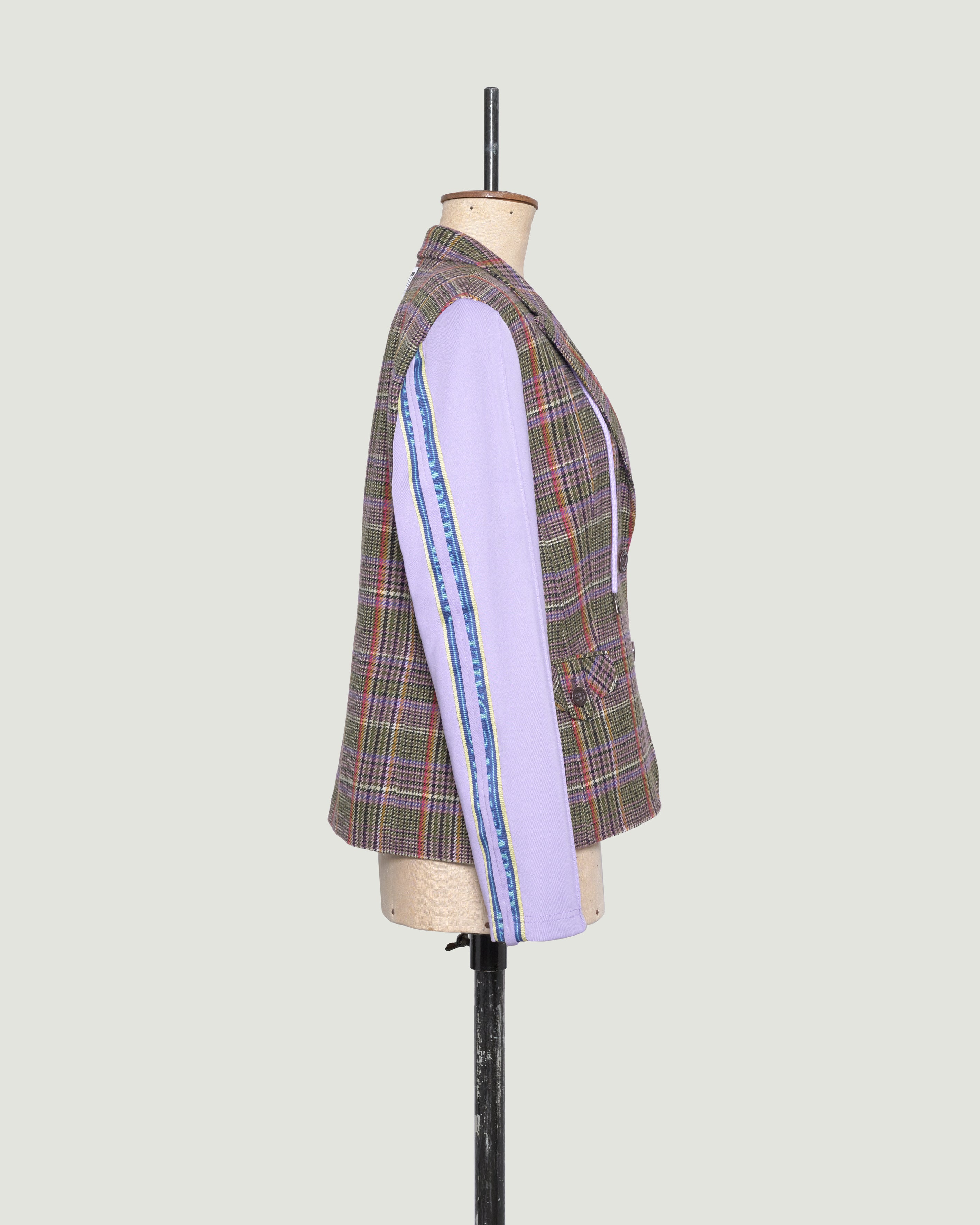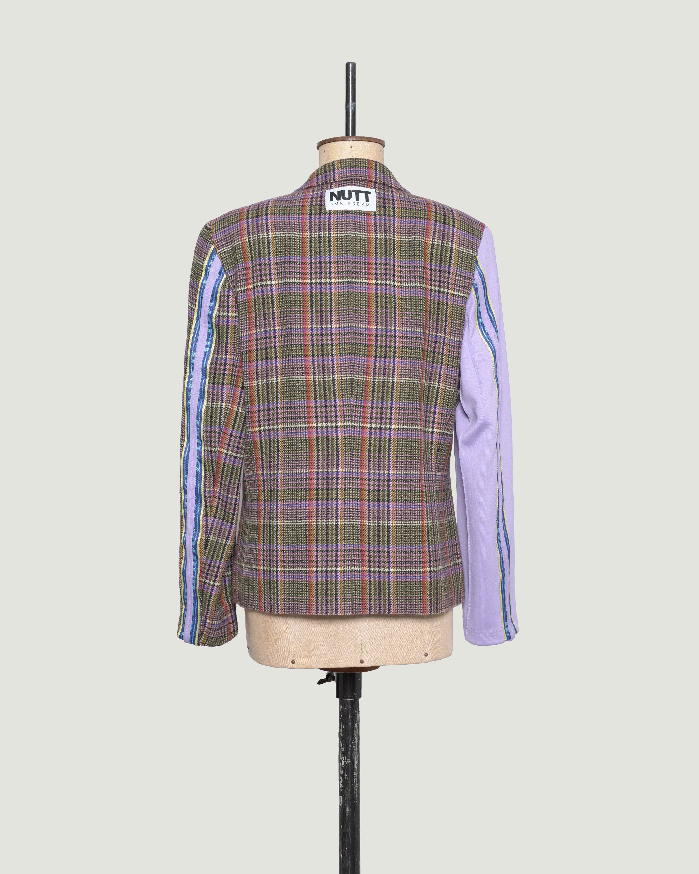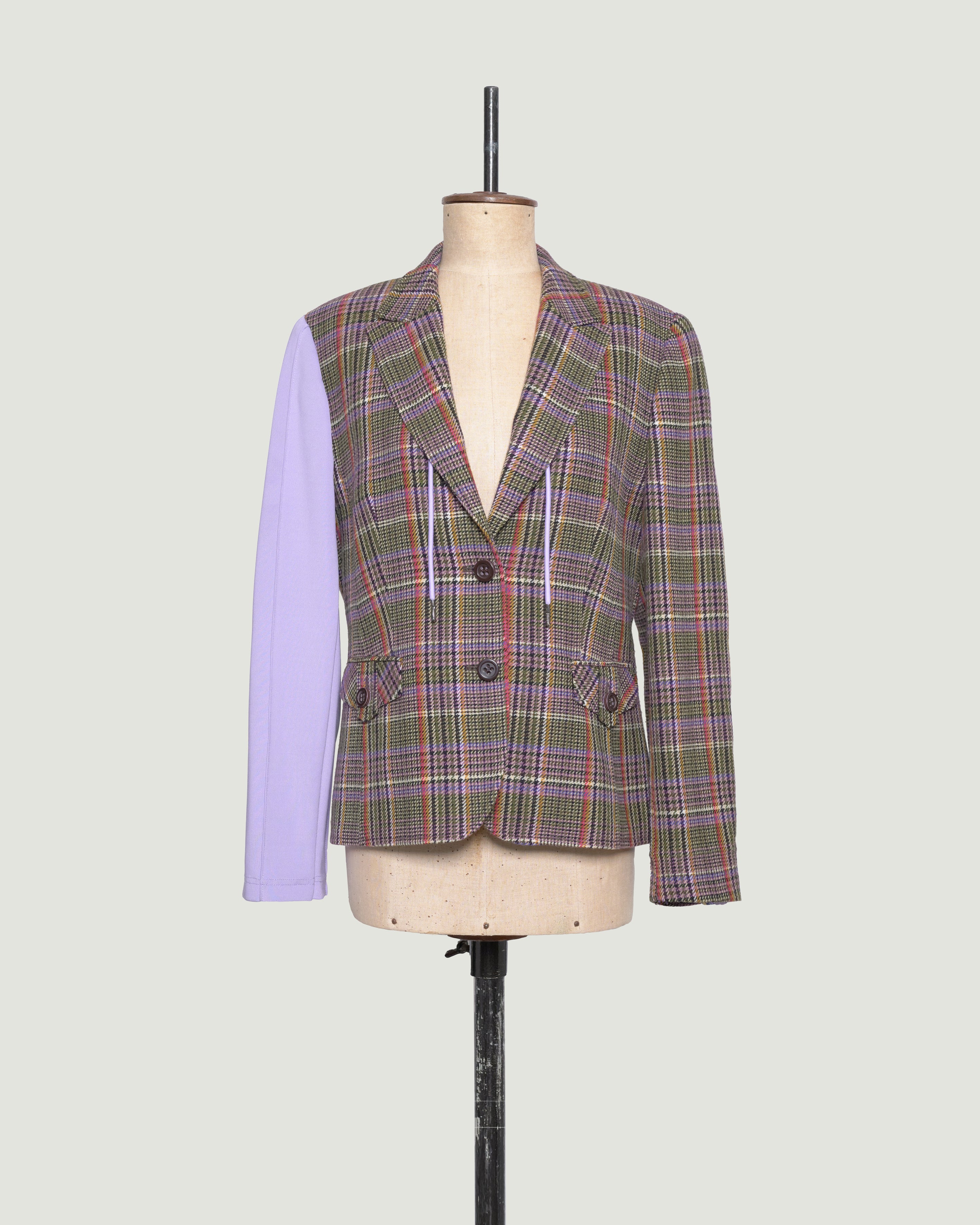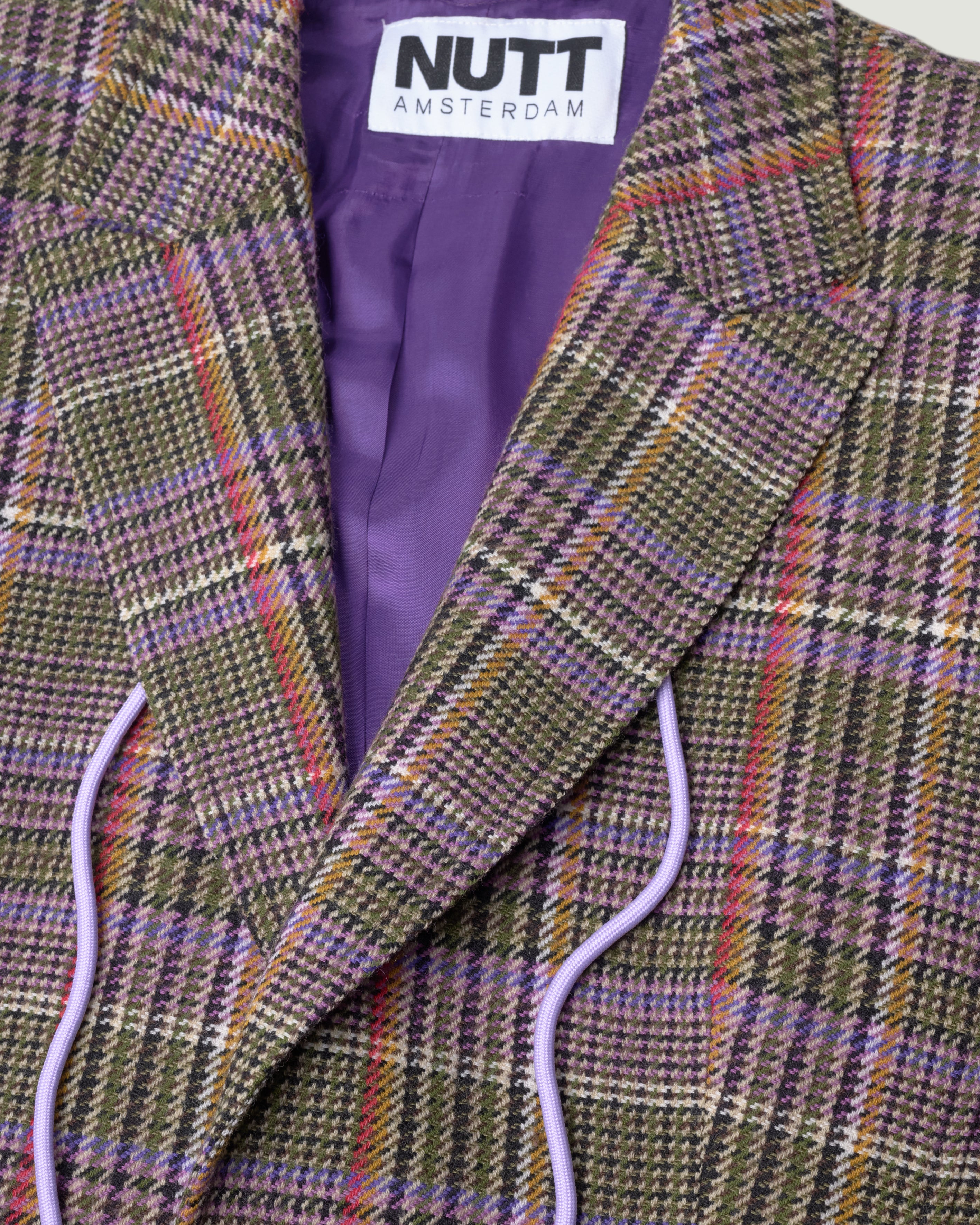 LILAC is een samengesteld design uit een gedumpte multicolored blazer en een nooit-meer-gedragen lila sportbroek. De getailleerde pied-de-poule blazer heeft een opvallende paarse voering, klassieke zakkleppen en een lila koord om de nek. Je draagt hem passend en kan zowel casual als chique.