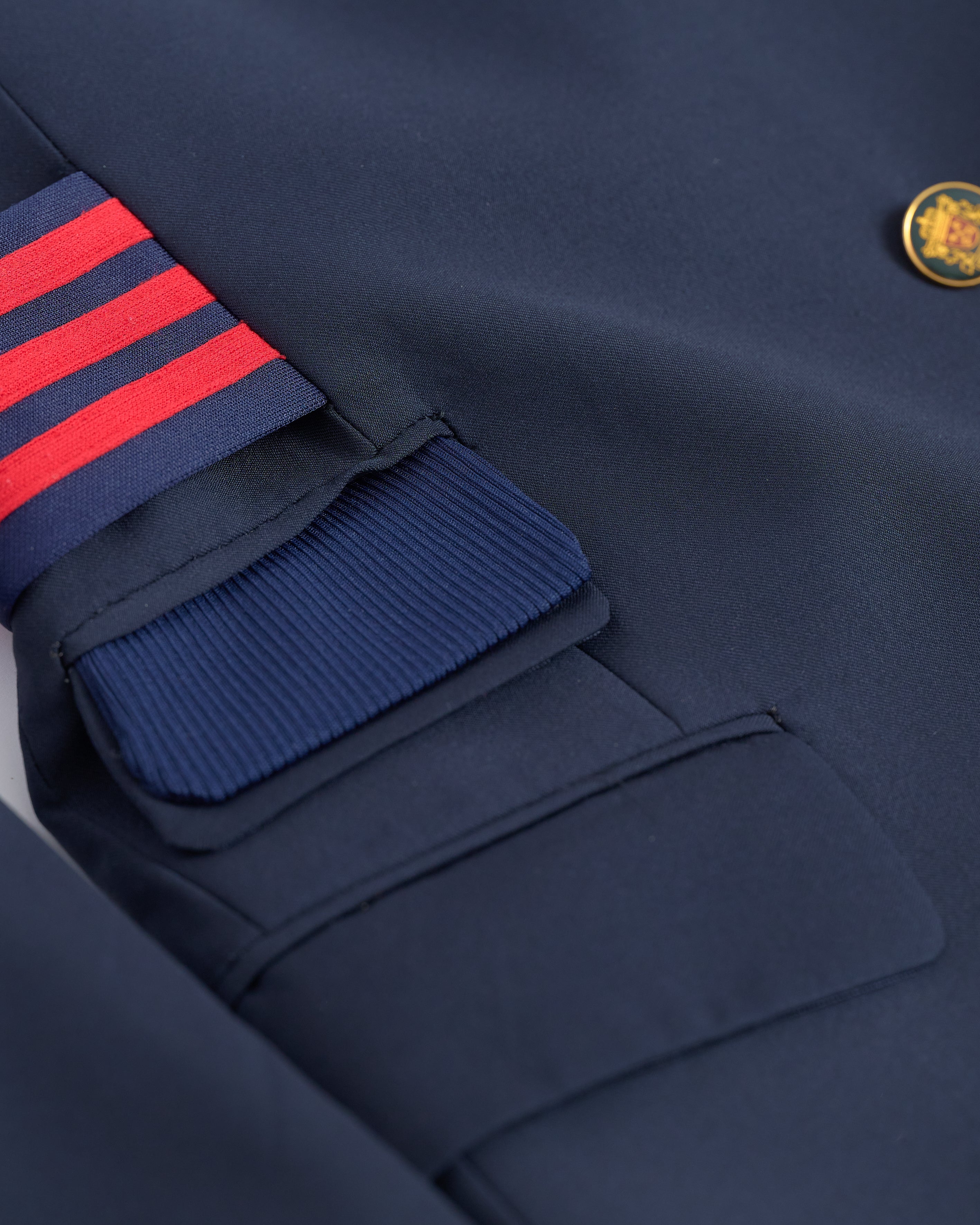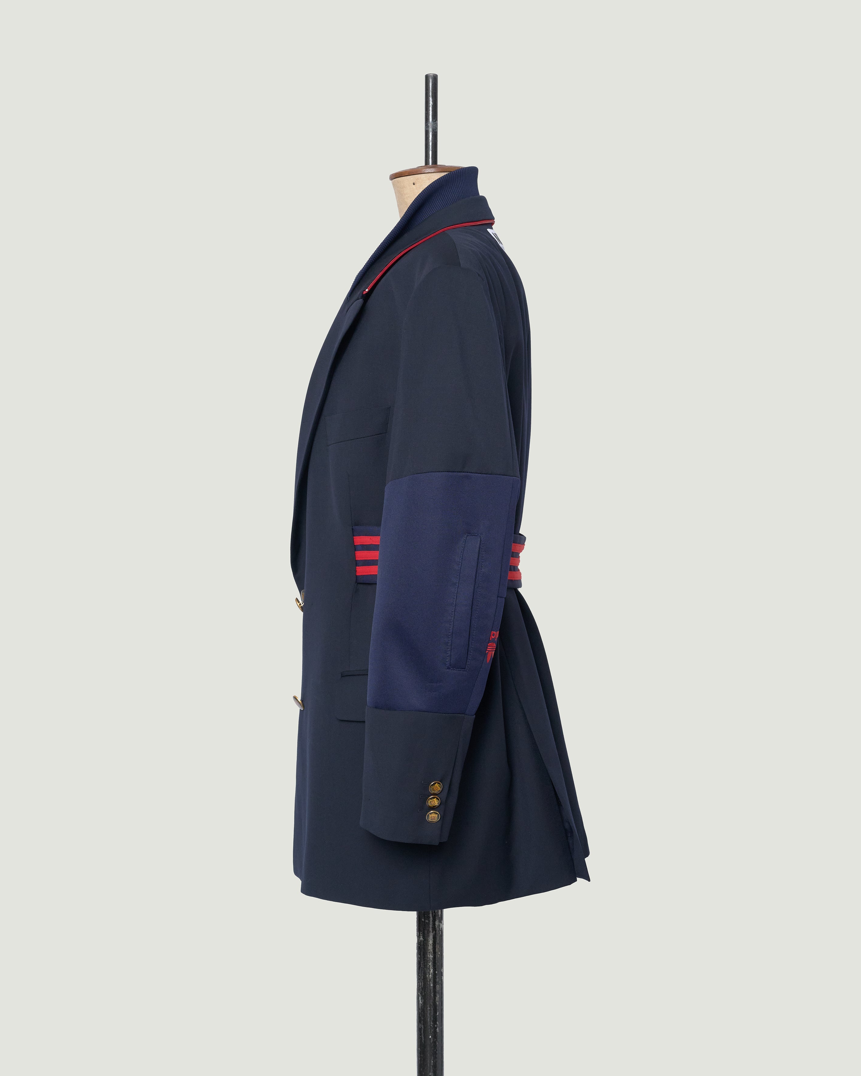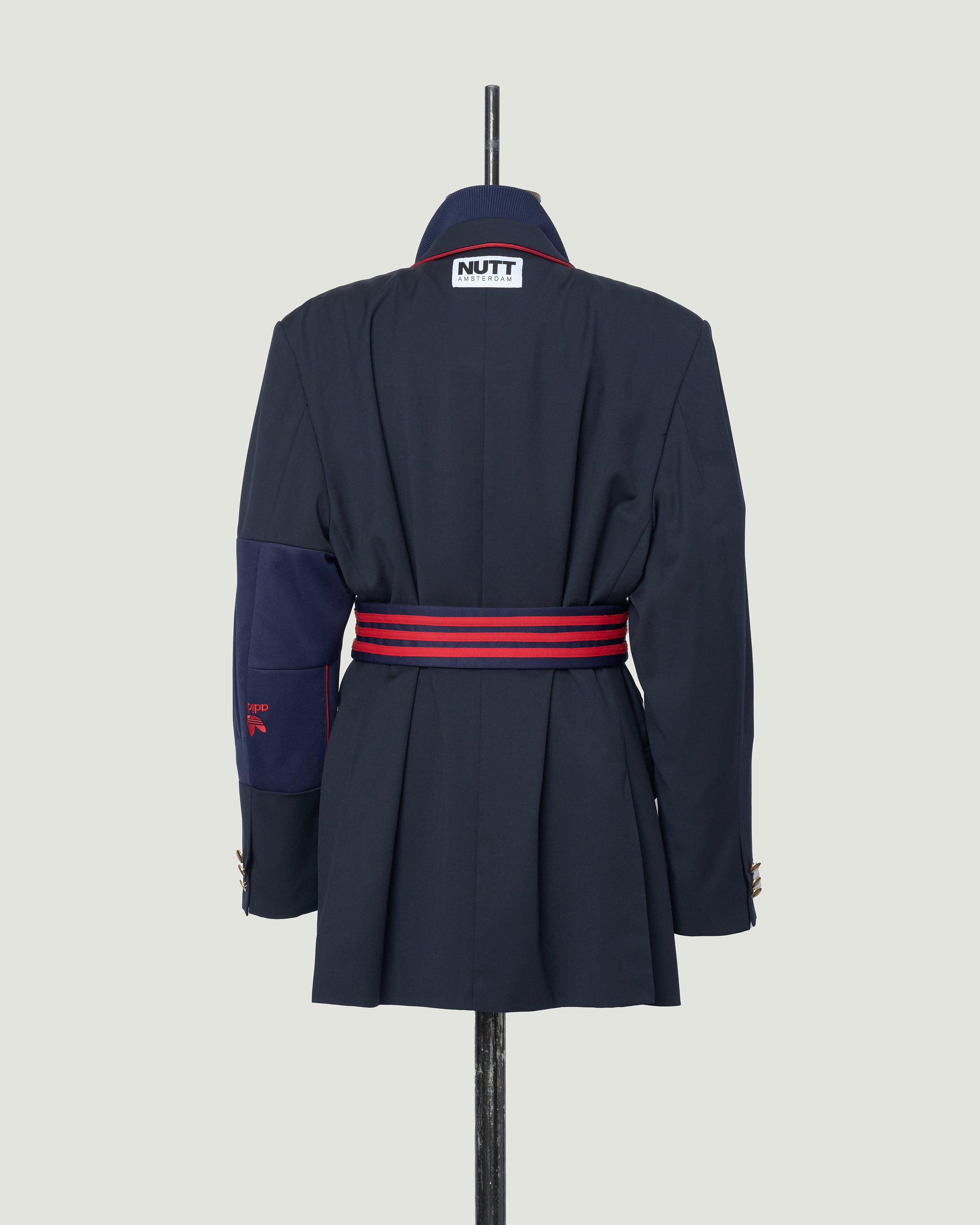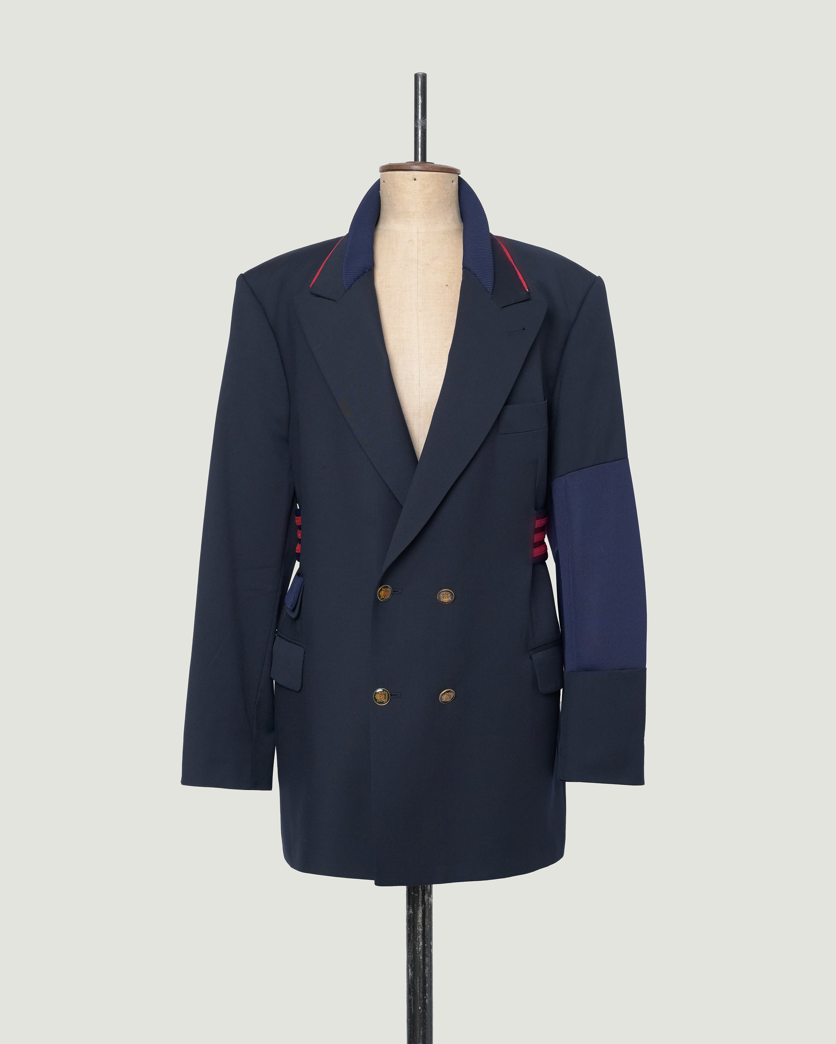 MARINE is een samengesteld design uit een nooit-meer-gedragen donkerblauw klassieke blazer en een gedumpte donkerblauwe sportjack. De blazer valt soepel en ruim maar door de opvallende taillering draagt hij passend. Door de combinatie van double breasted met goudkleurige knopen en de sportieve details in de mouw en in de kraag draag je hem zowel klassiek als sportief.