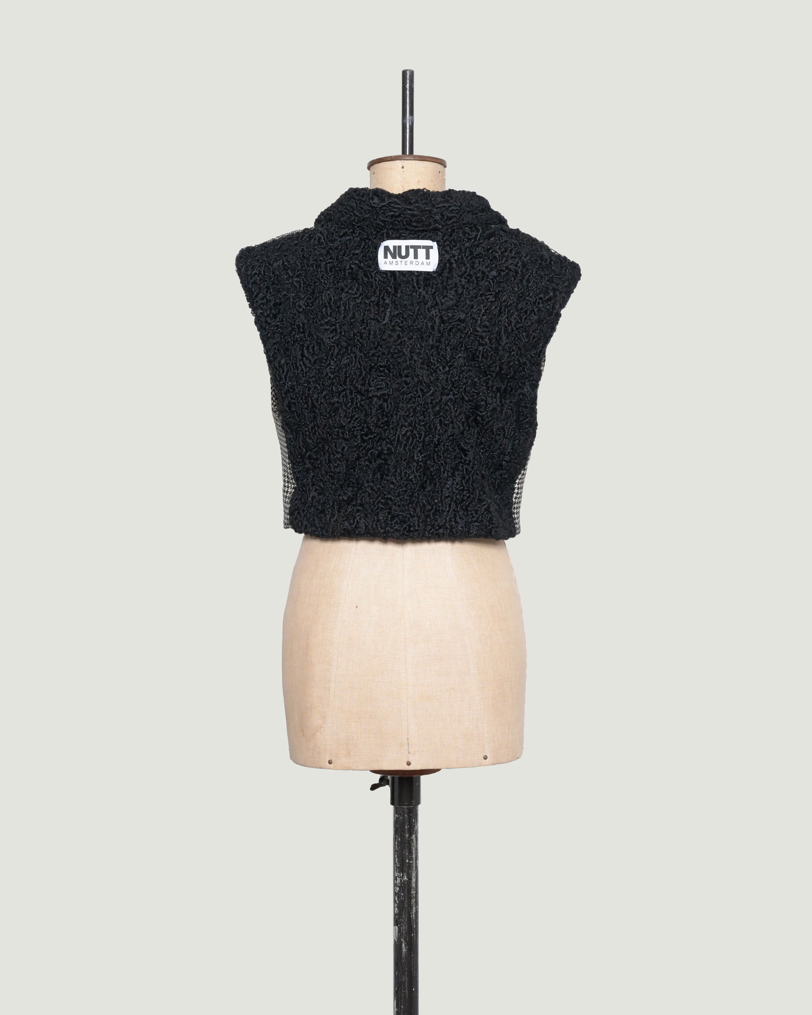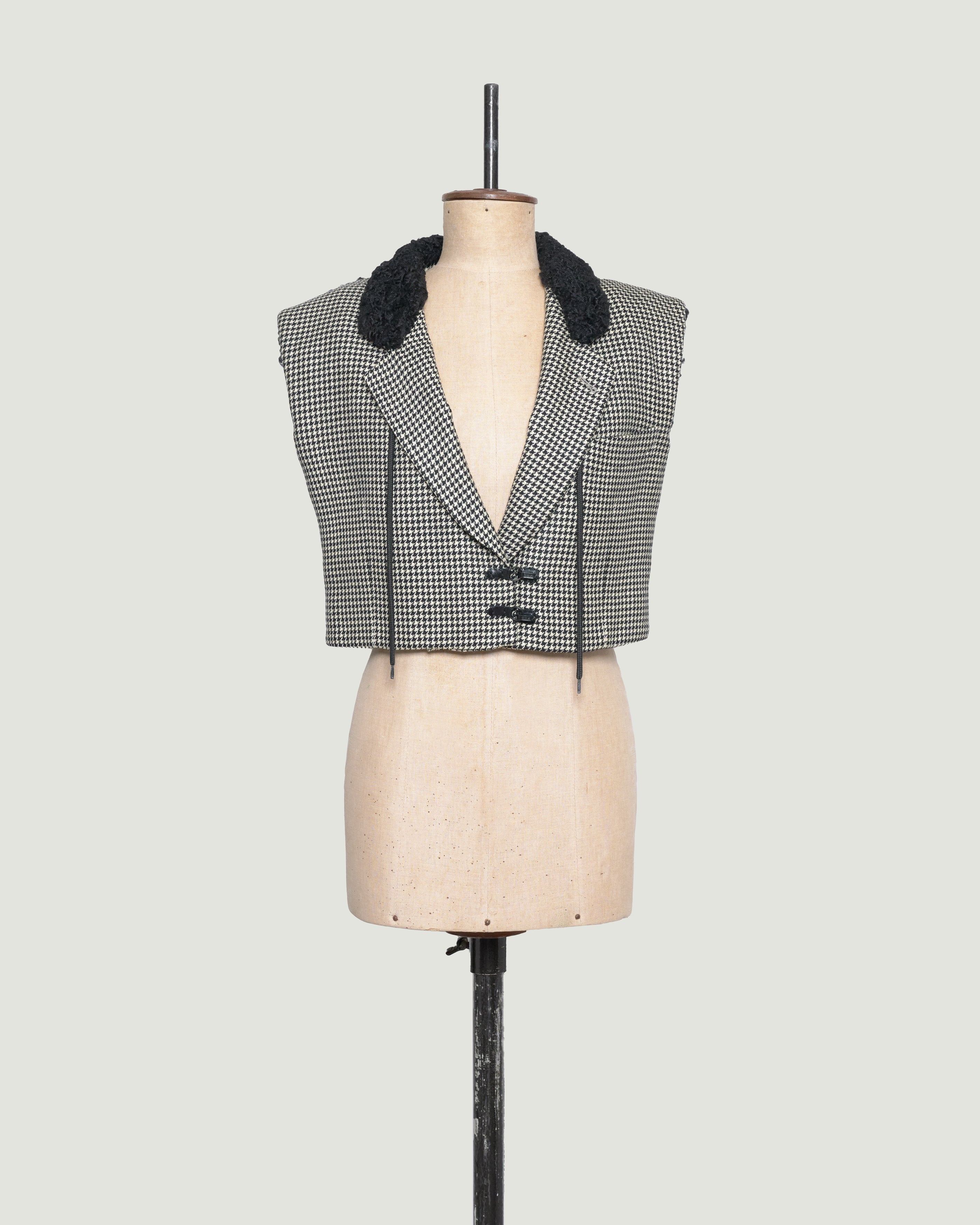 MIKE is een samengesteld design uit een afgedankte grijze blazer in pied-de-poule patroon en een nep bonten jas. Het ultrakorte, mouwloze jasje heeft een stoere look door de bijzondere sluiting en koord om de hals. Je draagt hem passend, zowel chique als casual.
