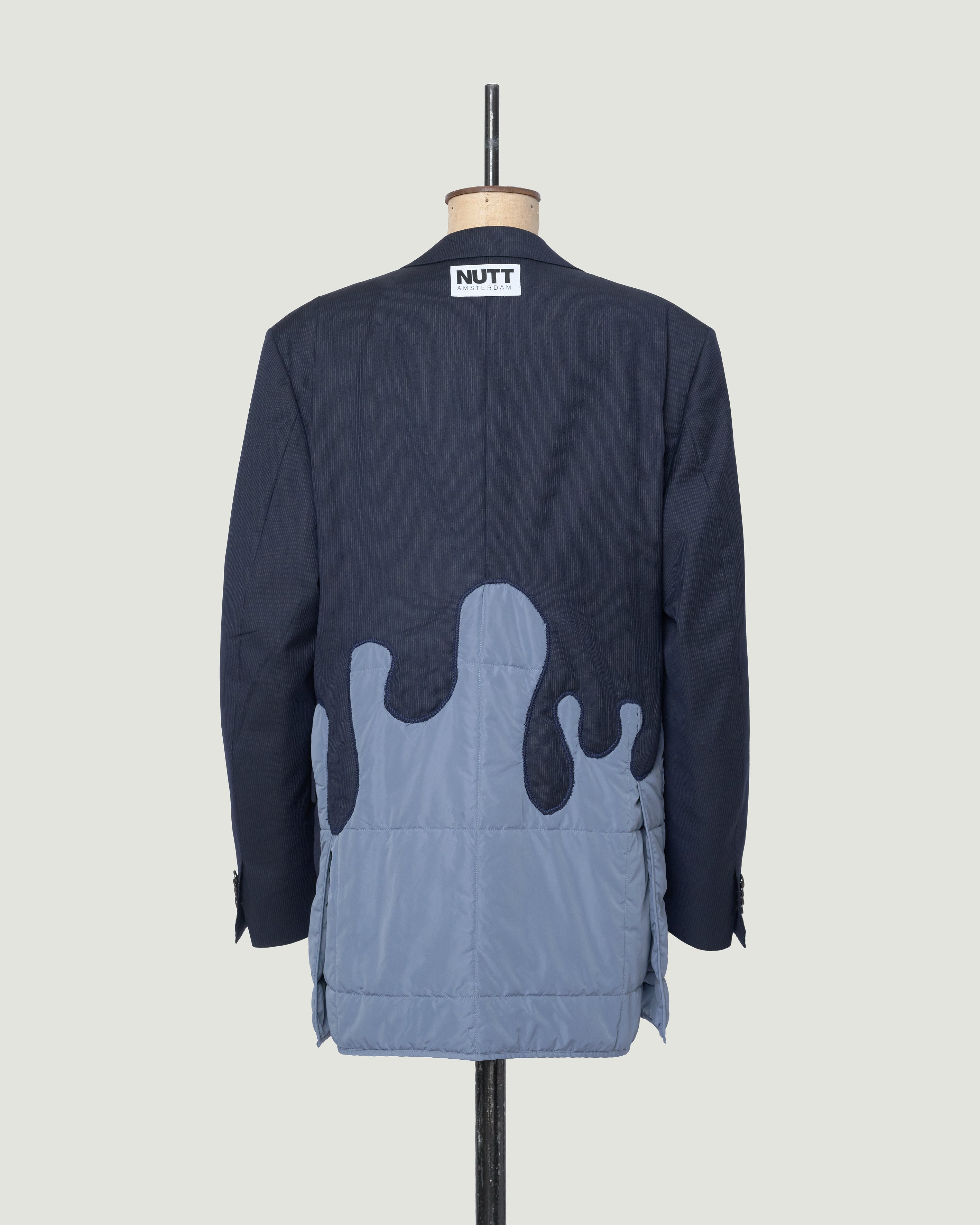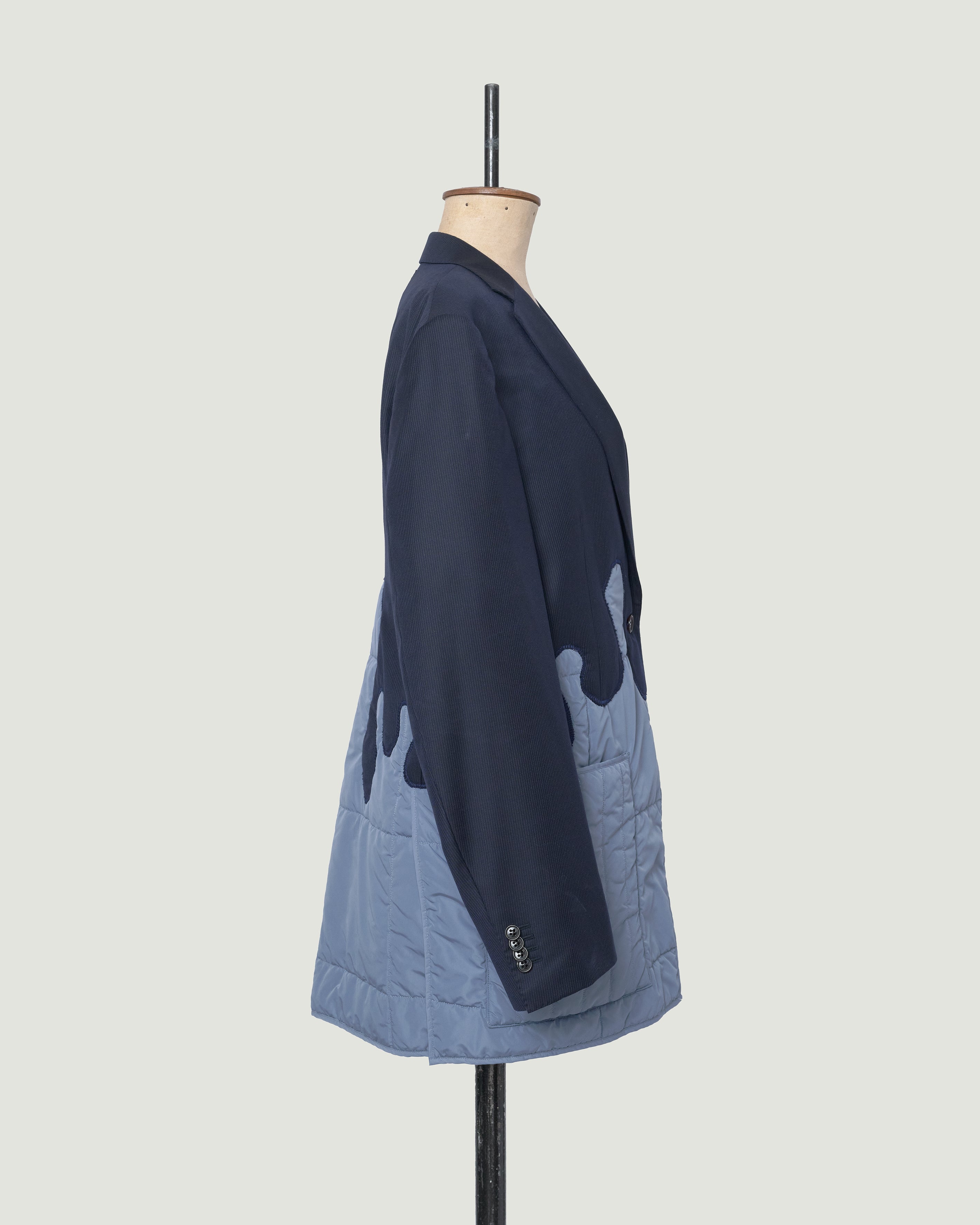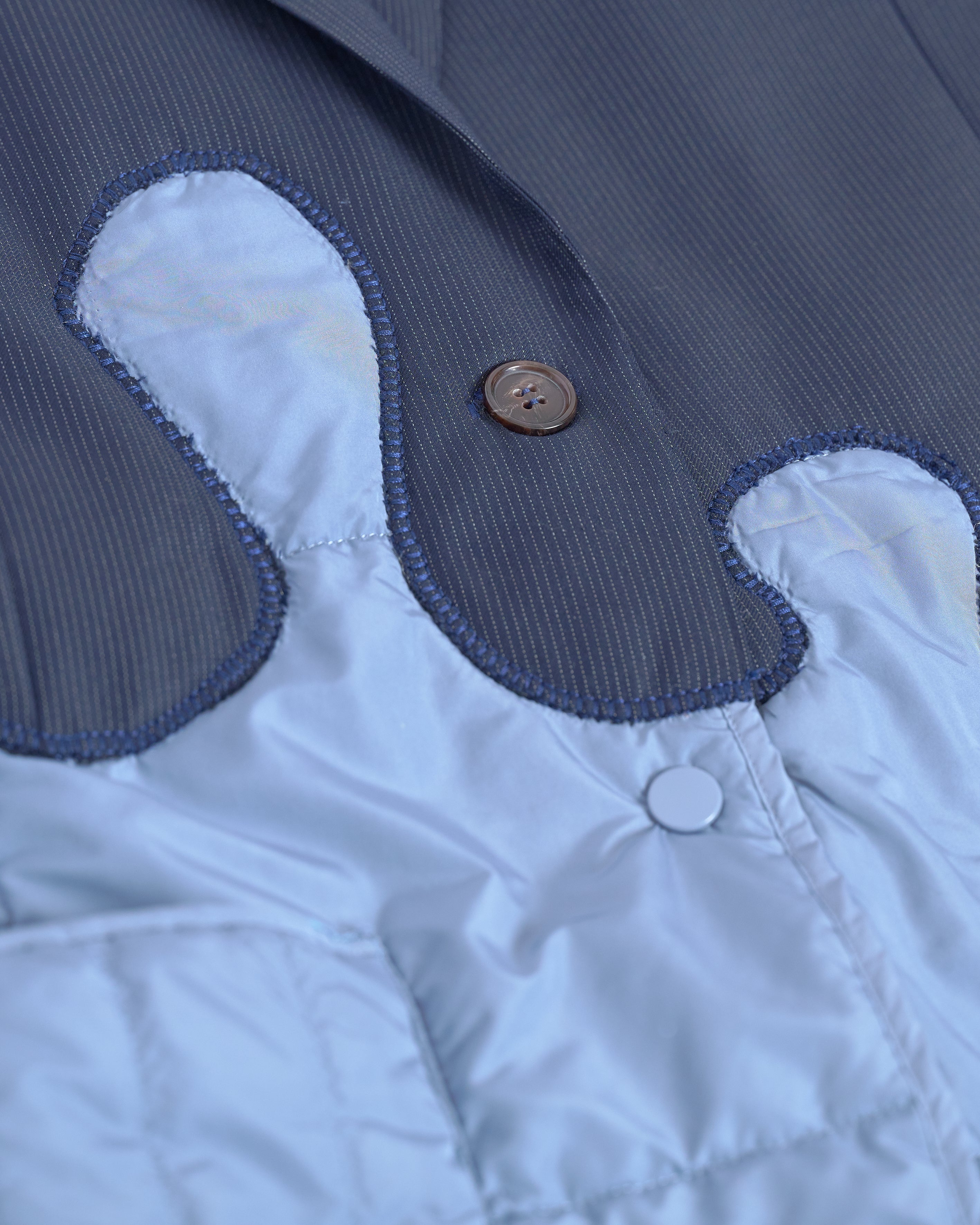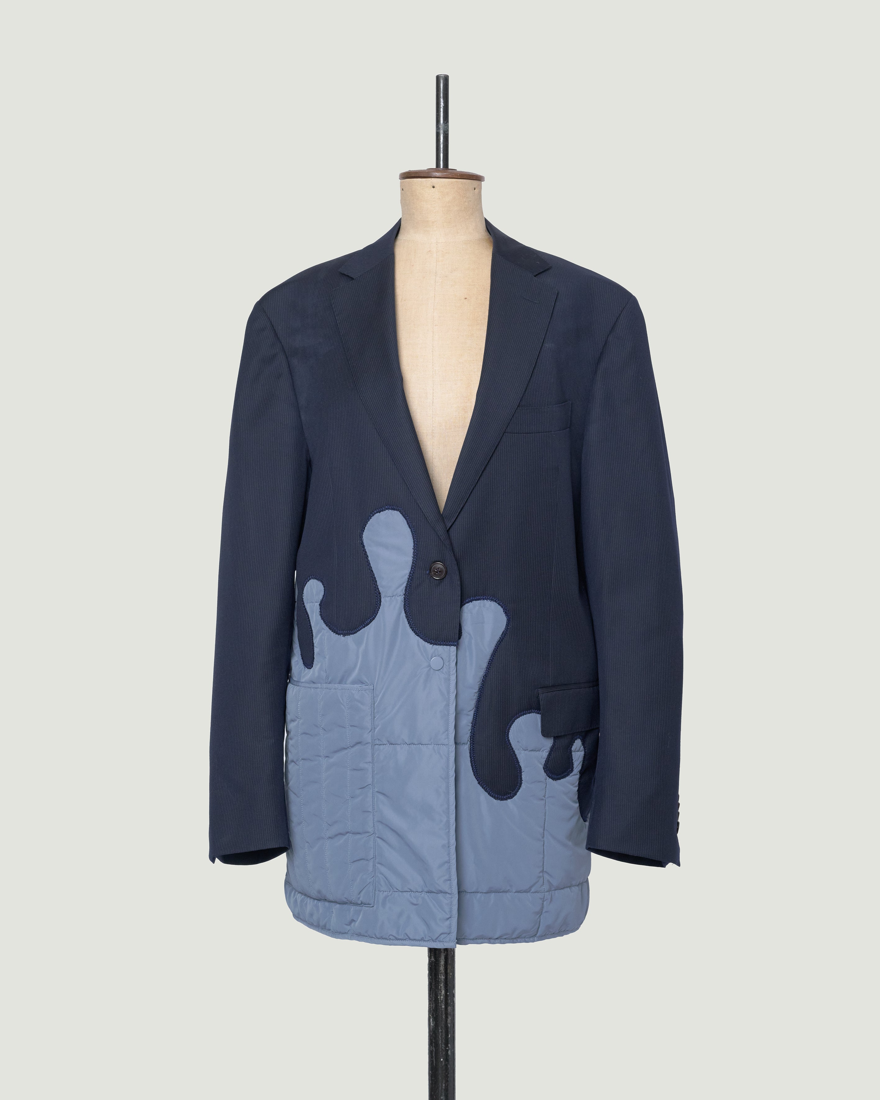 SPLASH is een samengesteld design uit een gedumpte donkerblauwe jas van puur wol in fijne krijtstreep, en een nooit-meer-gedragen lichtblauwe bodywarmer. De jas heeft een asymmetrisch golvend patroon middels een borduur techniek. Hij heeft een stoere opgestikte zak, valt lekker luchtig en je sluit hem door zowel een gewone knoop als een drukknoop. Deze blazer draag je passend als oversized.
