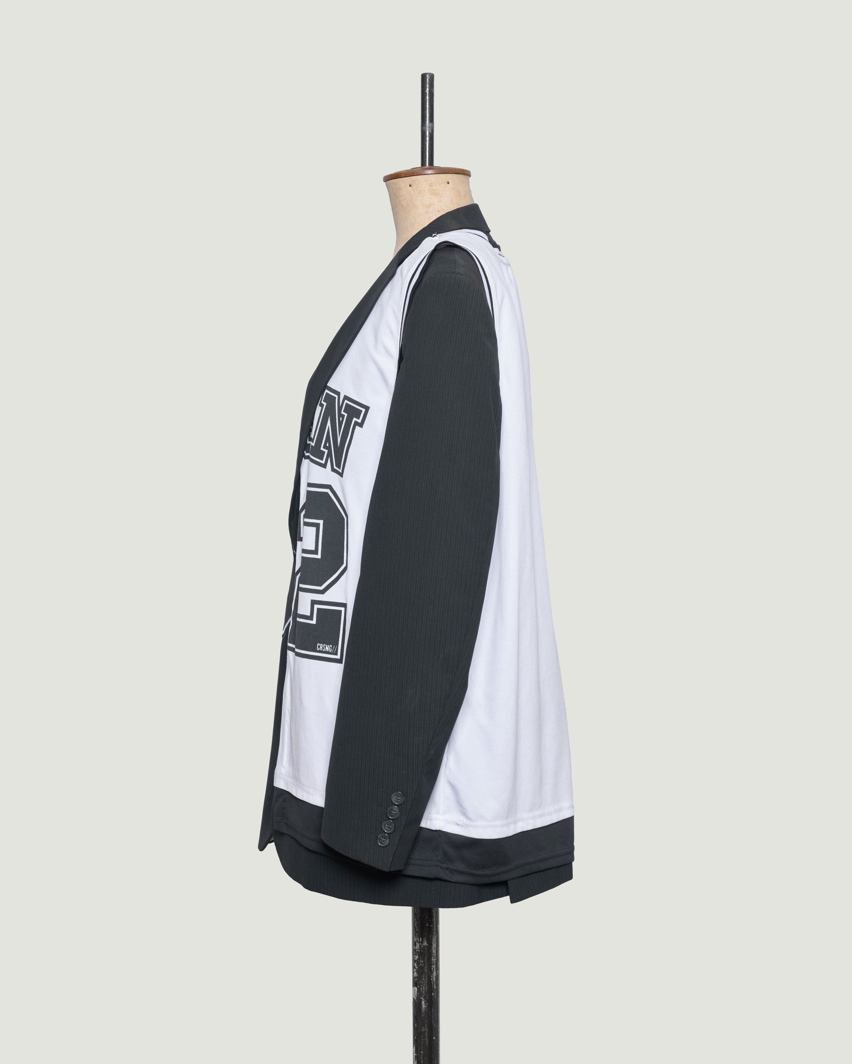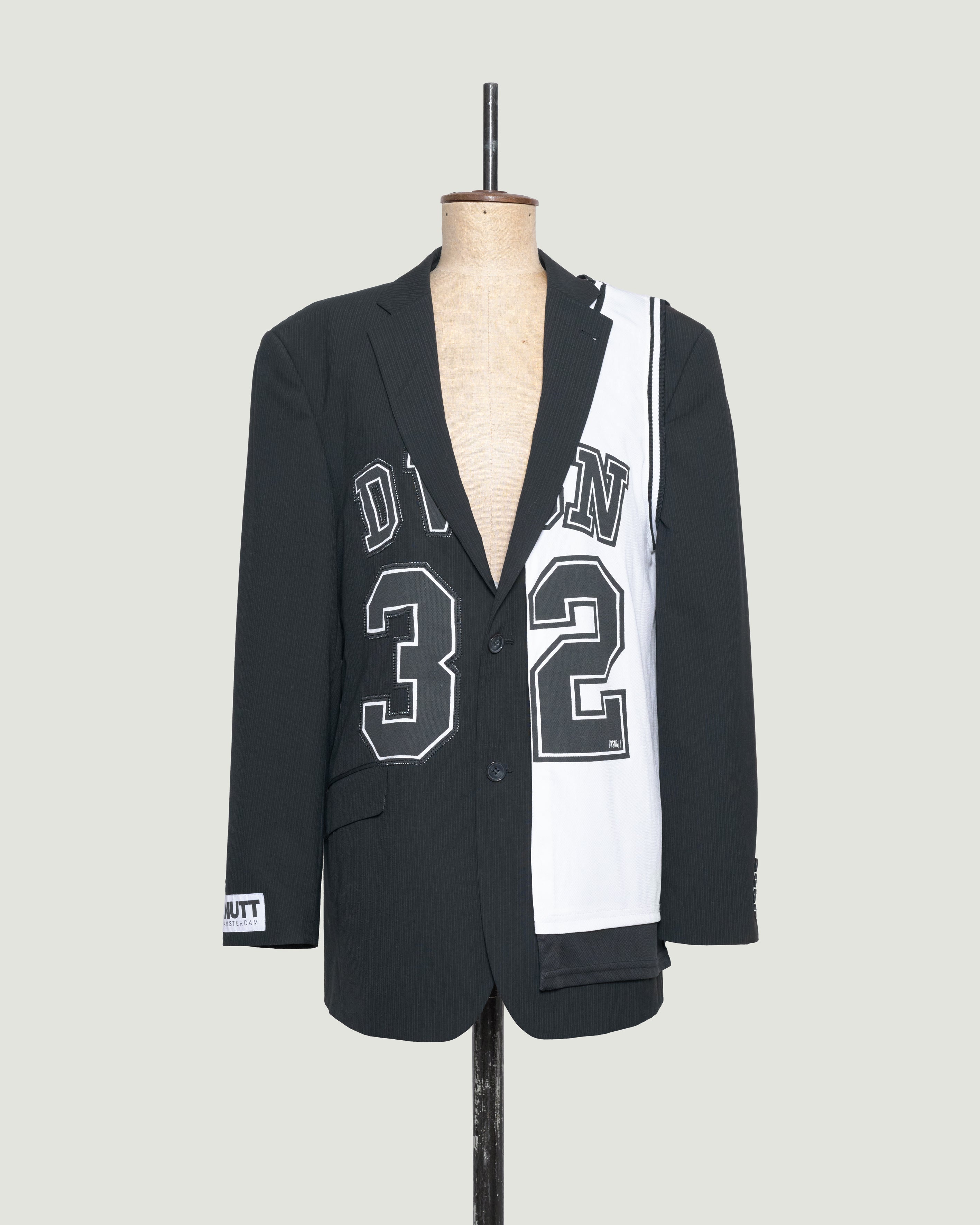 THIRTY TWO is een samengesteld design uit een zwarte afgedankte blazer en een nooit-meer-gedragen zwart-wit sportshirt. De blazer heeft een dynamische vlakverdeling op de rug en het front. De opgestikte cijfers en letters geven de blazer een sportieve look. Je draagt hem chic of casual, hij is passend of oversized en is voor iedereen.