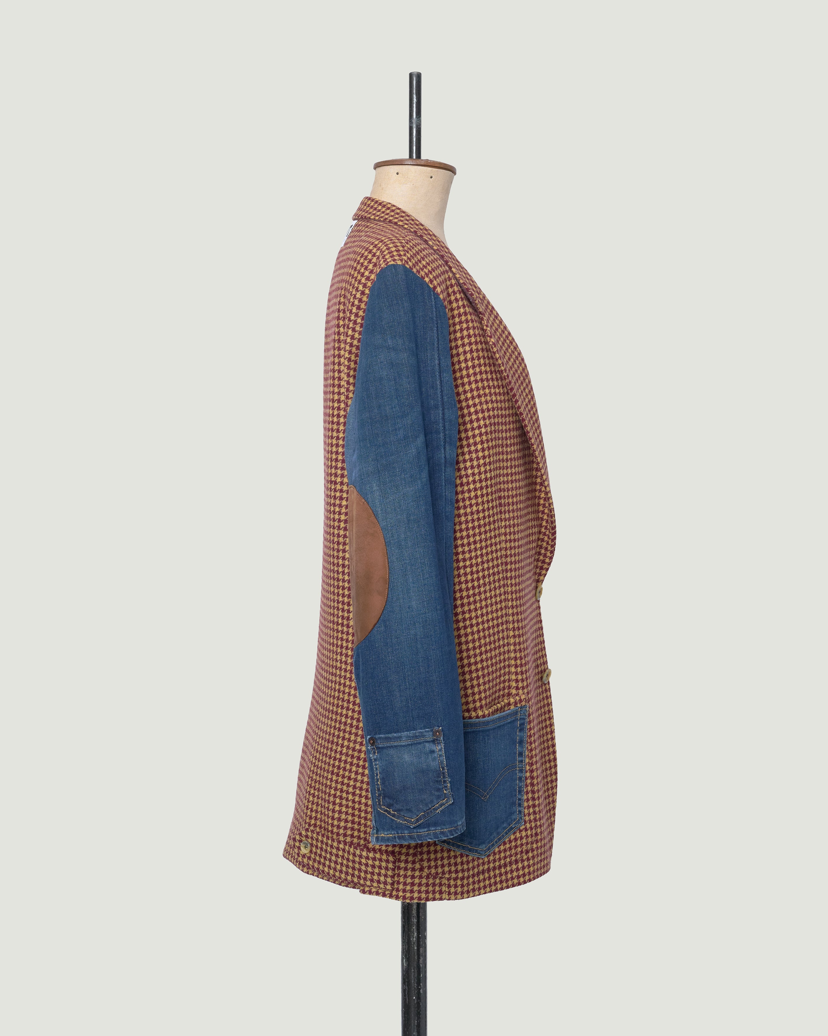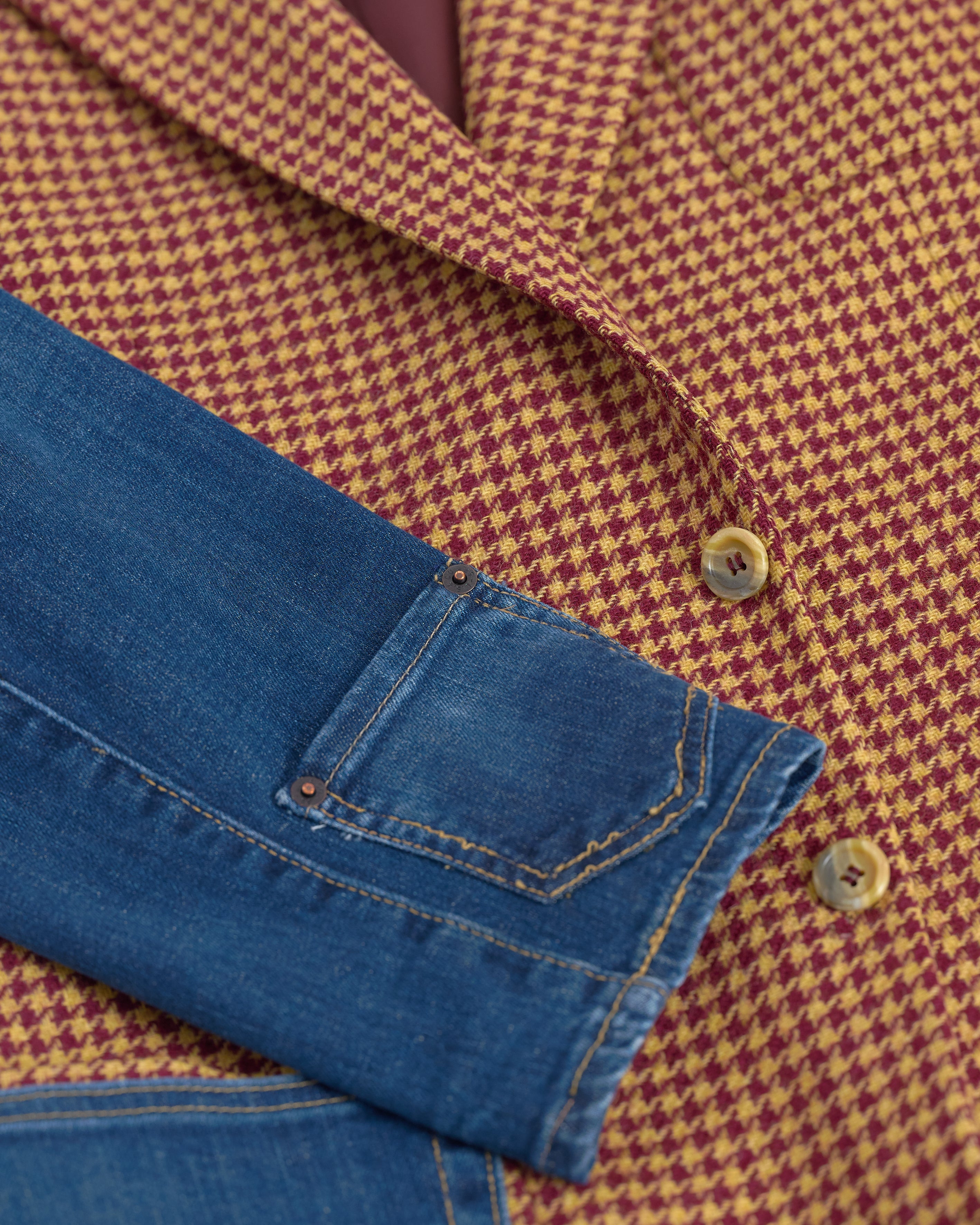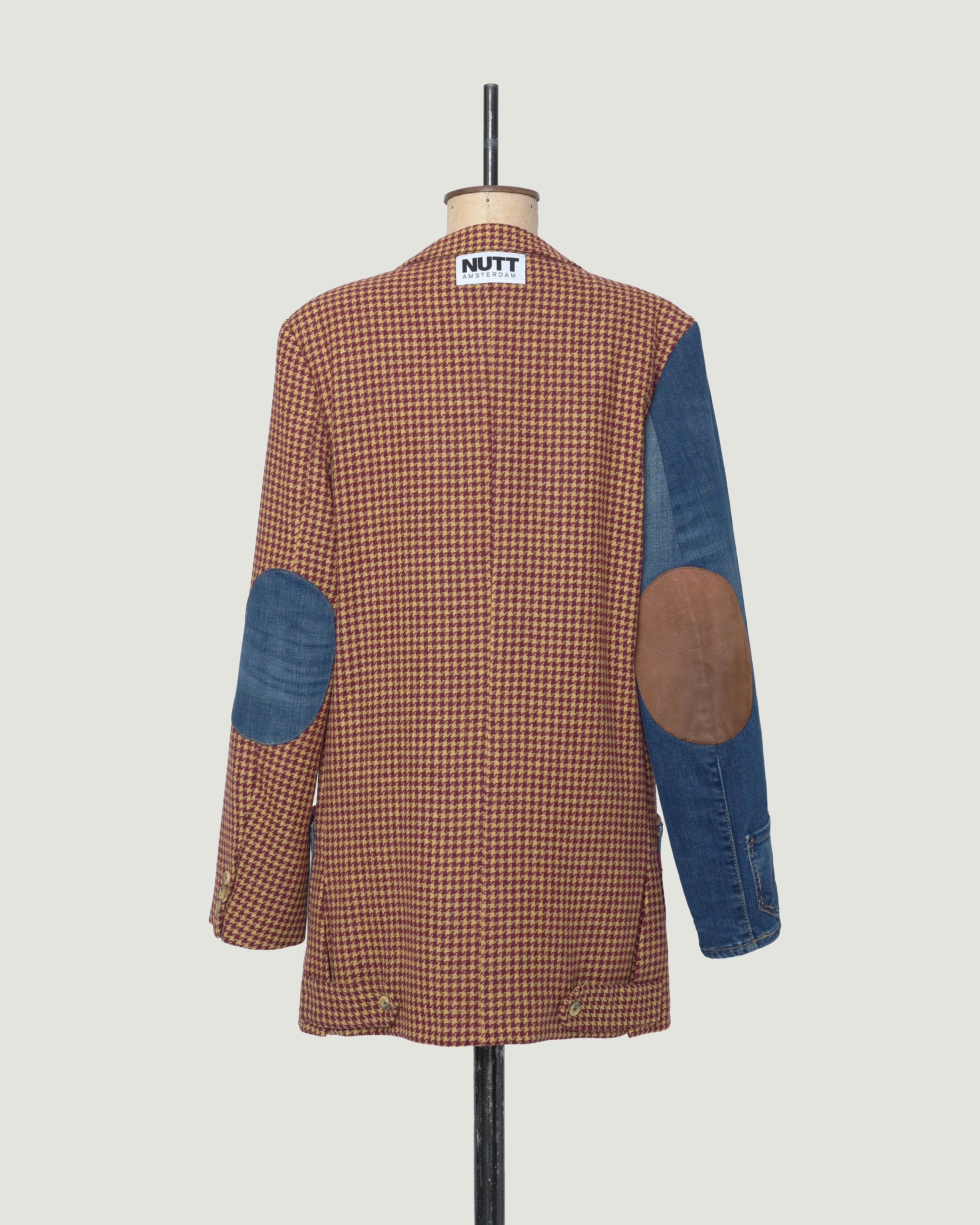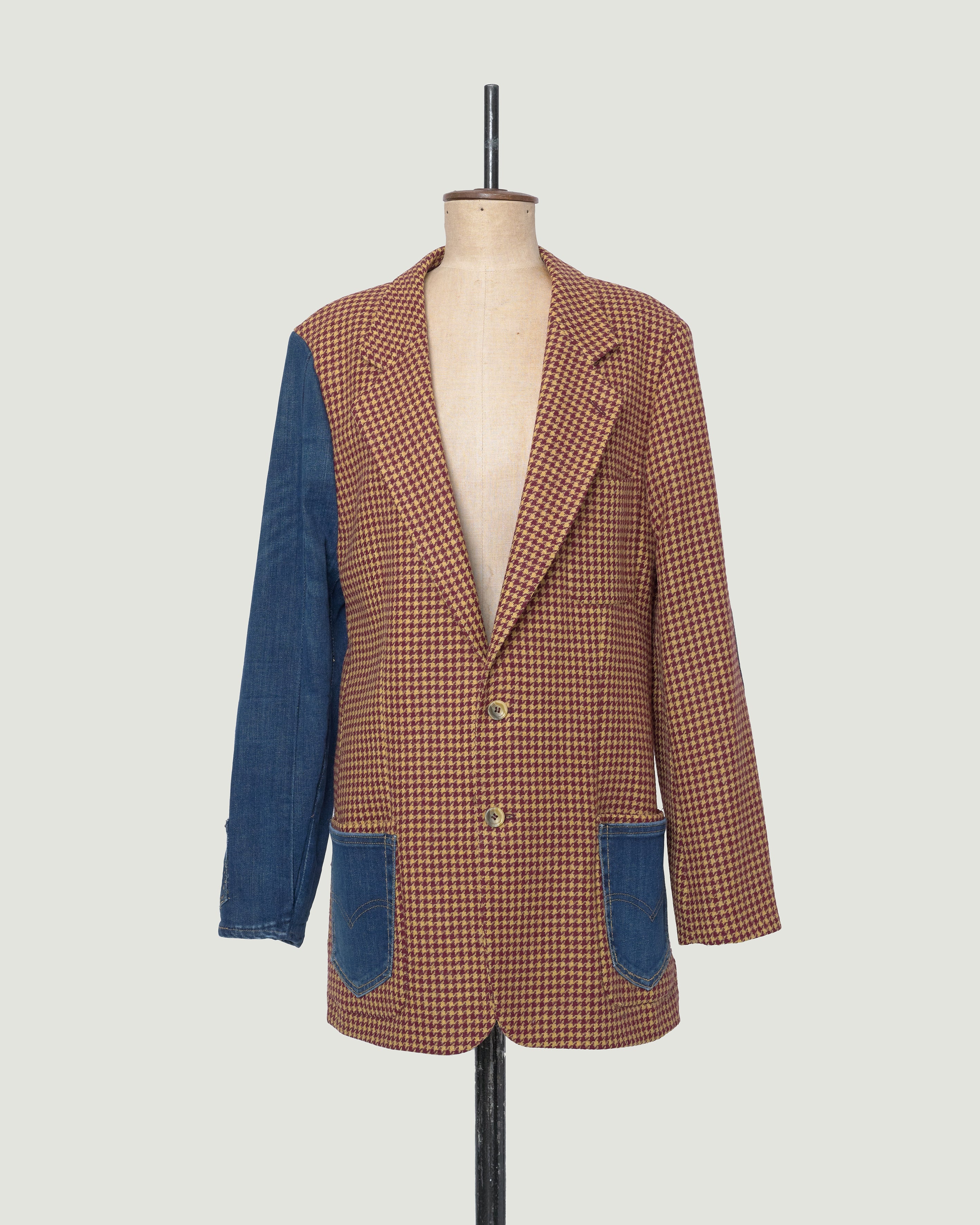 TWIGGY is een samengesteld design uit een nooit-meer-gedragen pied-de-poules wollen jasje en een donkerblauwe washed jeans. De blazer heeft twee verschillende elleboog patches en opgestikte zakken. Samen met de vastzittende gespjes achter op heup geeft het de blazer een eigenwijze snit én look. De jas valt vrij recht, zit passend en valt tot over de heup.